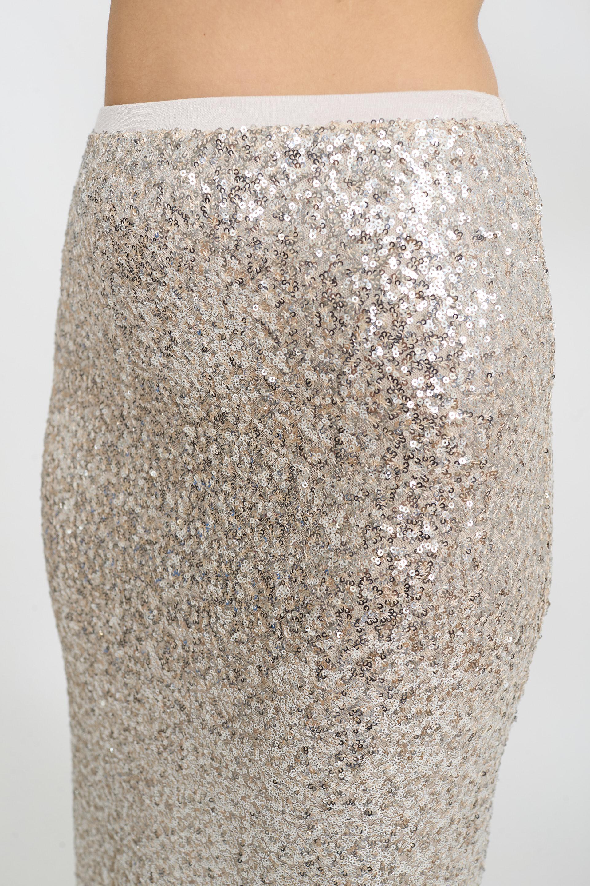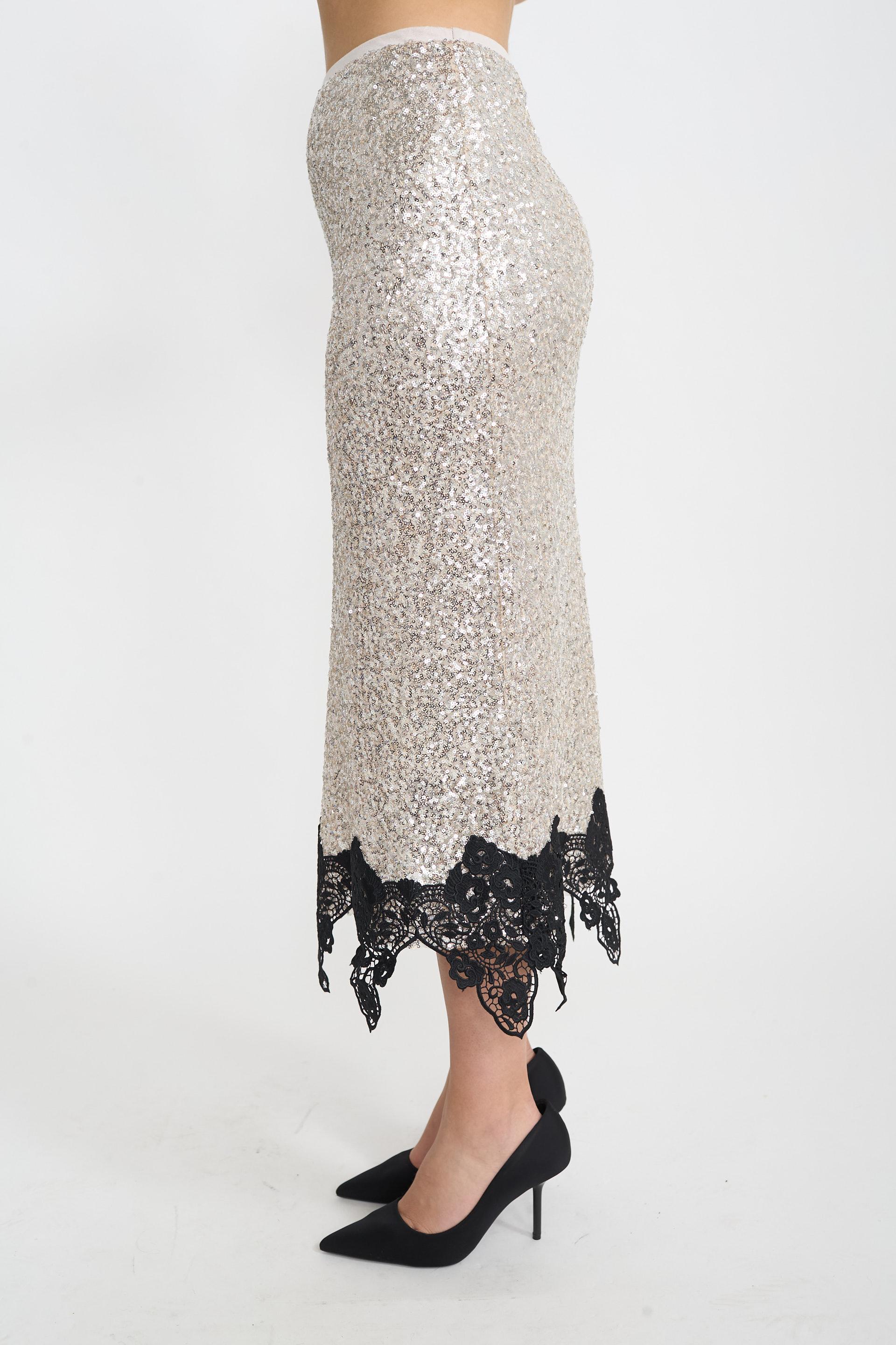 | Gonna in paillettes con elastico in vita. Dettaglio di fascia in pizzo in orlo. Fodera interna. | ||
