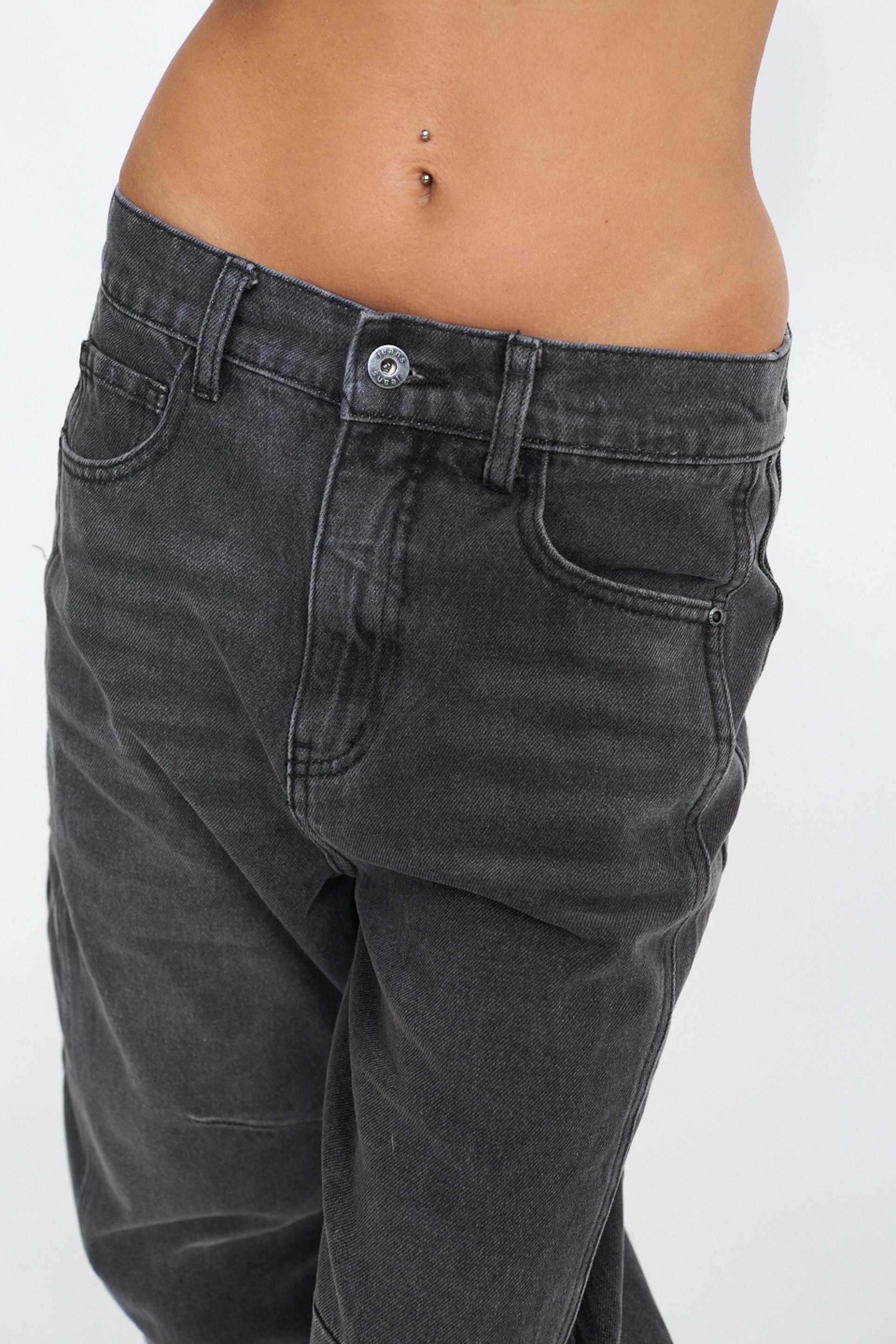 | Jeans modello barrel con doppie cuciture al ginocchio ed elastico in vita. Chiusura tramite cerniera e bottone. | ||