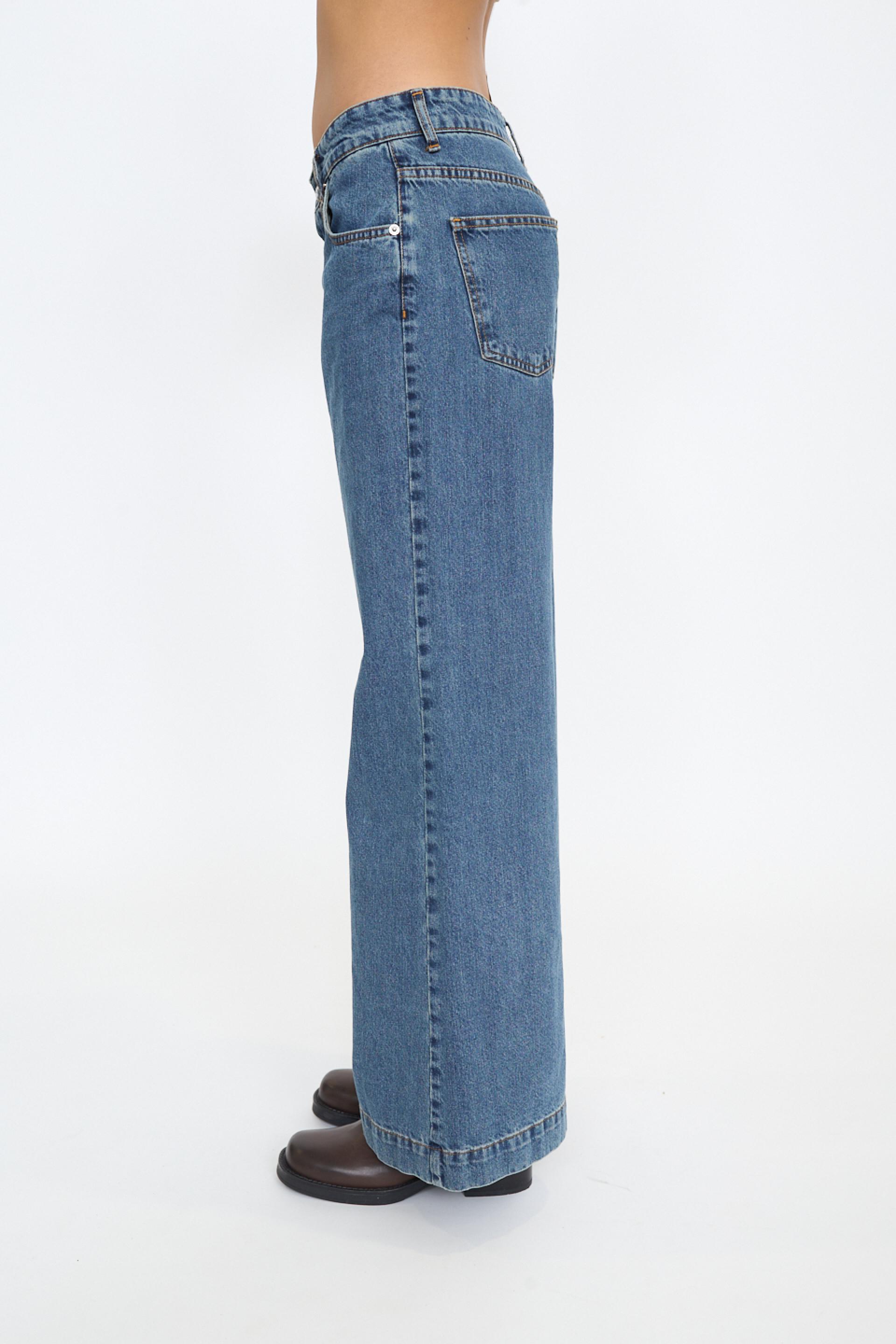 | Jeans wide-leg in cotone lavaggio the con targhetta posteriore in cuoio loggata. Passanti in vita e chiusura tramite bottone metallico loggato. | ||