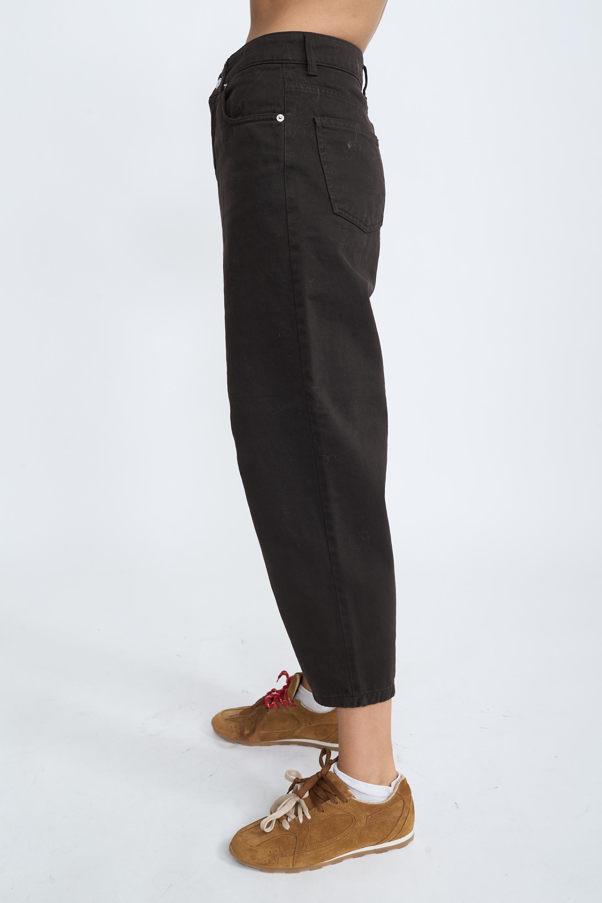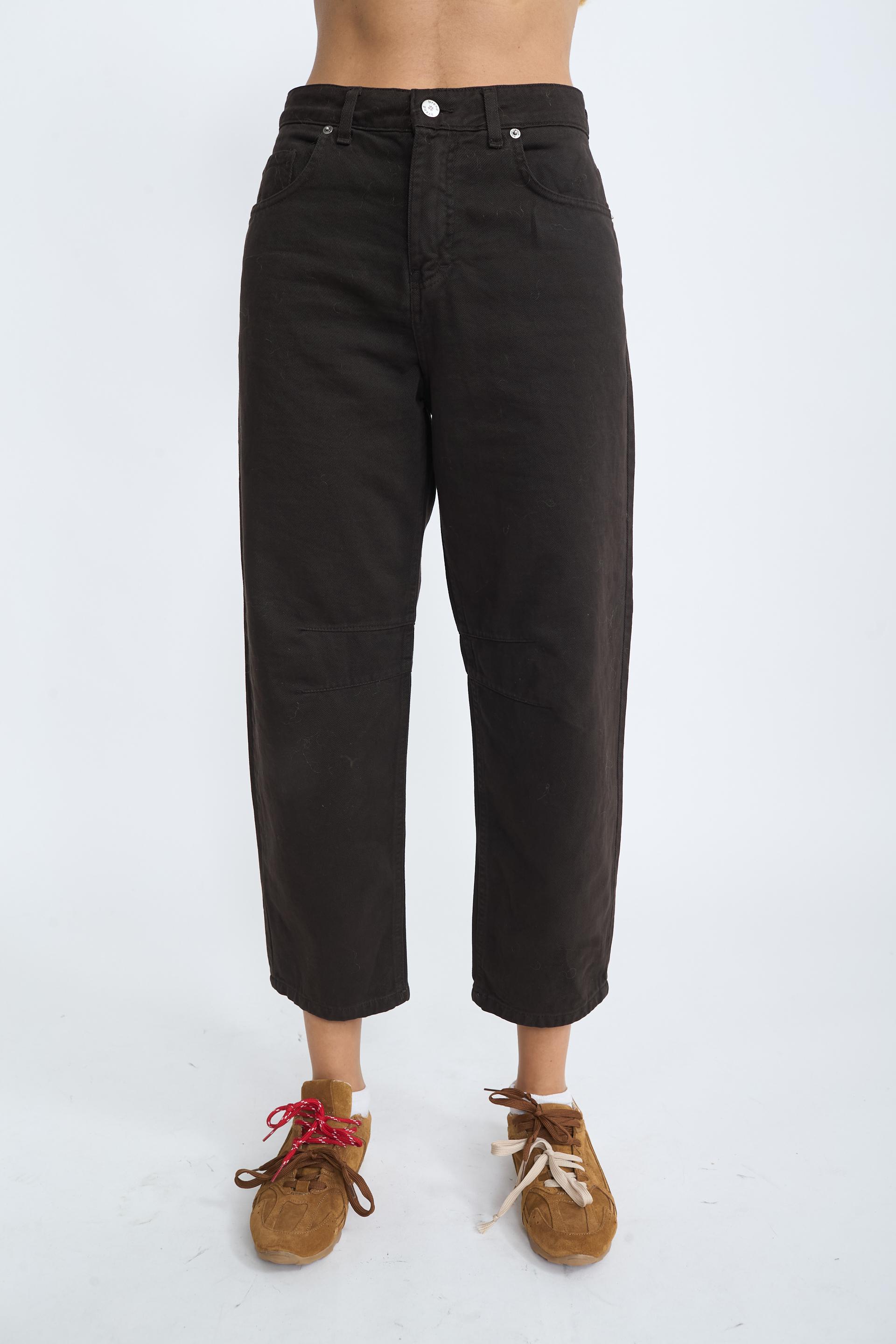 Jeans barrel in cotone tinta unita con doppie cuciture al ginocchio. Chiusura tramite cerniera e bottone metallico loggato. | ||