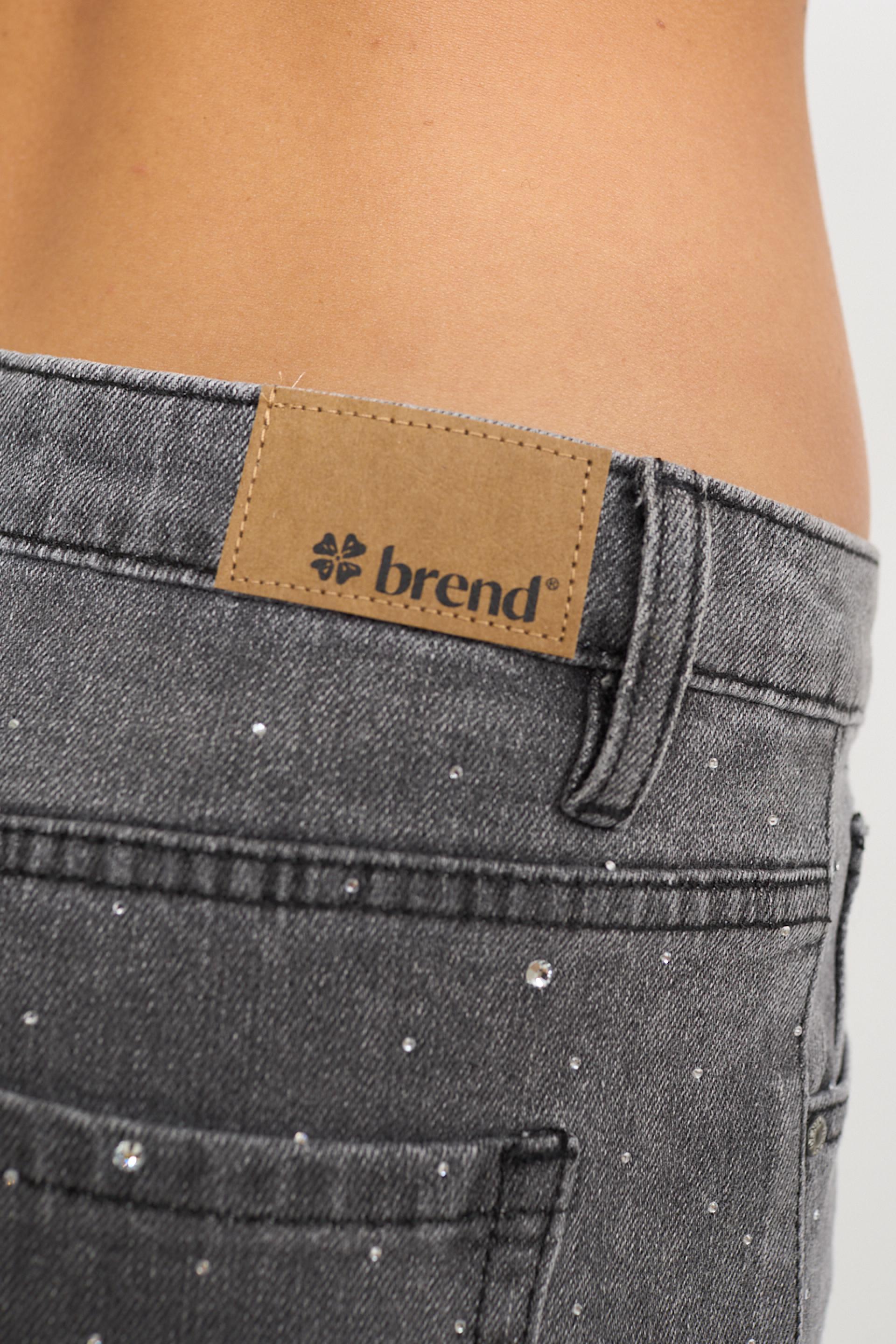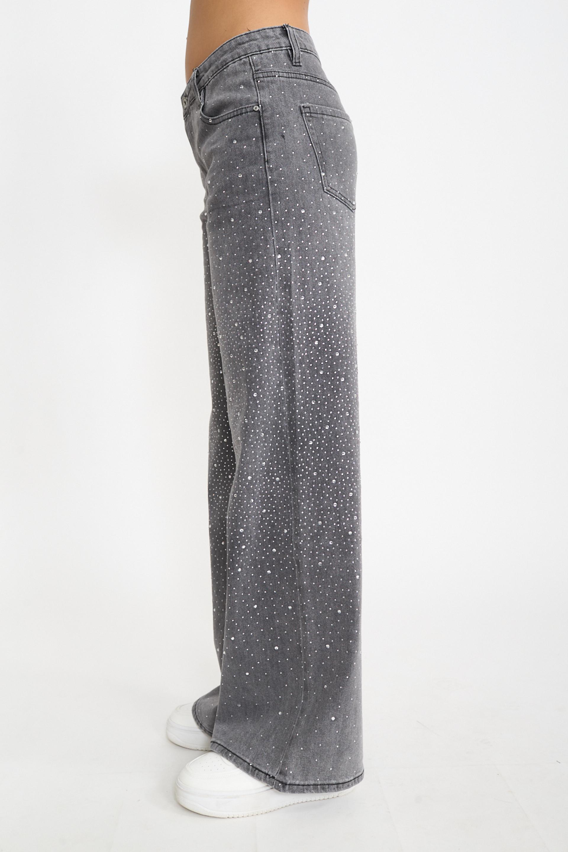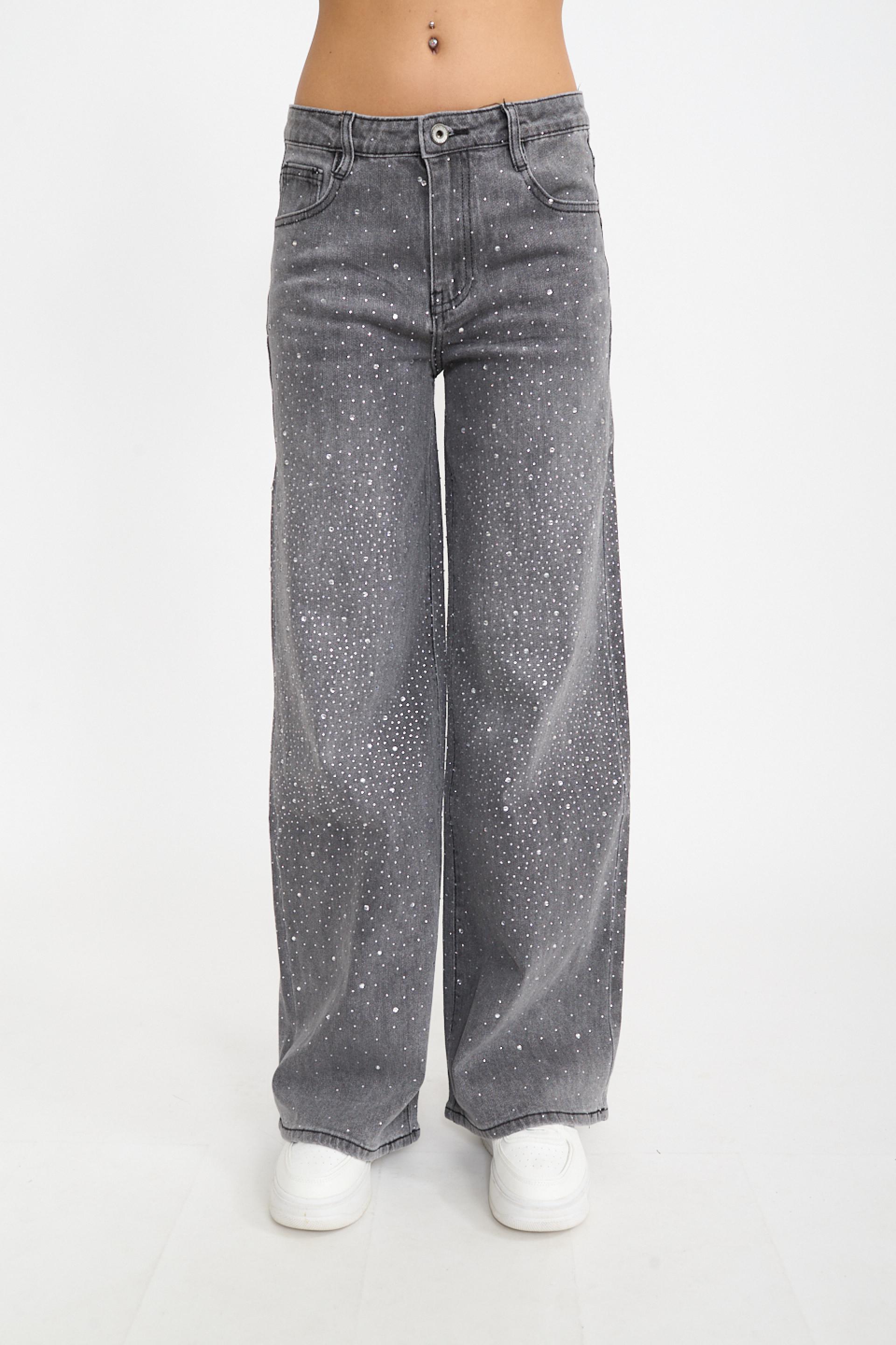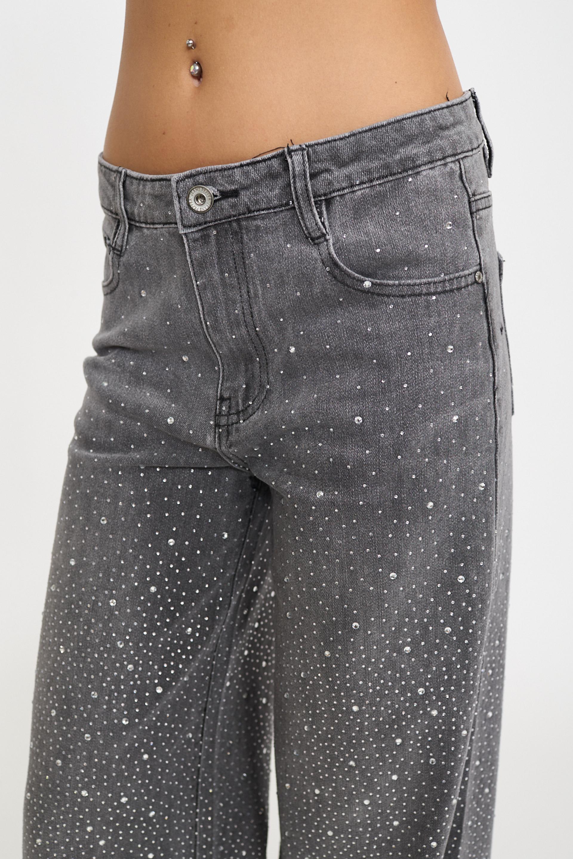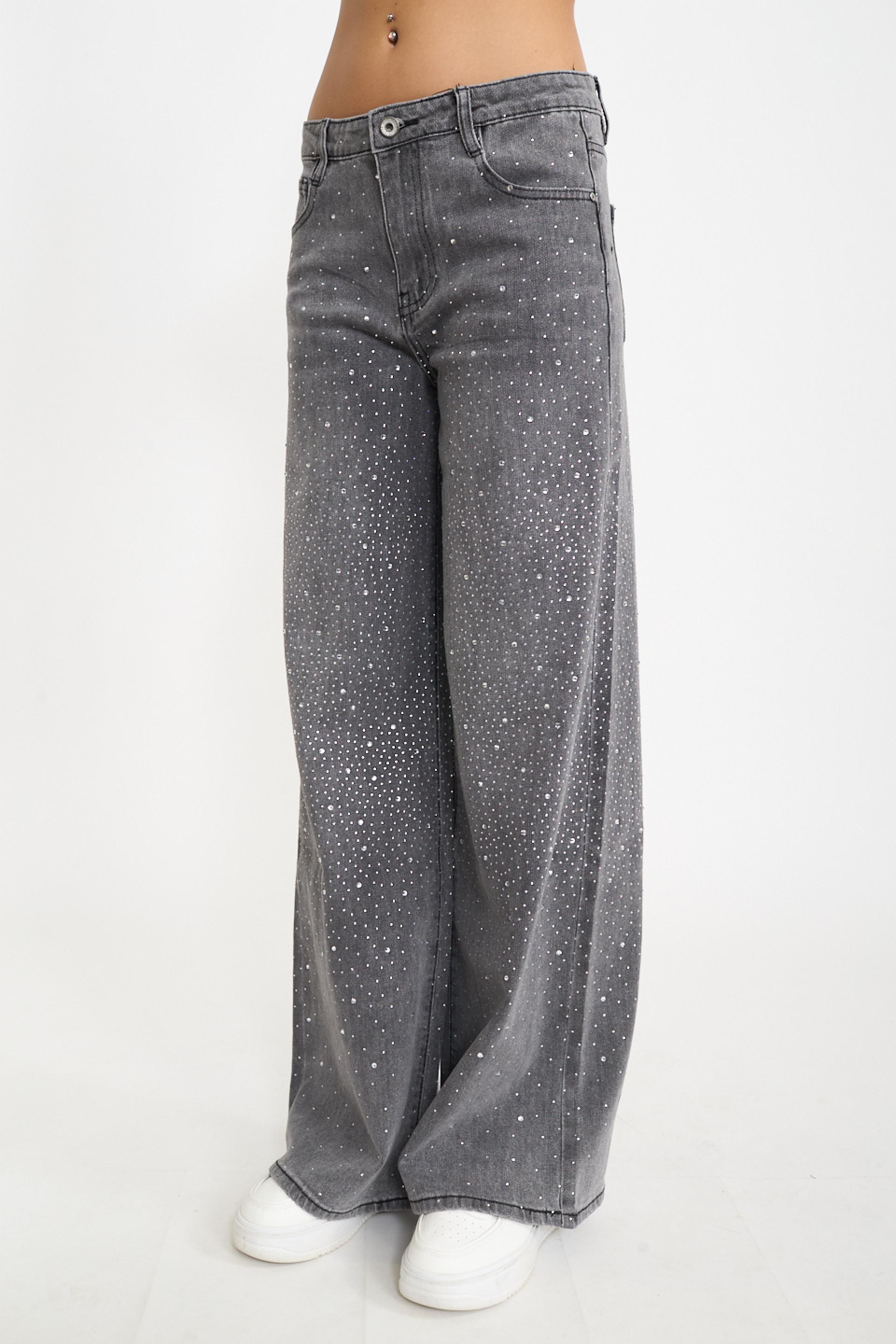 | Jeans wide-leg 5 tasche con multistrass applicati. Passanti in vita e targhetta posteriore loggata in cuoio. Chiusura tramite cerniera e bottone metallico. | ||