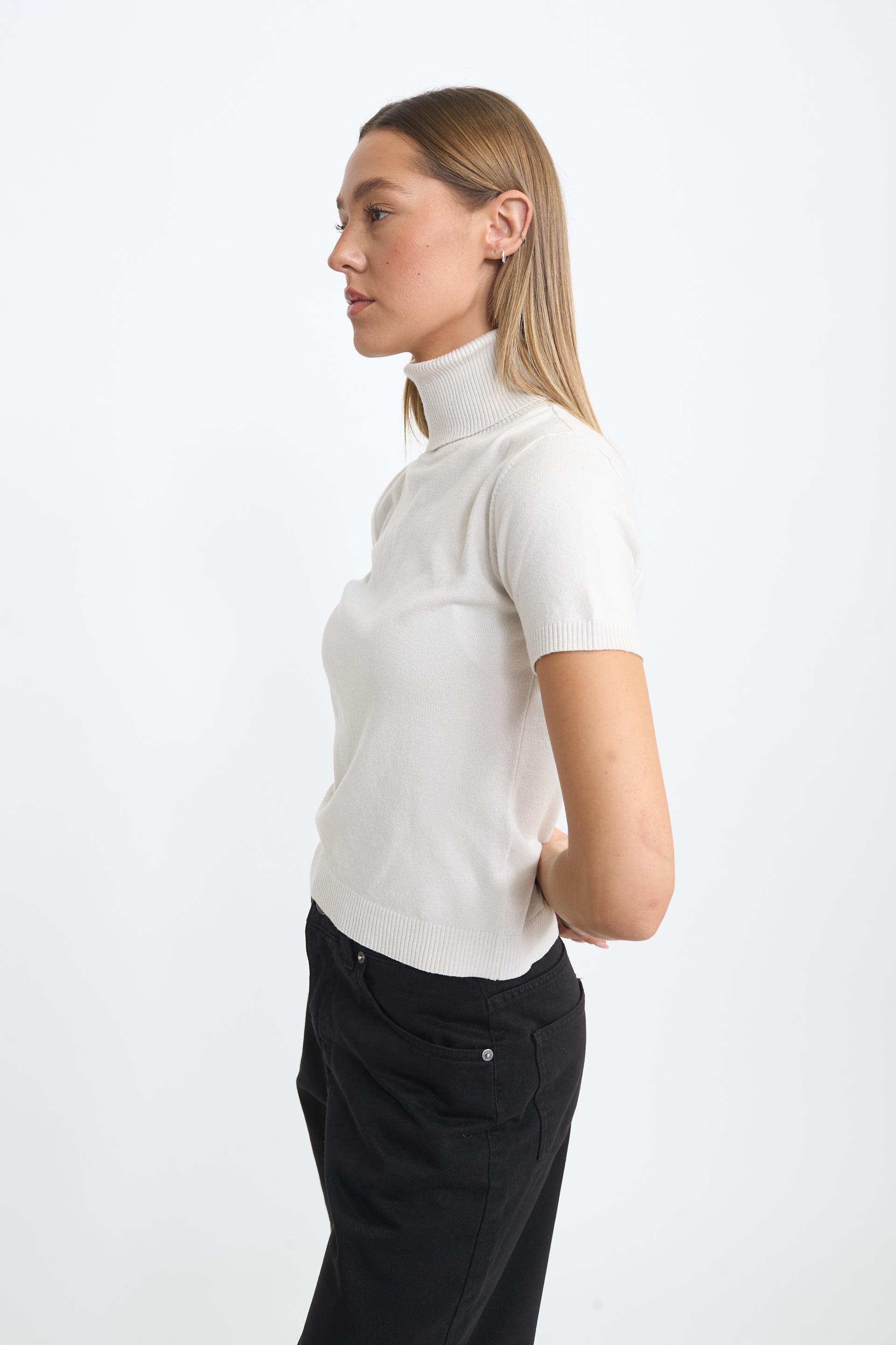 Maglia collo alto in misto viscosa a mezza manica. Dettaglio di lavorazione a costine su collo, orlo e fine manica. | ||