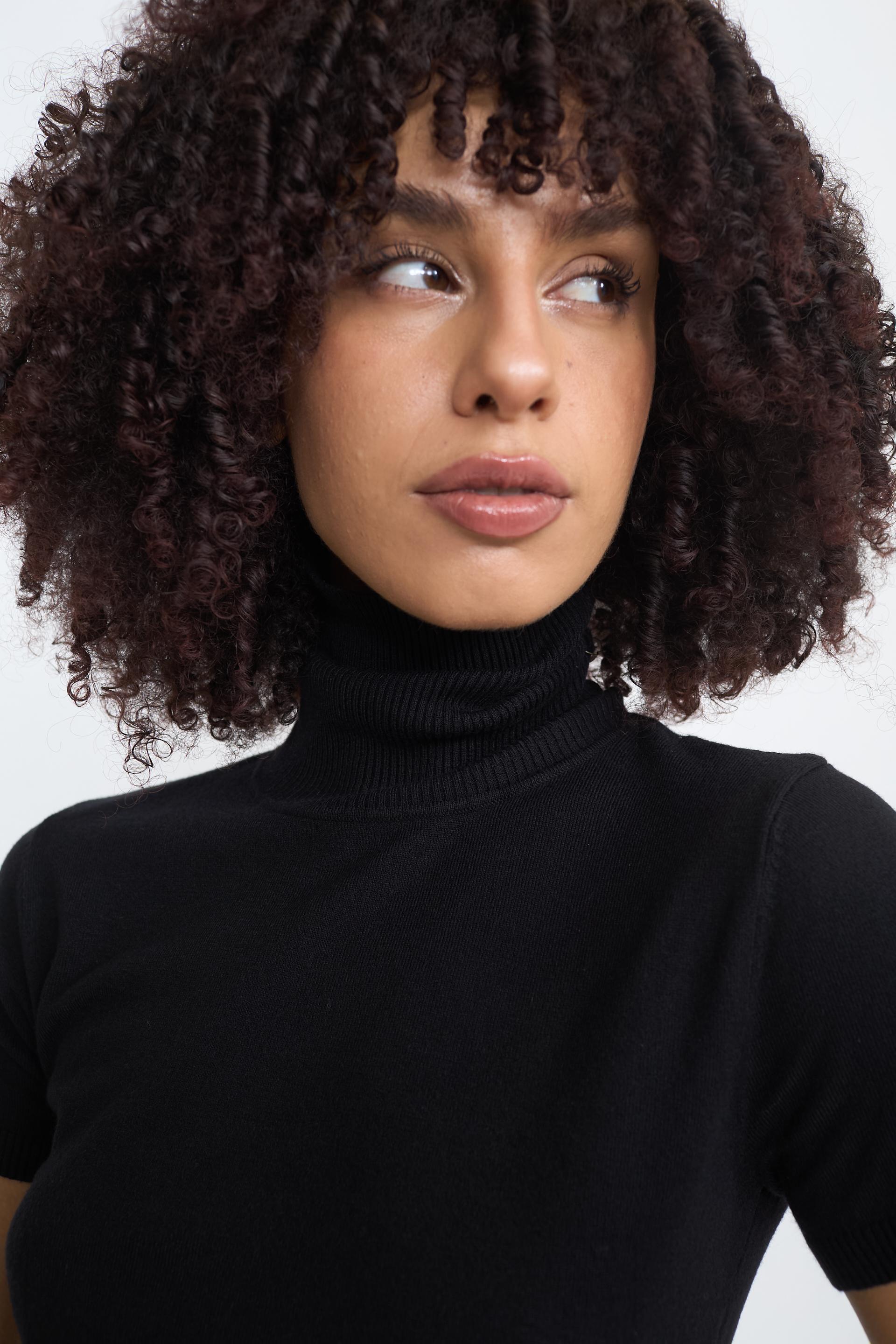 Maglia collo alto in misto viscosa a mezza manica. Dettaglio di lavorazione a costine su collo, orlo e fine manica. | ||