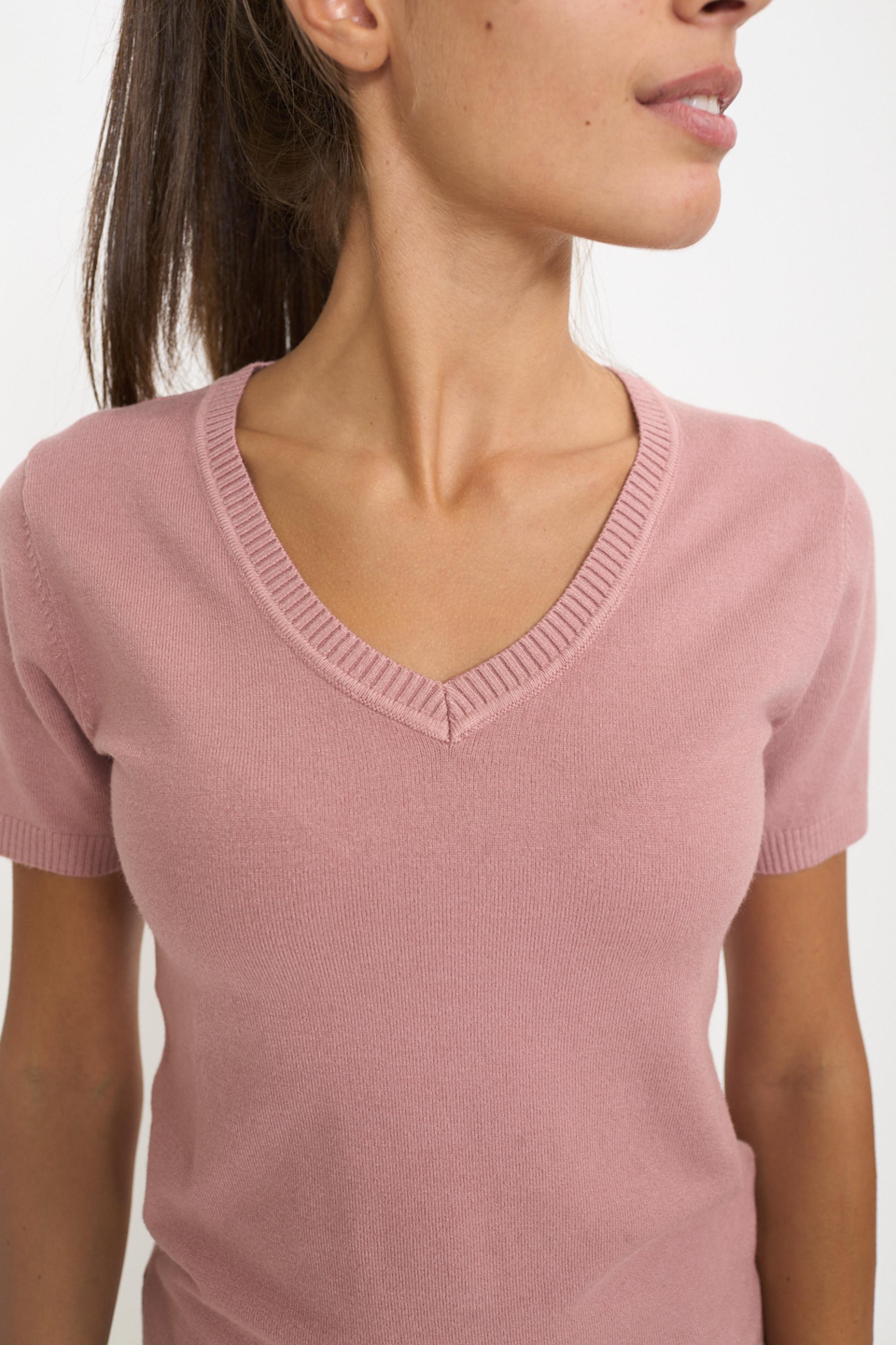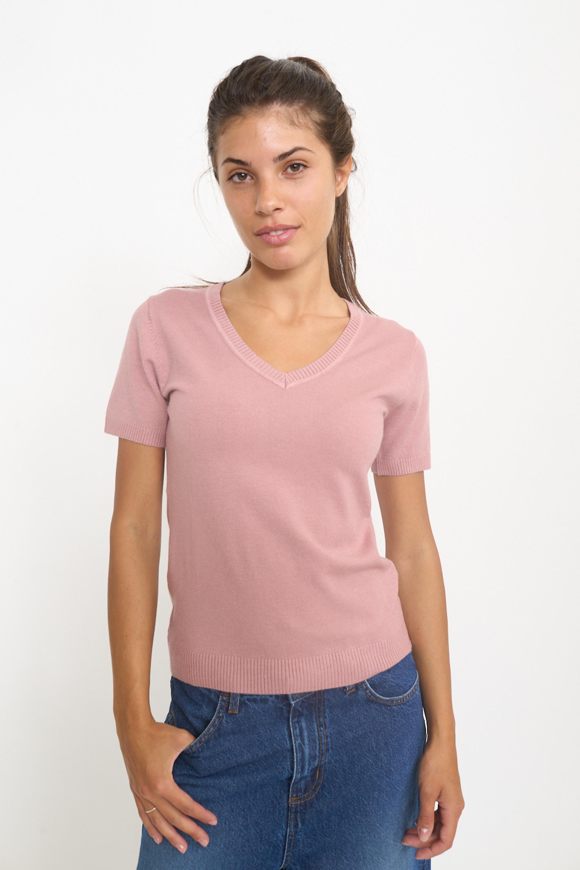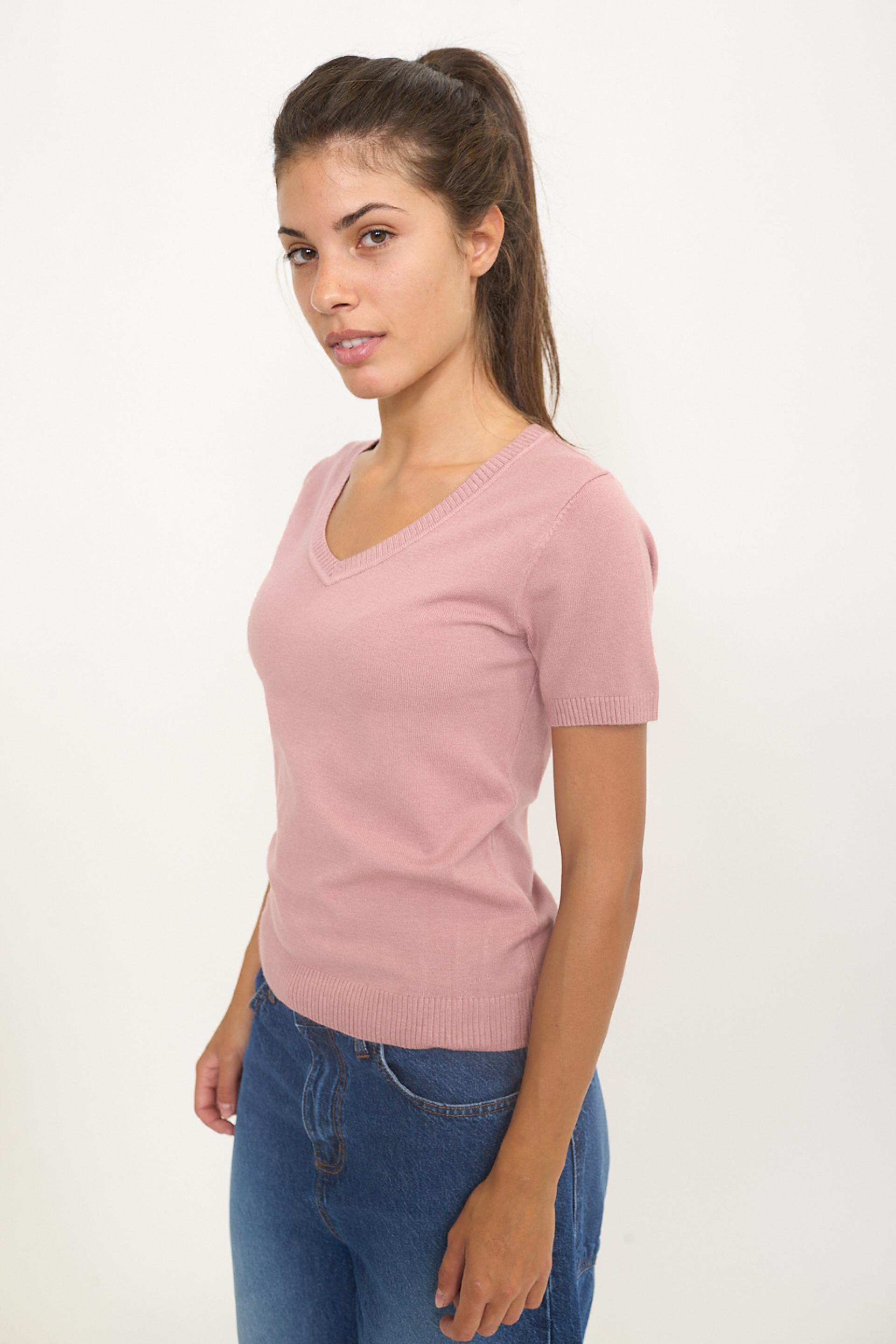 Maglia scollo V a mezza manica in misto viscosa. Dettaglio di lavorazione a costine su scollo, polsini e orlo. | ||