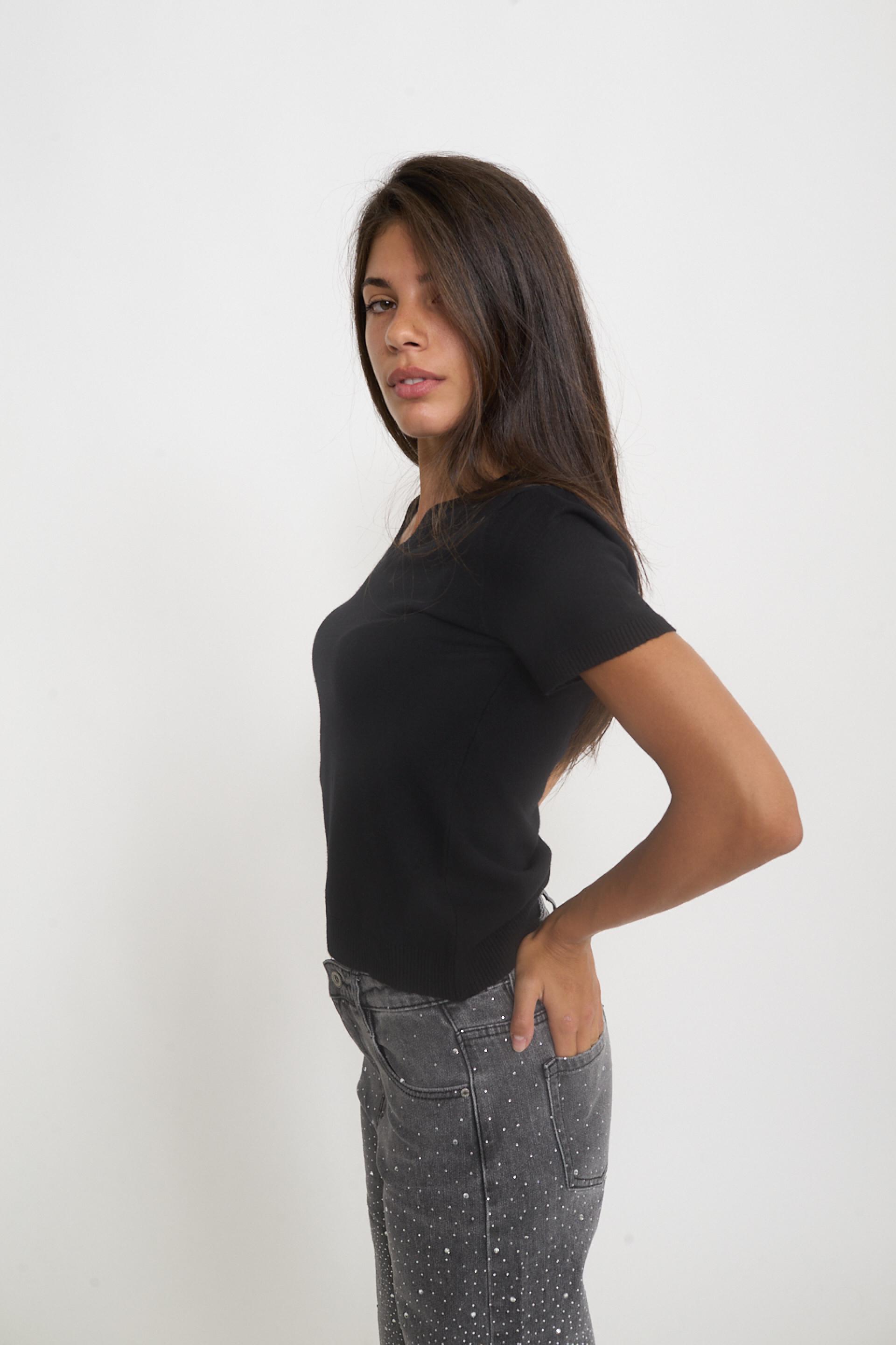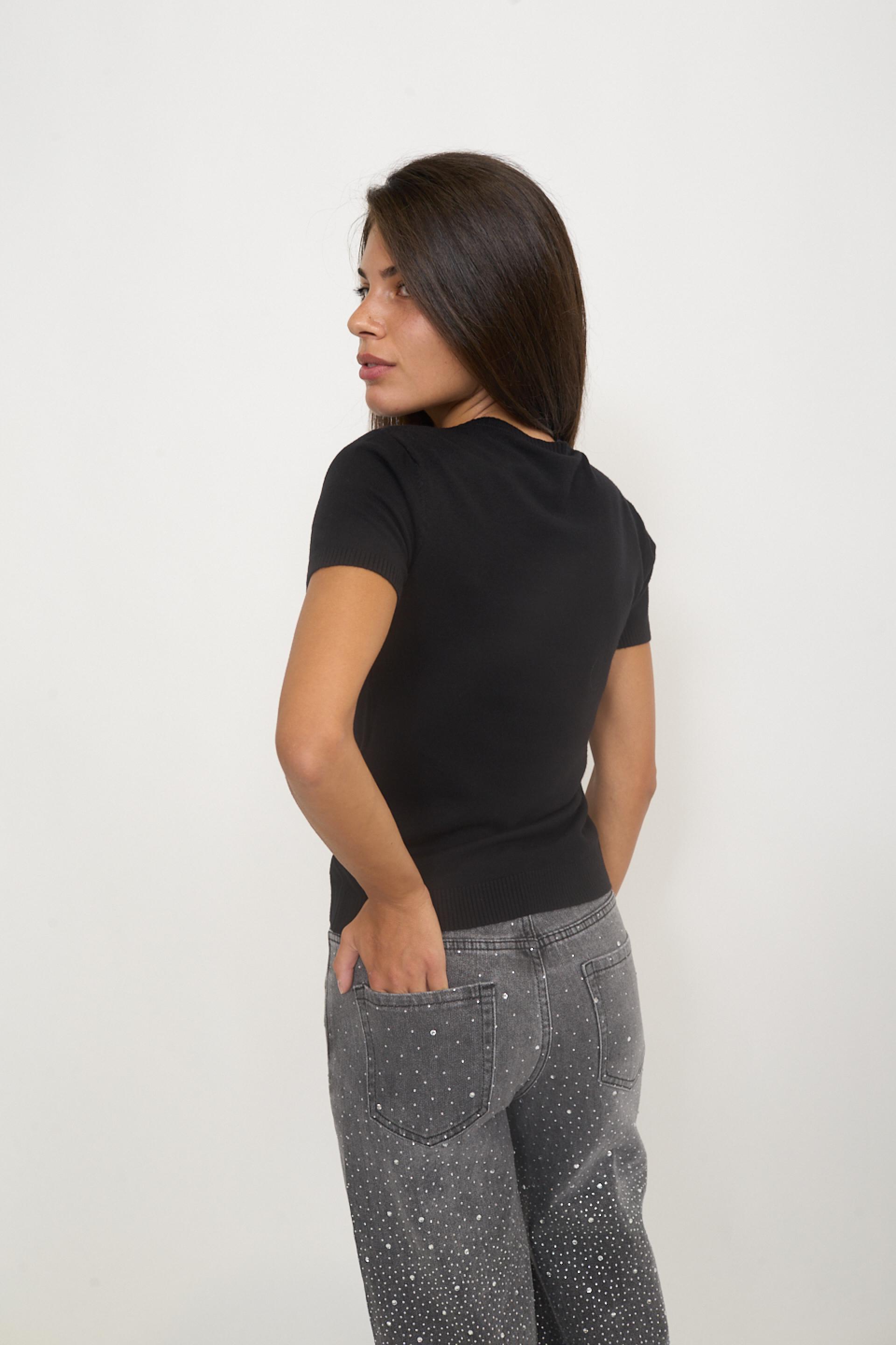 Maglia scollo V a mezza manica in misto viscosa. Dettaglio di lavorazione a costine su scollo, polsini e orlo. | ||