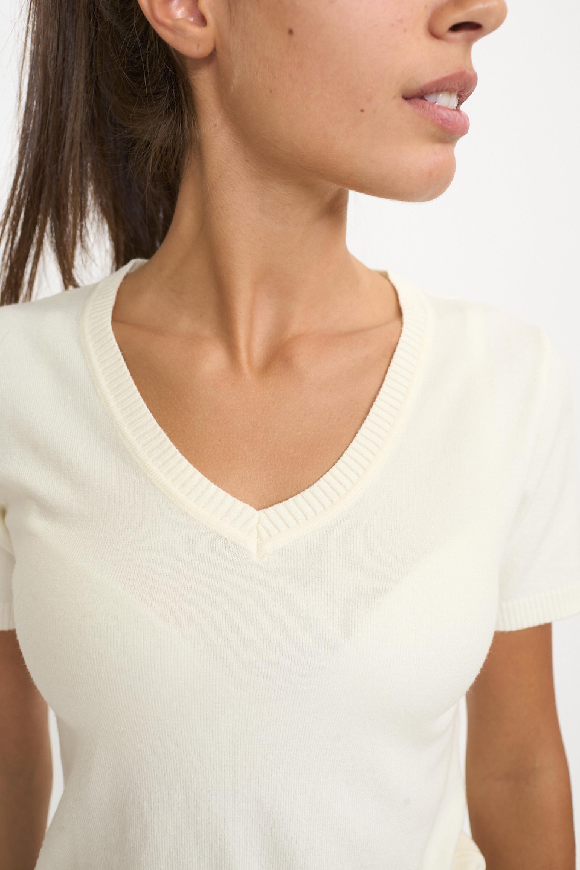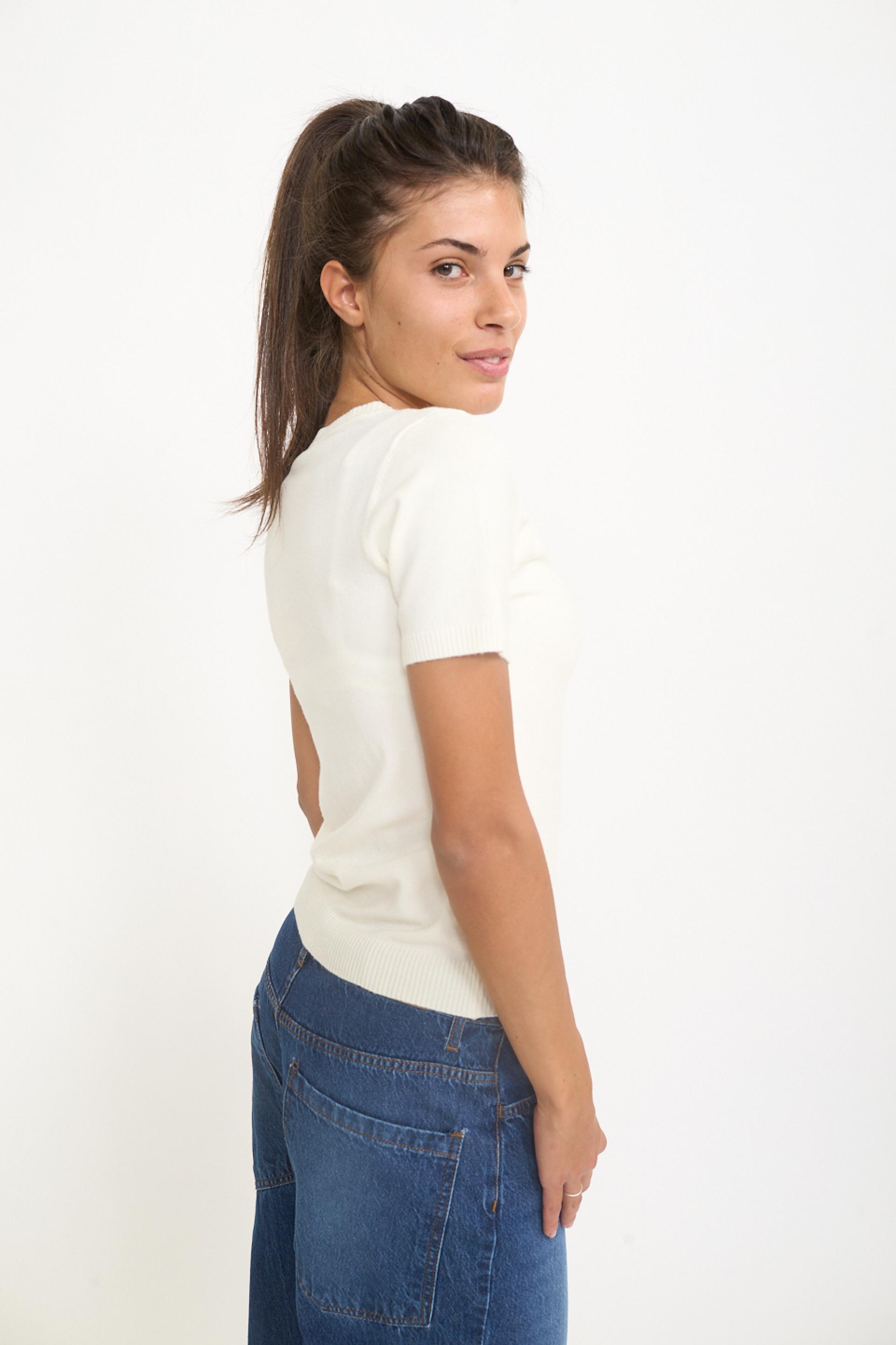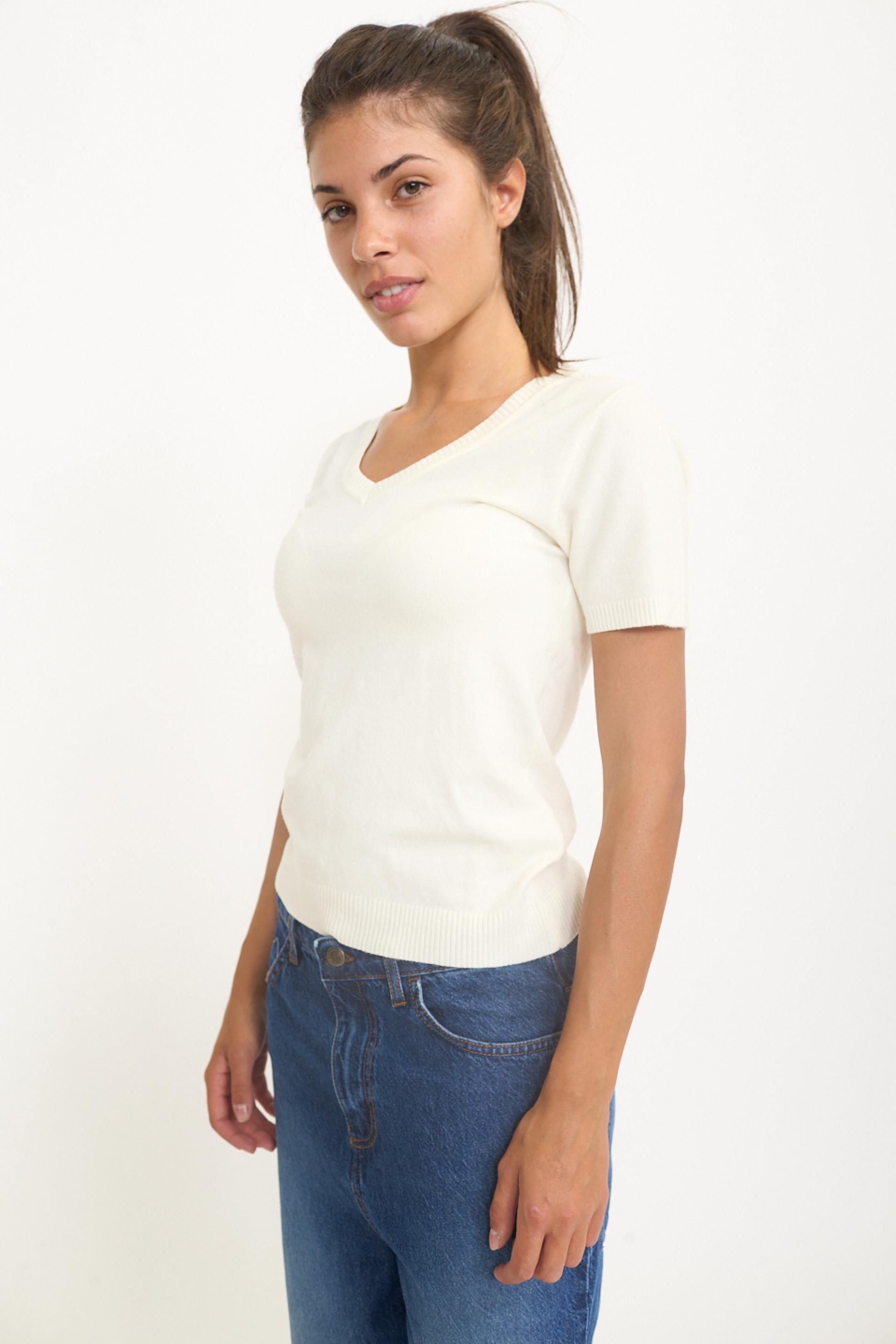 Maglia scollo V a mezza manica in misto viscosa. Dettaglio di lavorazione a costine su scollo, polsini e orlo. | ||