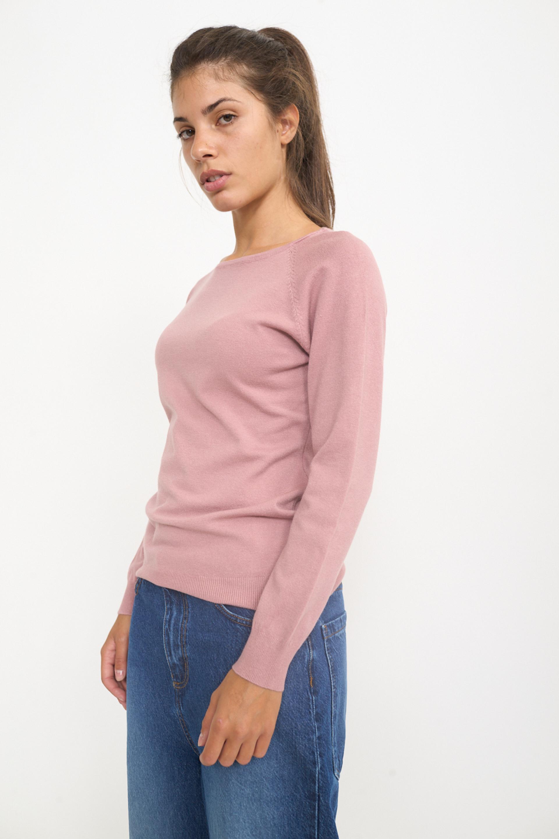 Maglia scollo barca in misto viscosa tinta unita. Dettaglio di lavorazione a coste su polsini e orlo. | ||