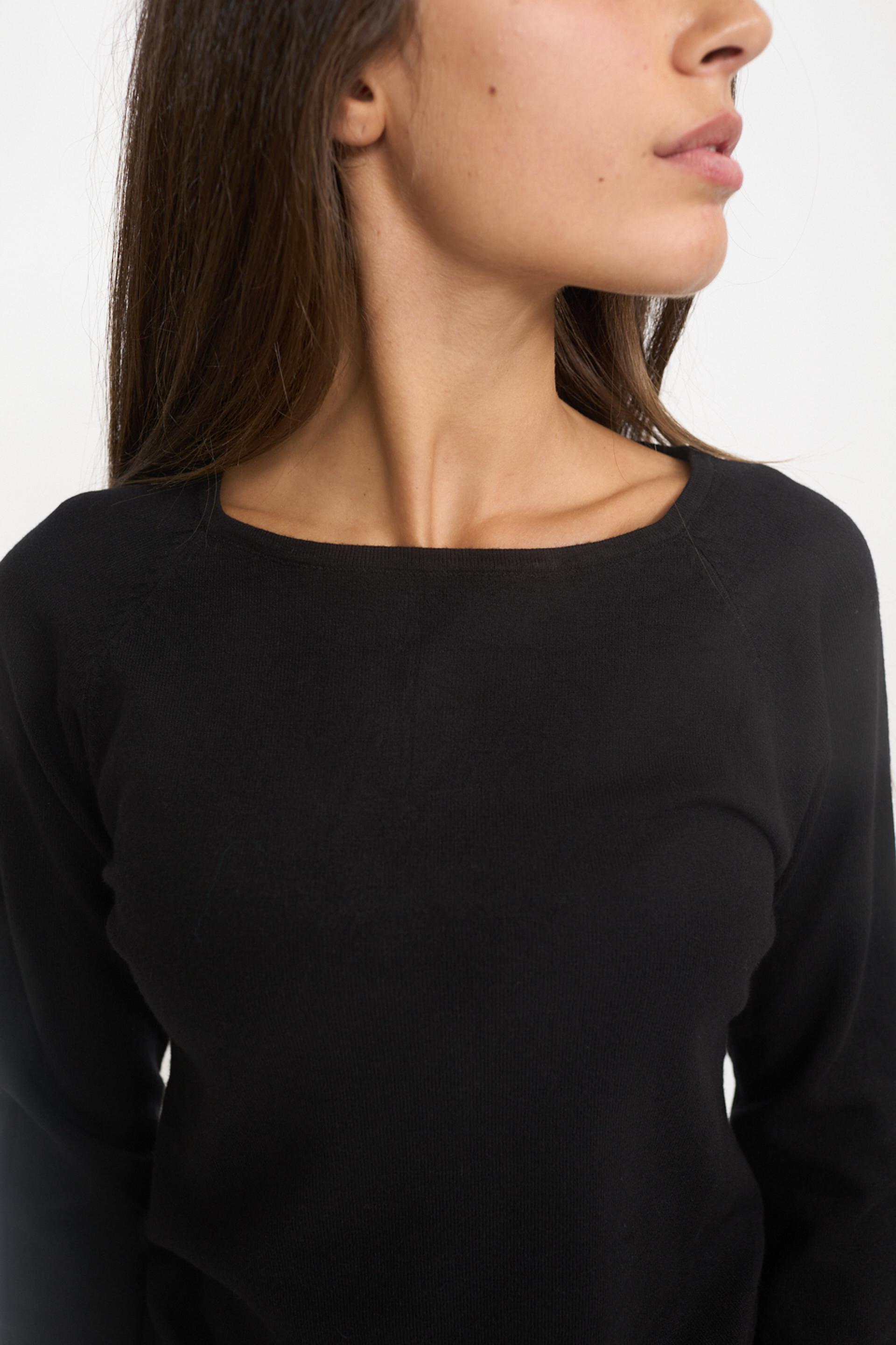 Maglia scollo barca in misto viscosa tinta unita. Dettaglio di lavorazione a coste su polsini e orlo. | ||
