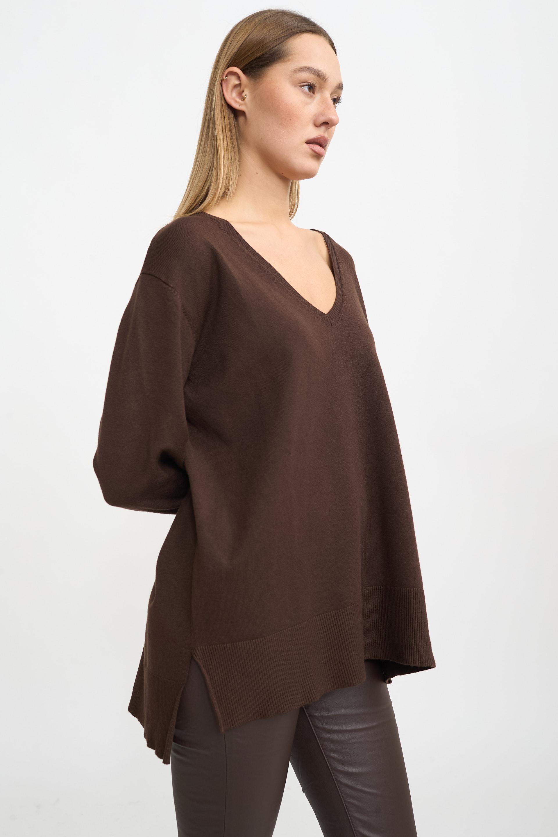 | Maglia over in misto viscosa tinta unita con spacchi laterali. Dettaglio di lavorazione a costine su scollo, orlo e polsini. Orlo asimmetrico fronte-retro. | ||