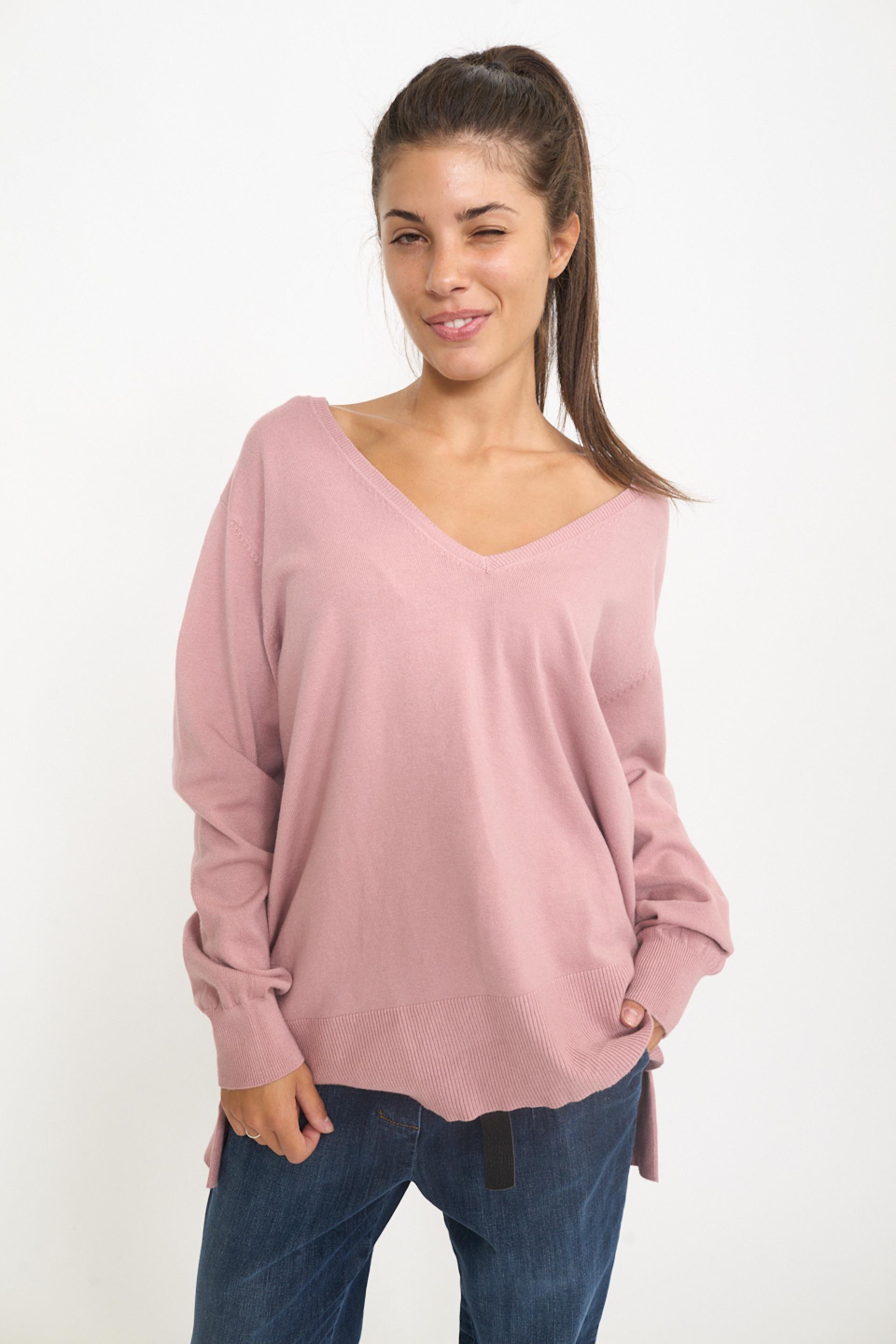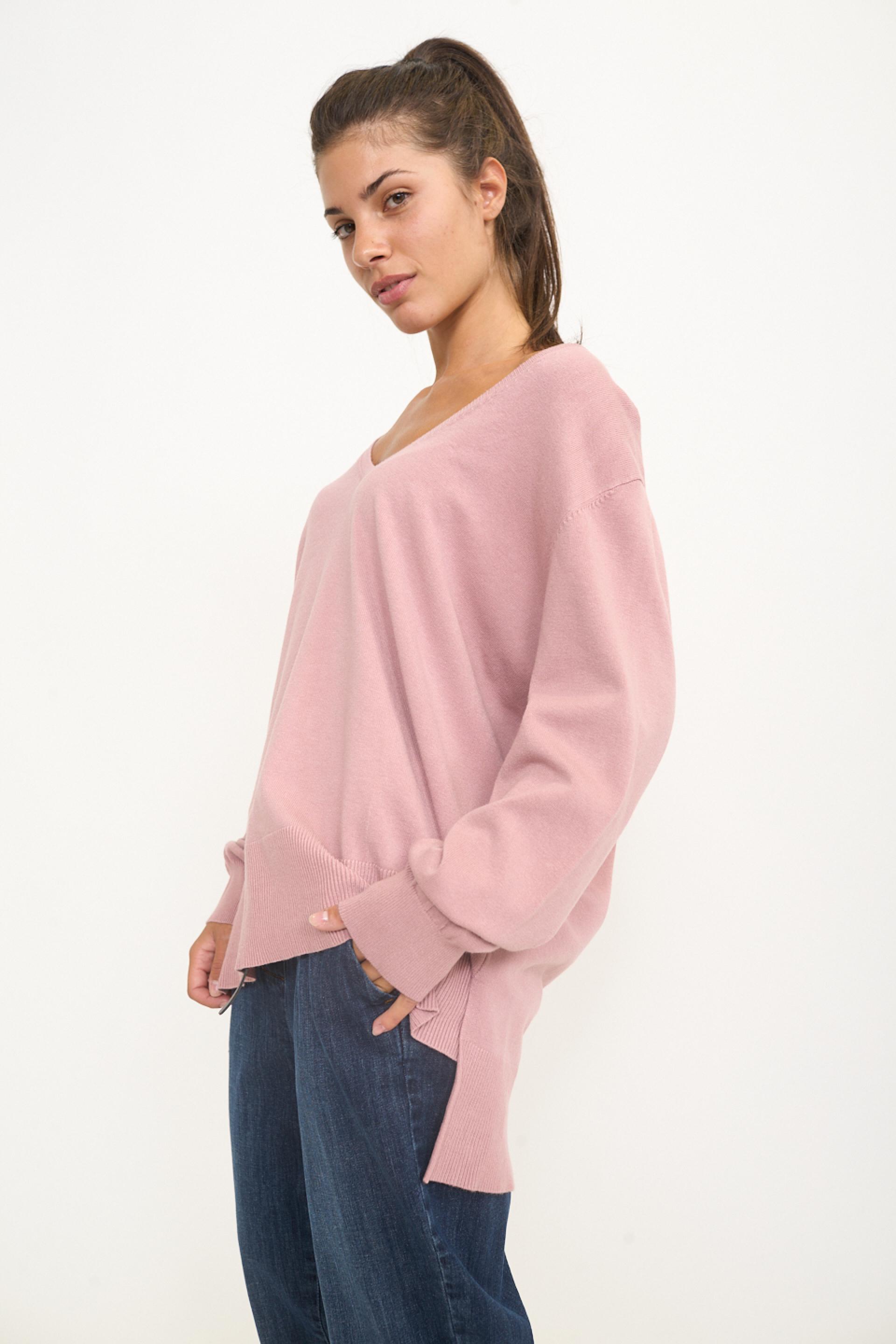 Maglia over in misto viscosa tinta unita con spacchi laterali. Dettaglio di lavorazione a costine su scollo, orlo e polsini. Orlo asimmetrico fronte-retro. | ||