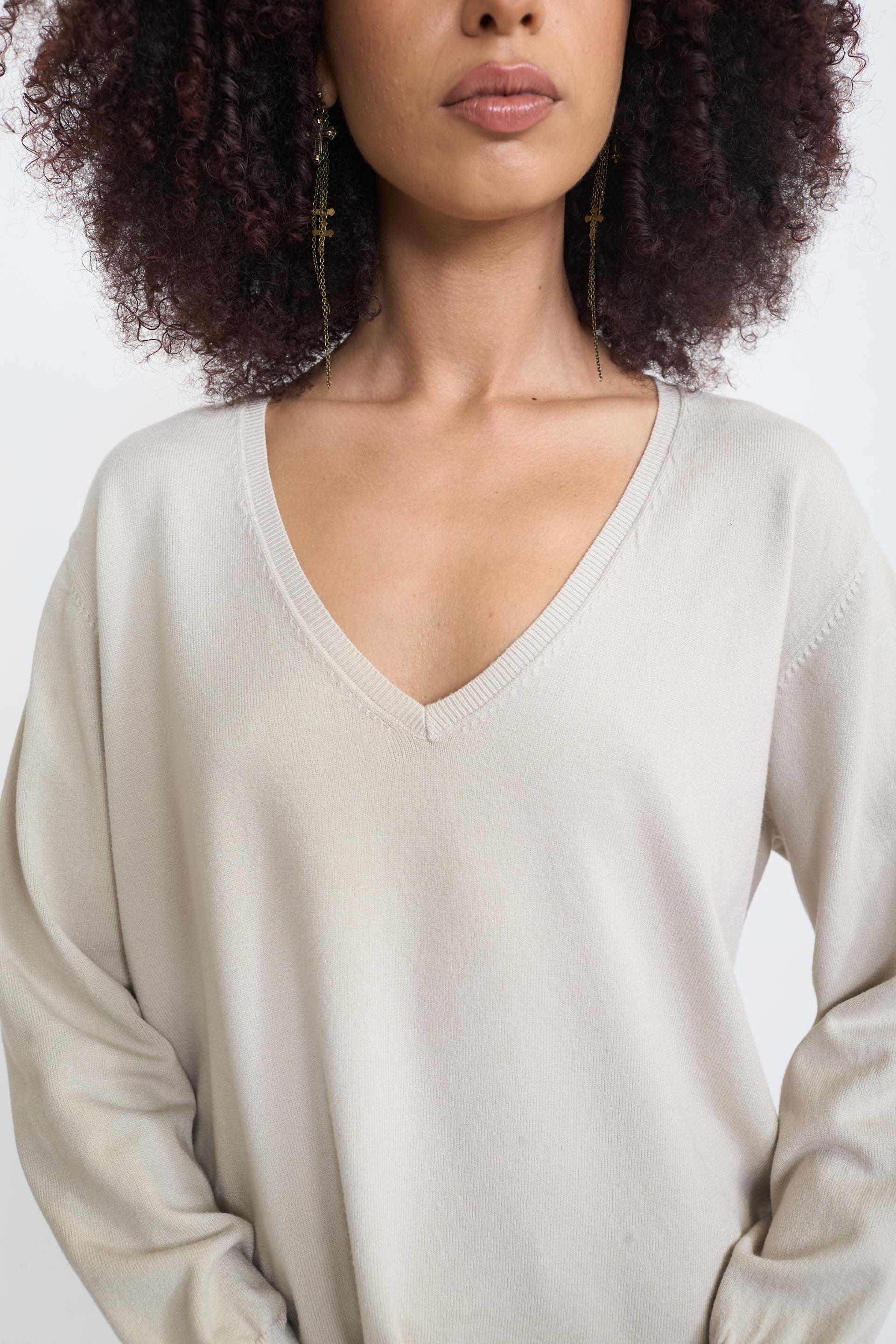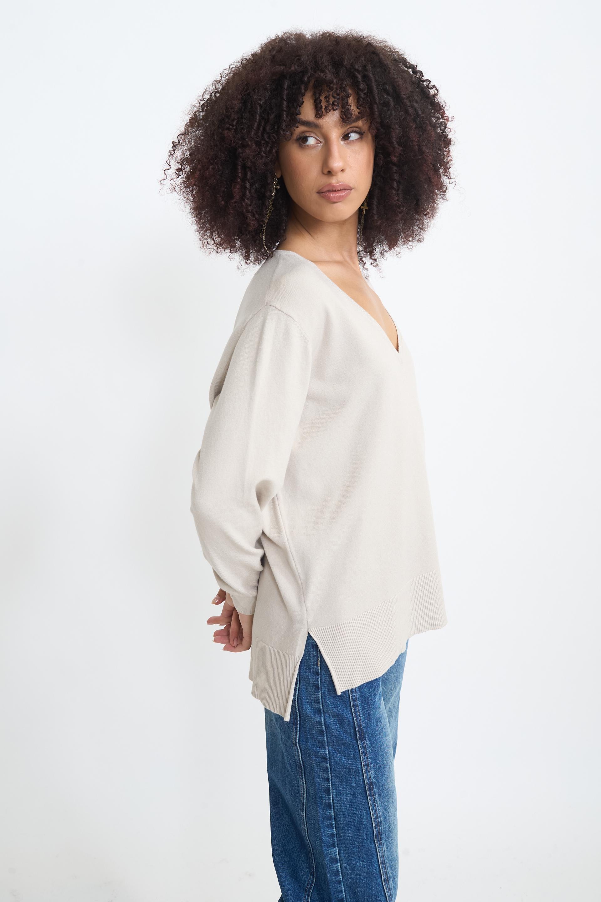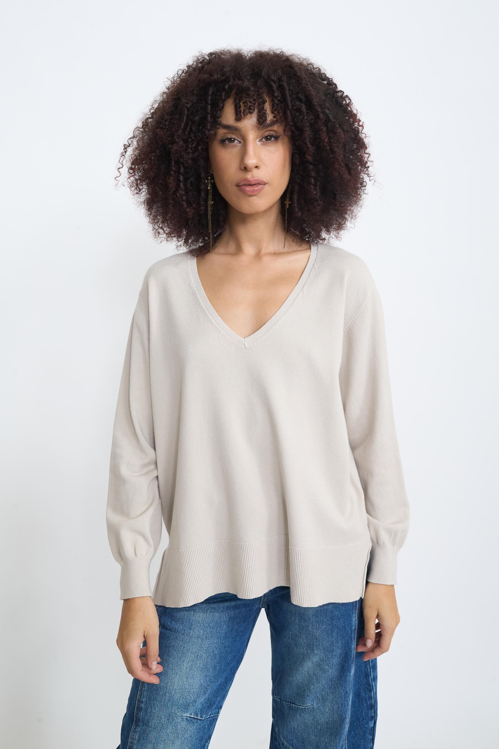 Maglia over in misto viscosa tinta unita con spacchi laterali. Dettaglio di lavorazione a costine su scollo, orlo e polsini. Orlo asimmetrico fronte-retro. | ||