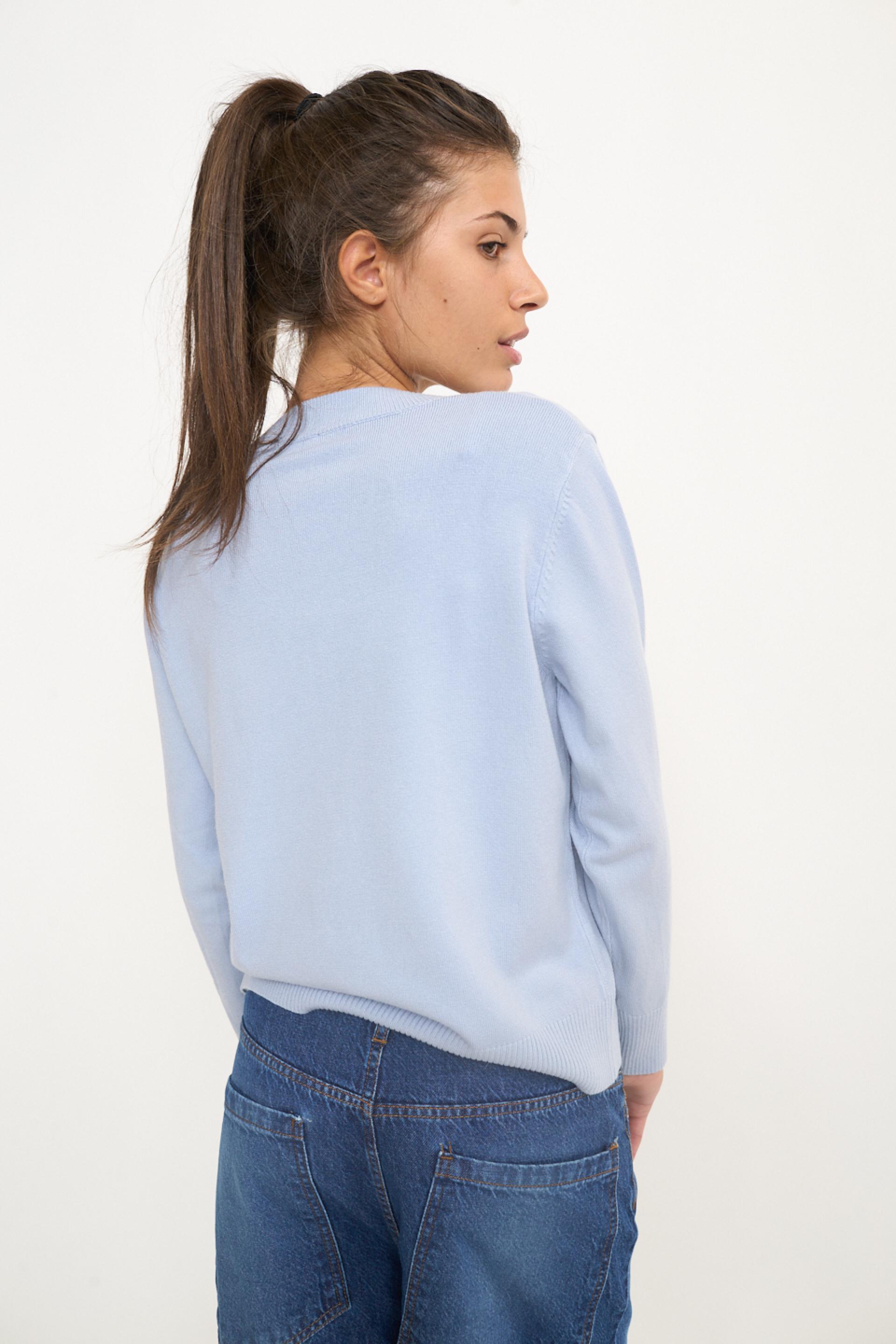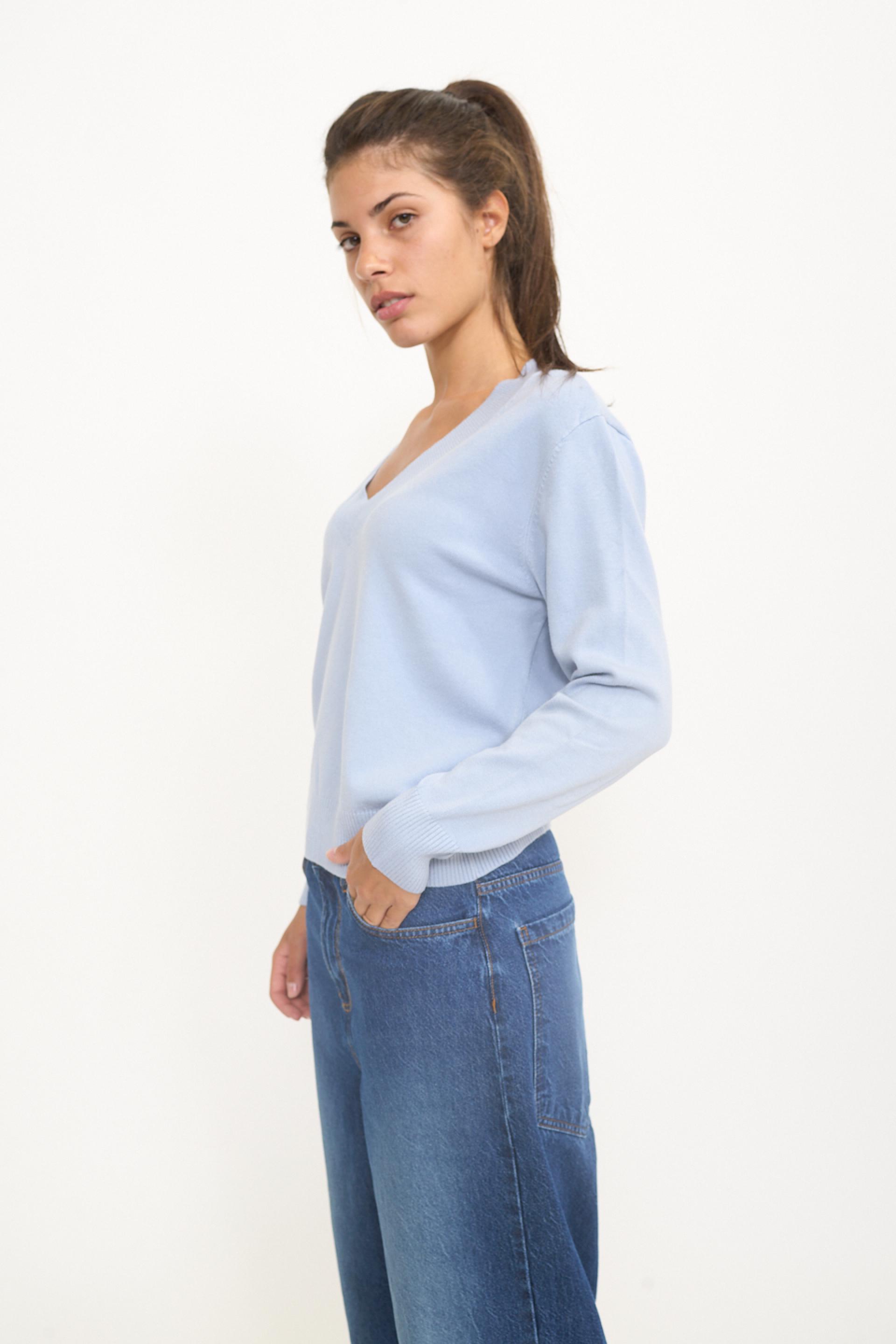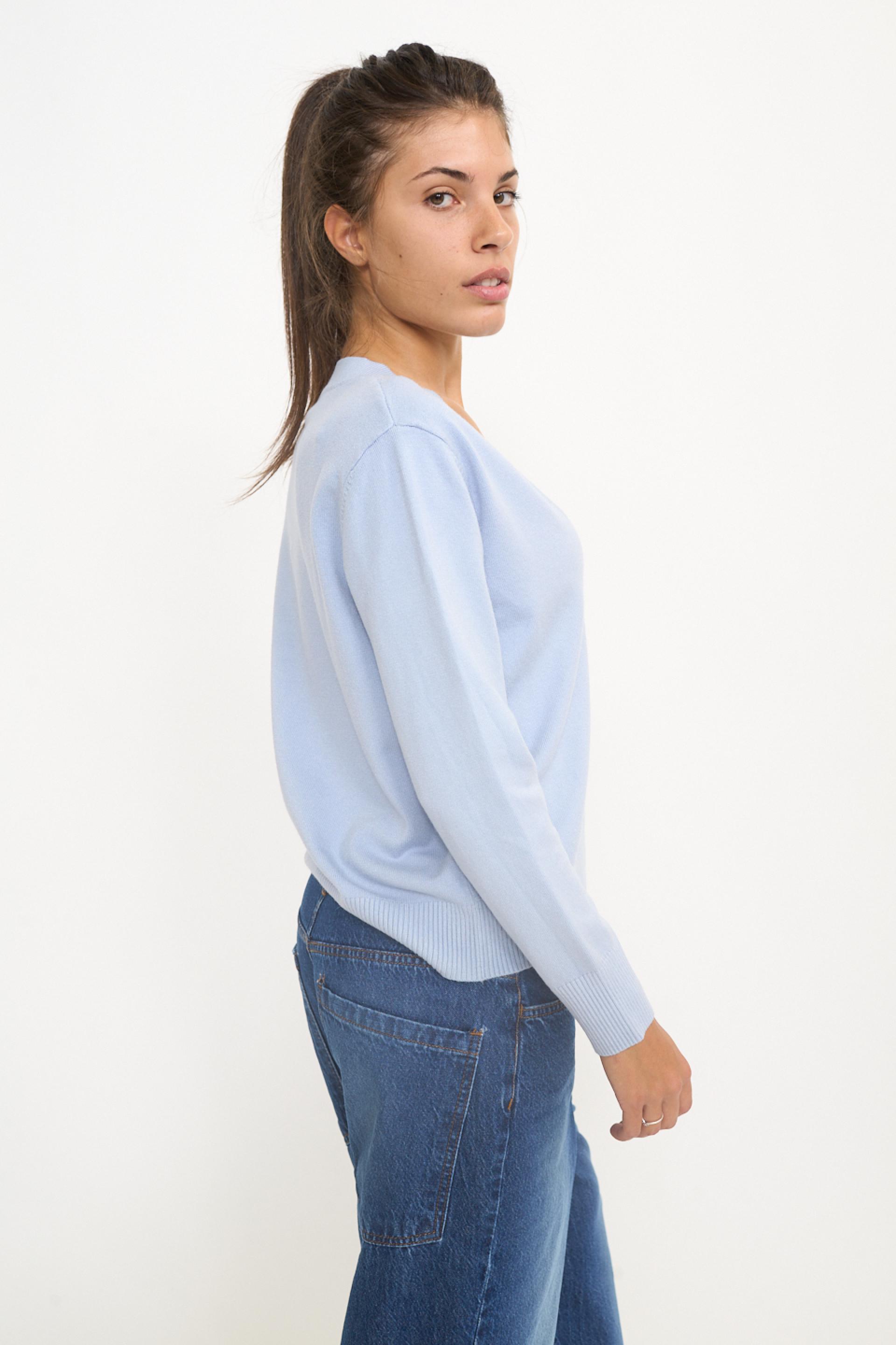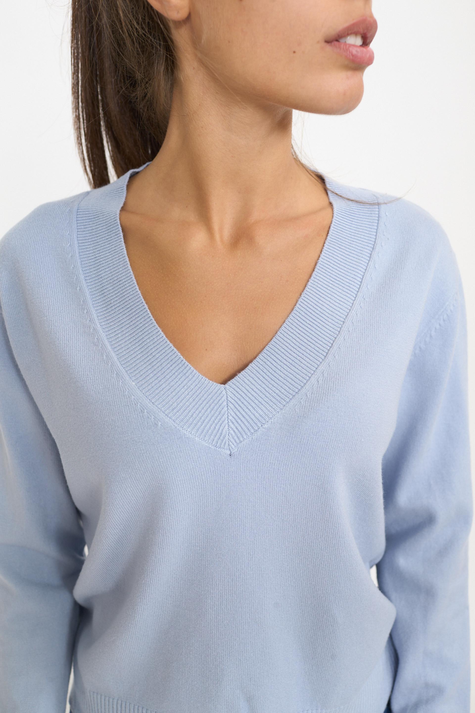 Maglia scollo V in misto viscosa tinta unita. Dettaglio di lavorazione a coste su scollo, polsini e orlo. | ||