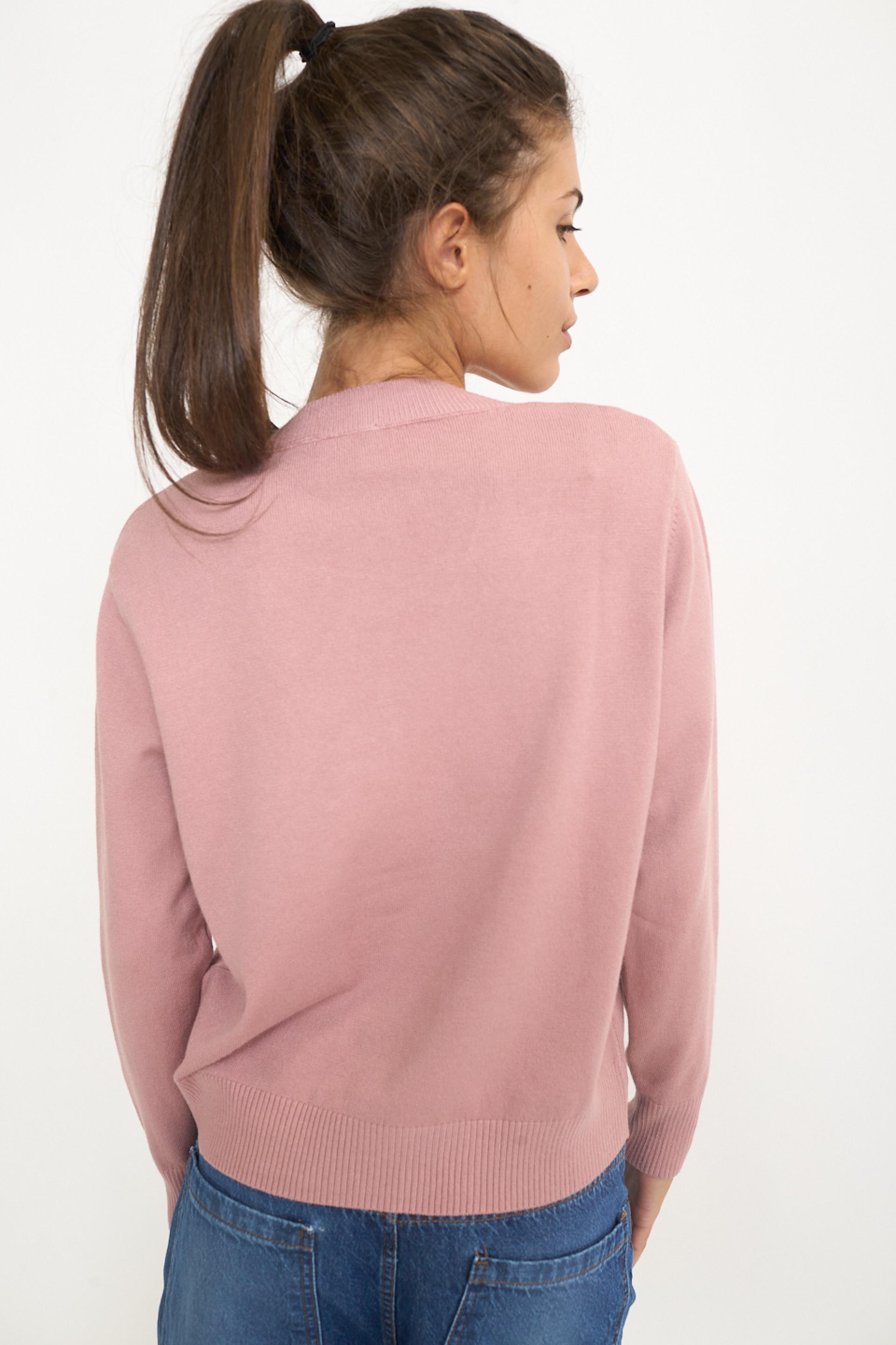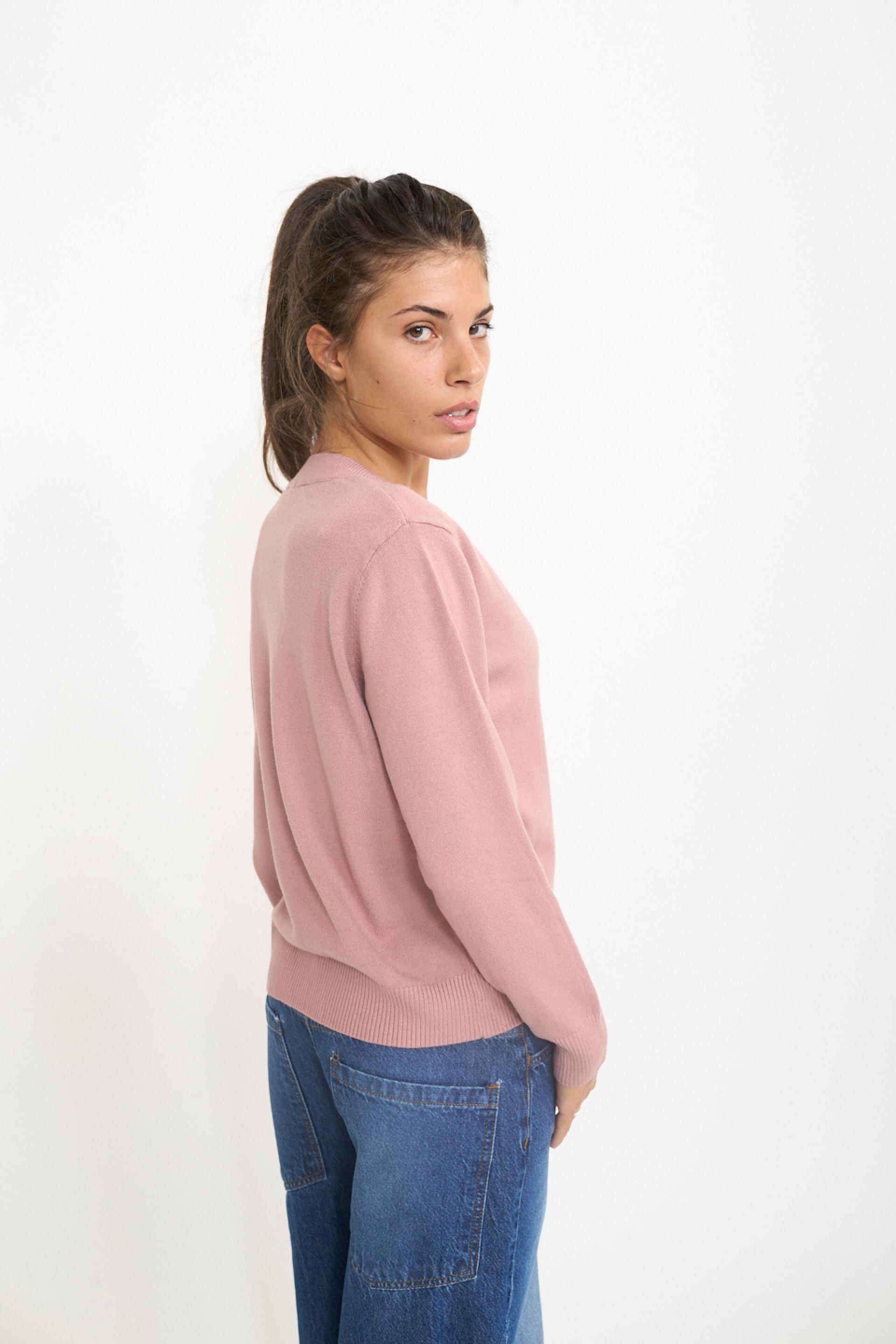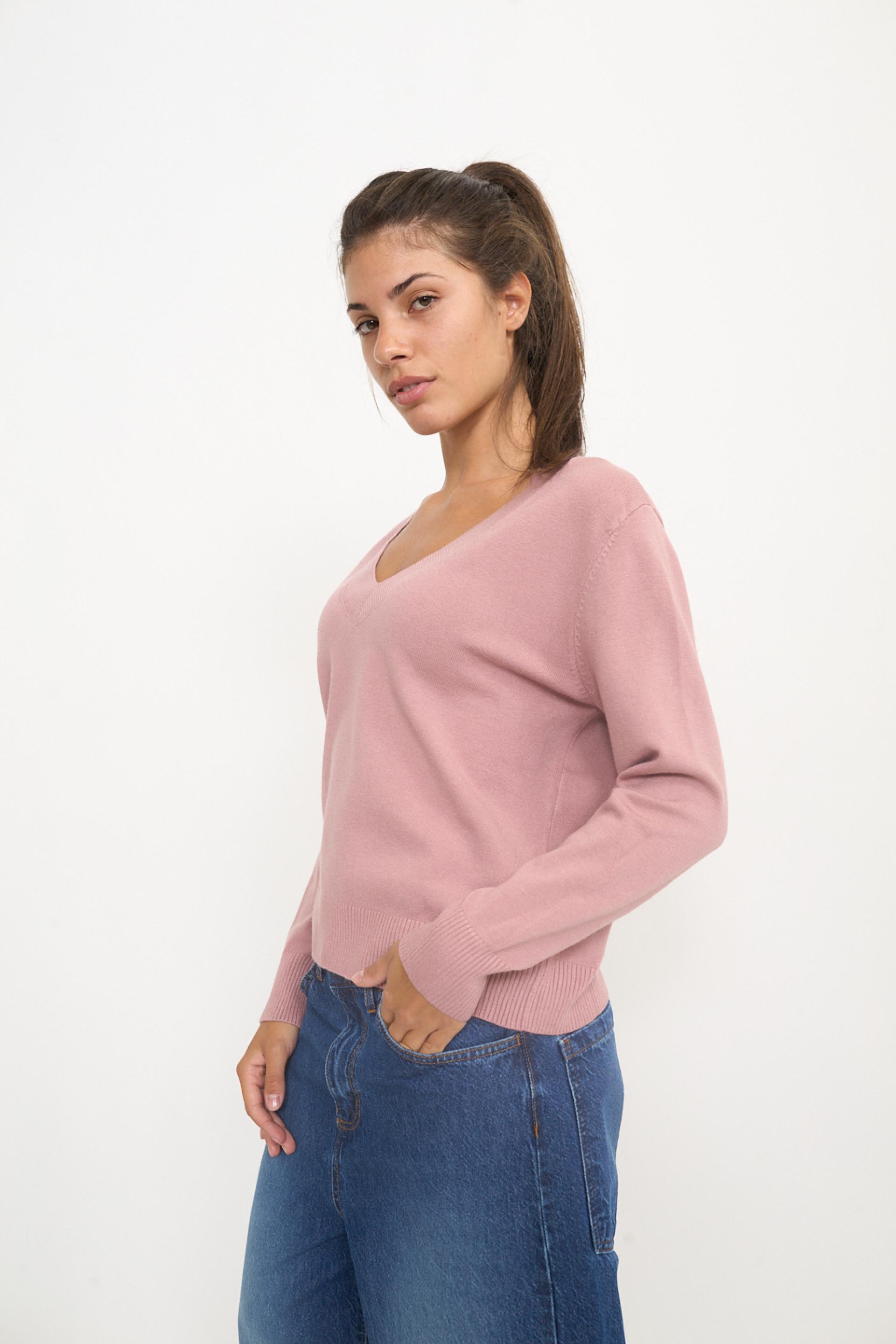Maglia scollo V in misto viscosa tinta unita. Dettaglio di lavorazione a coste su scollo, polsini e orlo. | ||