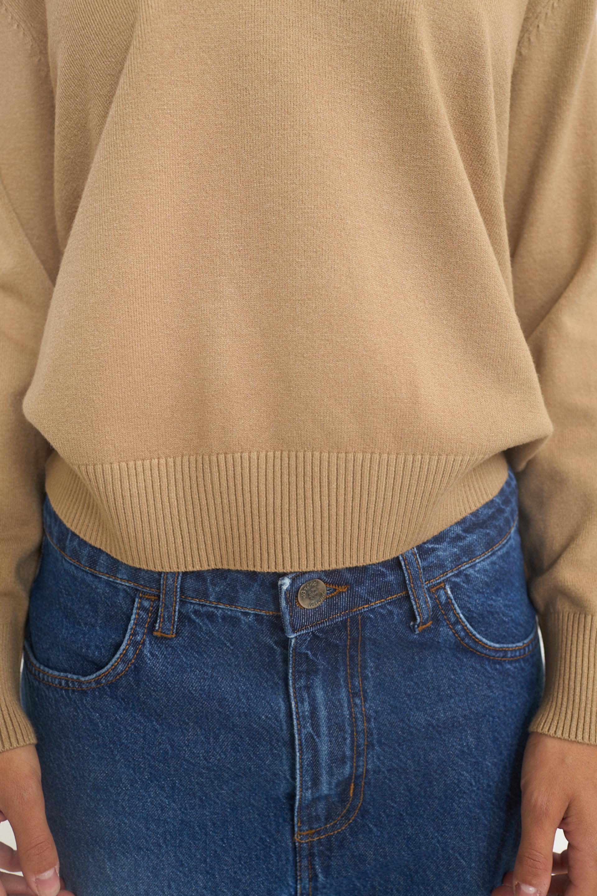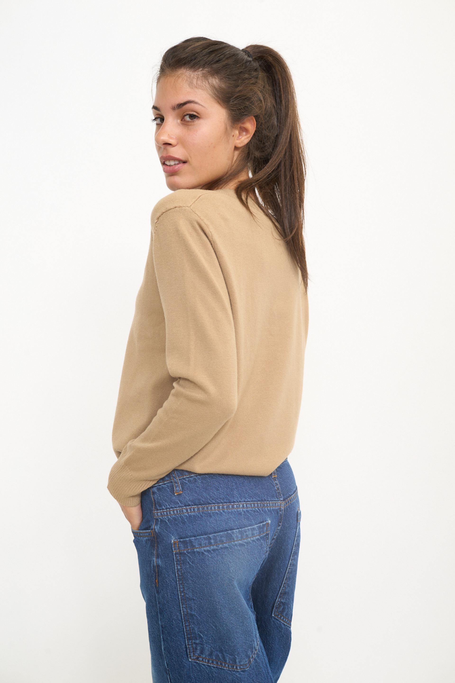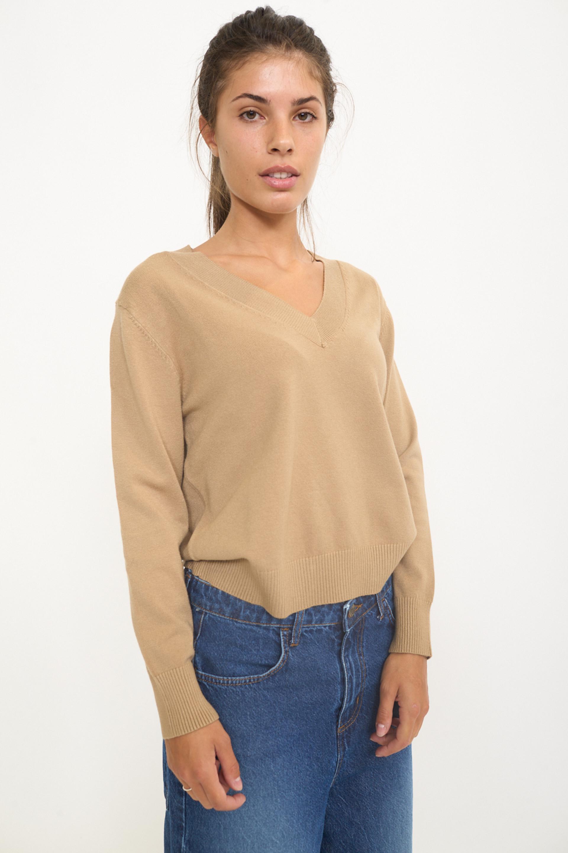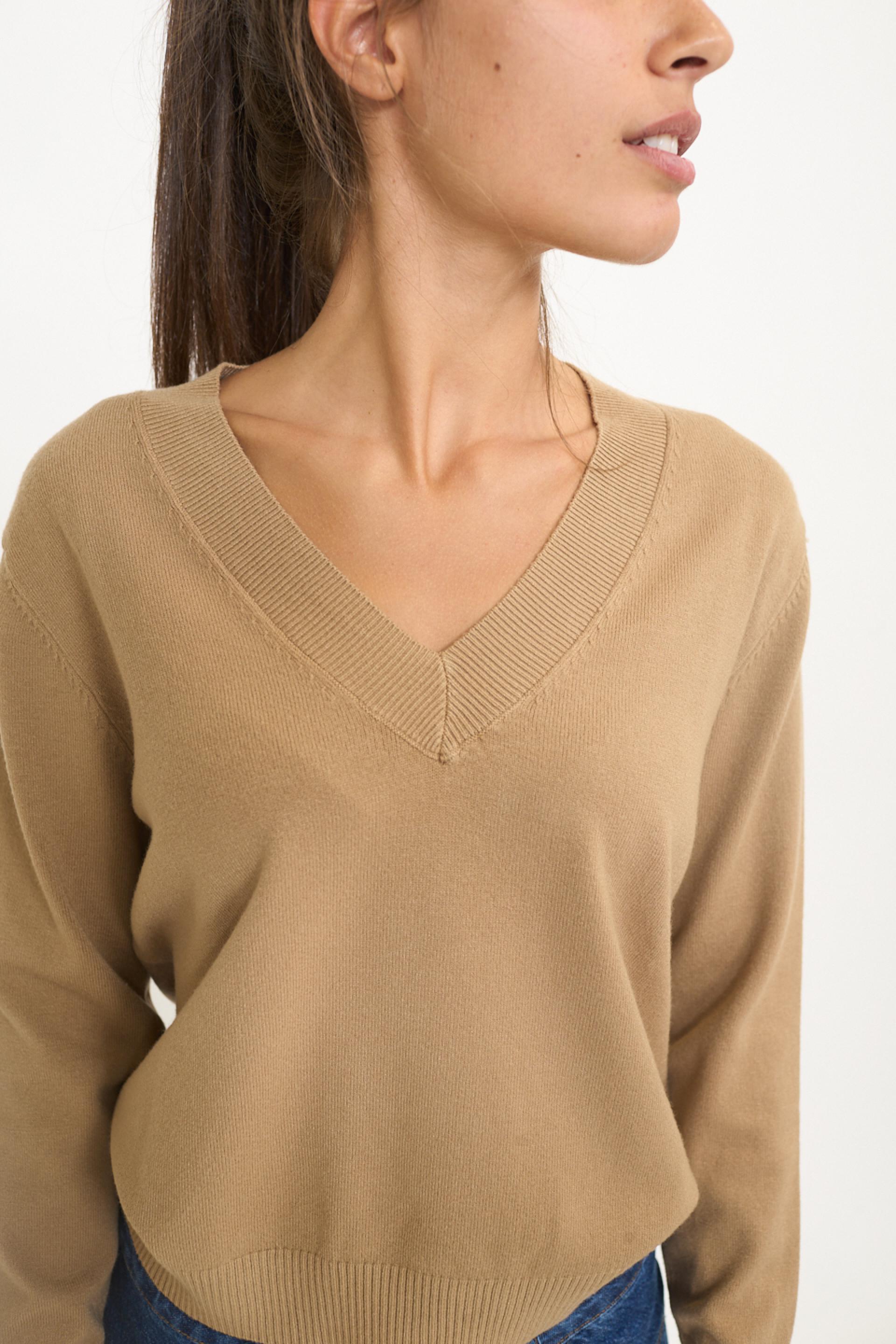 Maglia scollo V in misto viscosa tinta unita. Dettaglio di lavorazione a coste su scollo, polsini e orlo. | ||