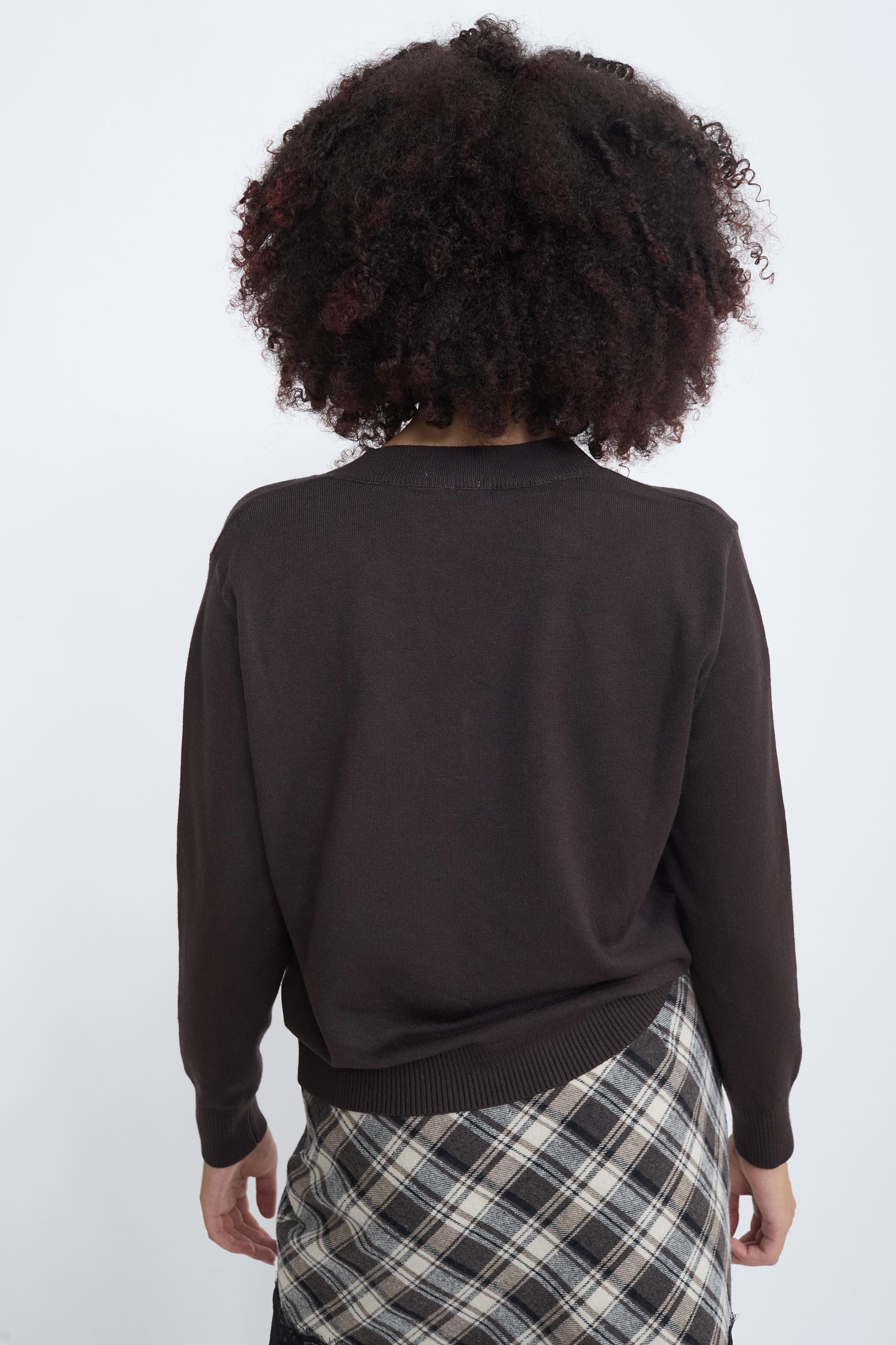 Maglia scollo V in misto viscosa tinta unita. Dettaglio di lavorazione a coste su scollo, polsini e orlo. | ||
