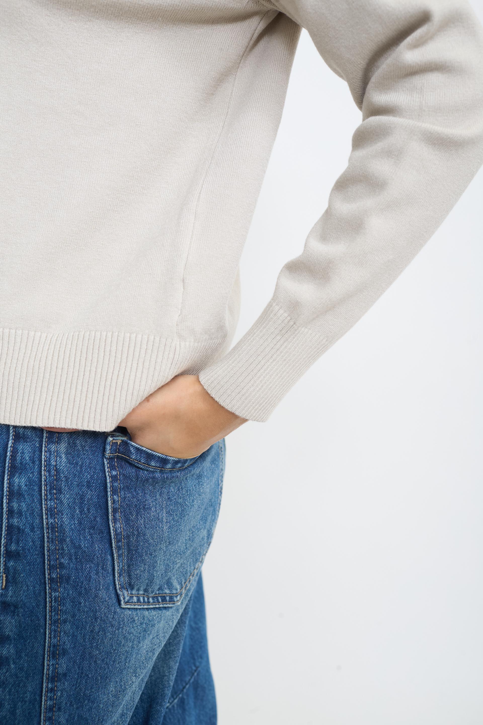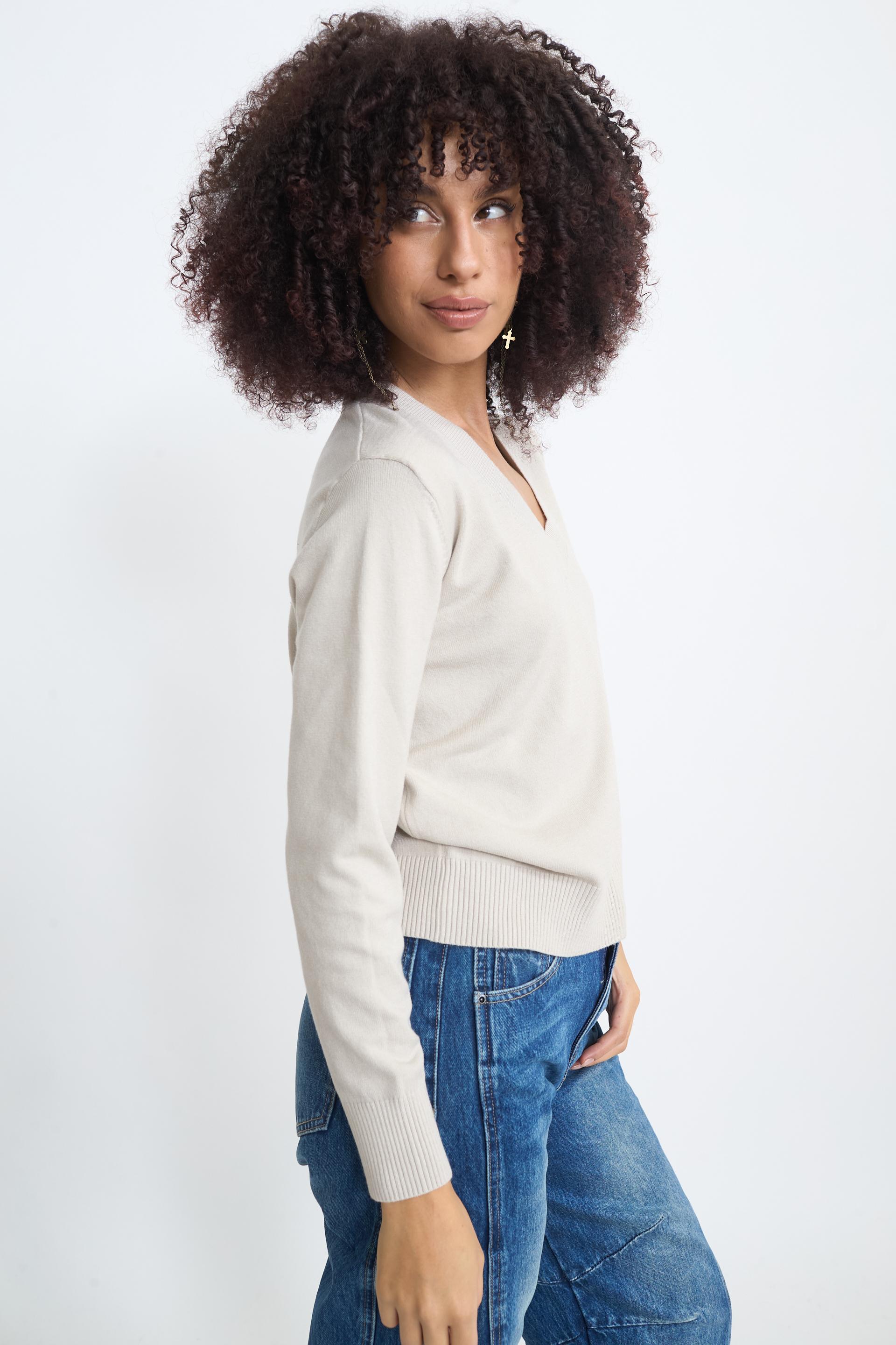 Maglia scollo V in misto viscosa tinta unita. Dettaglio di lavorazione a coste su scollo, polsini e orlo. | ||
