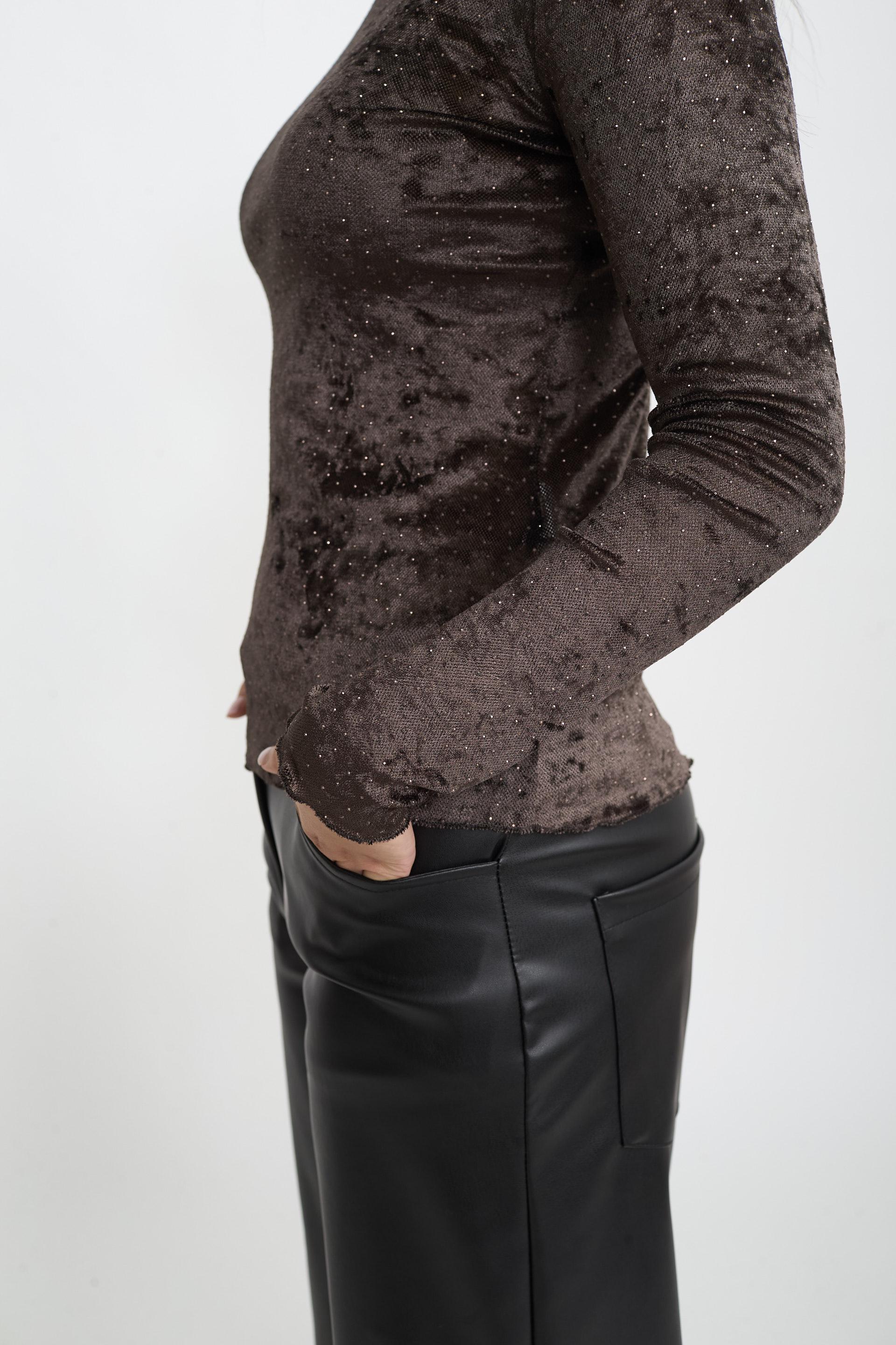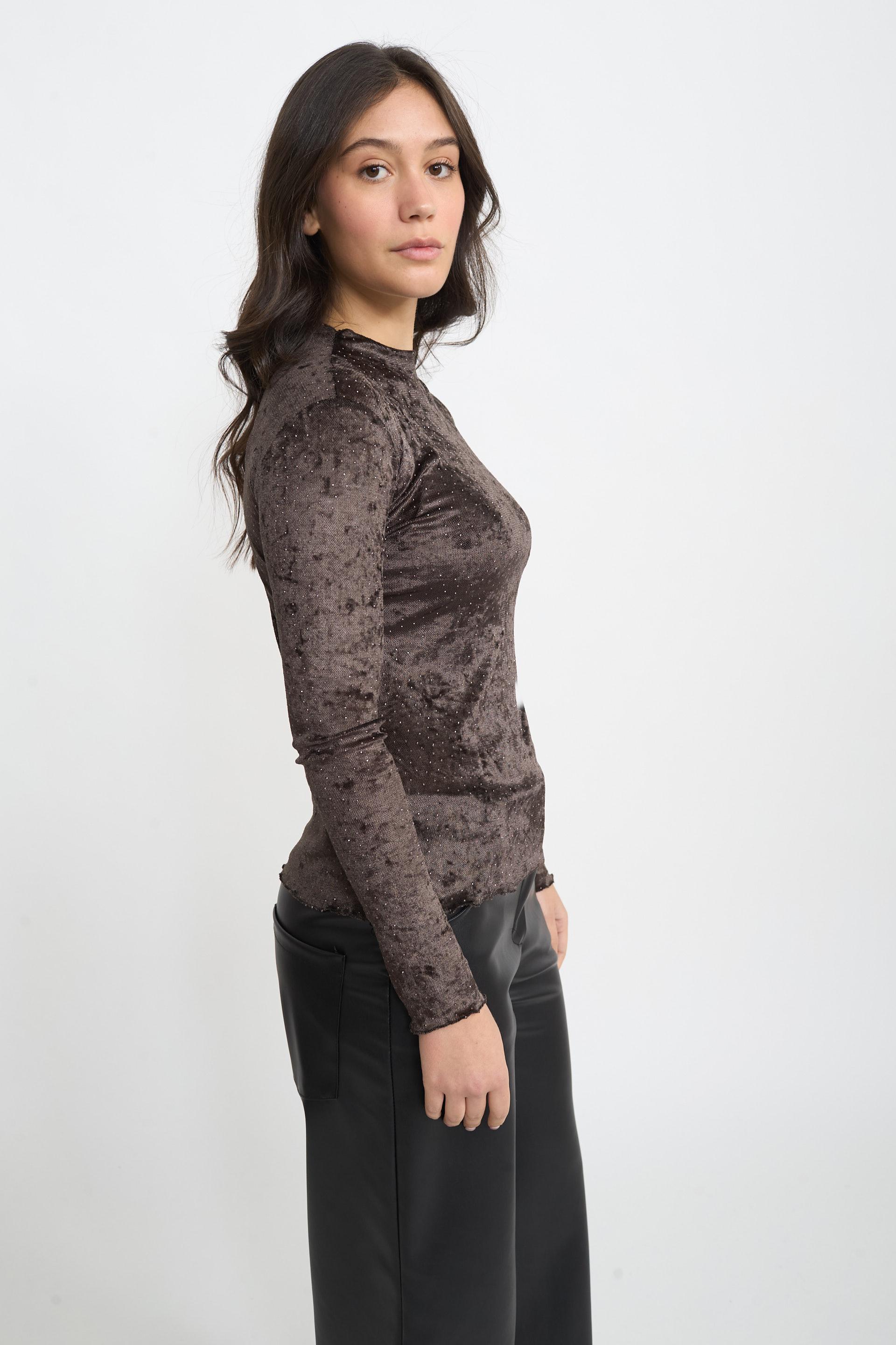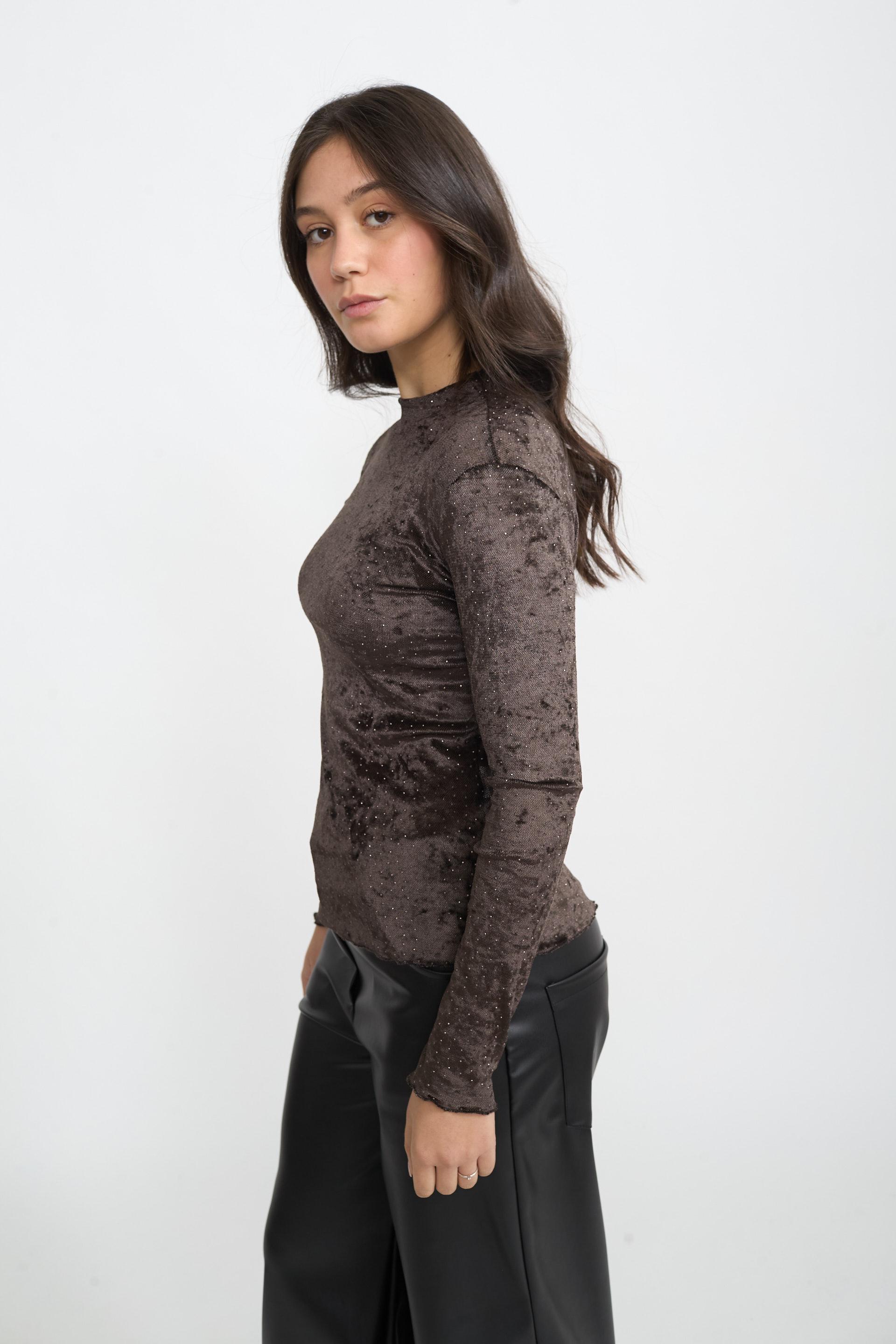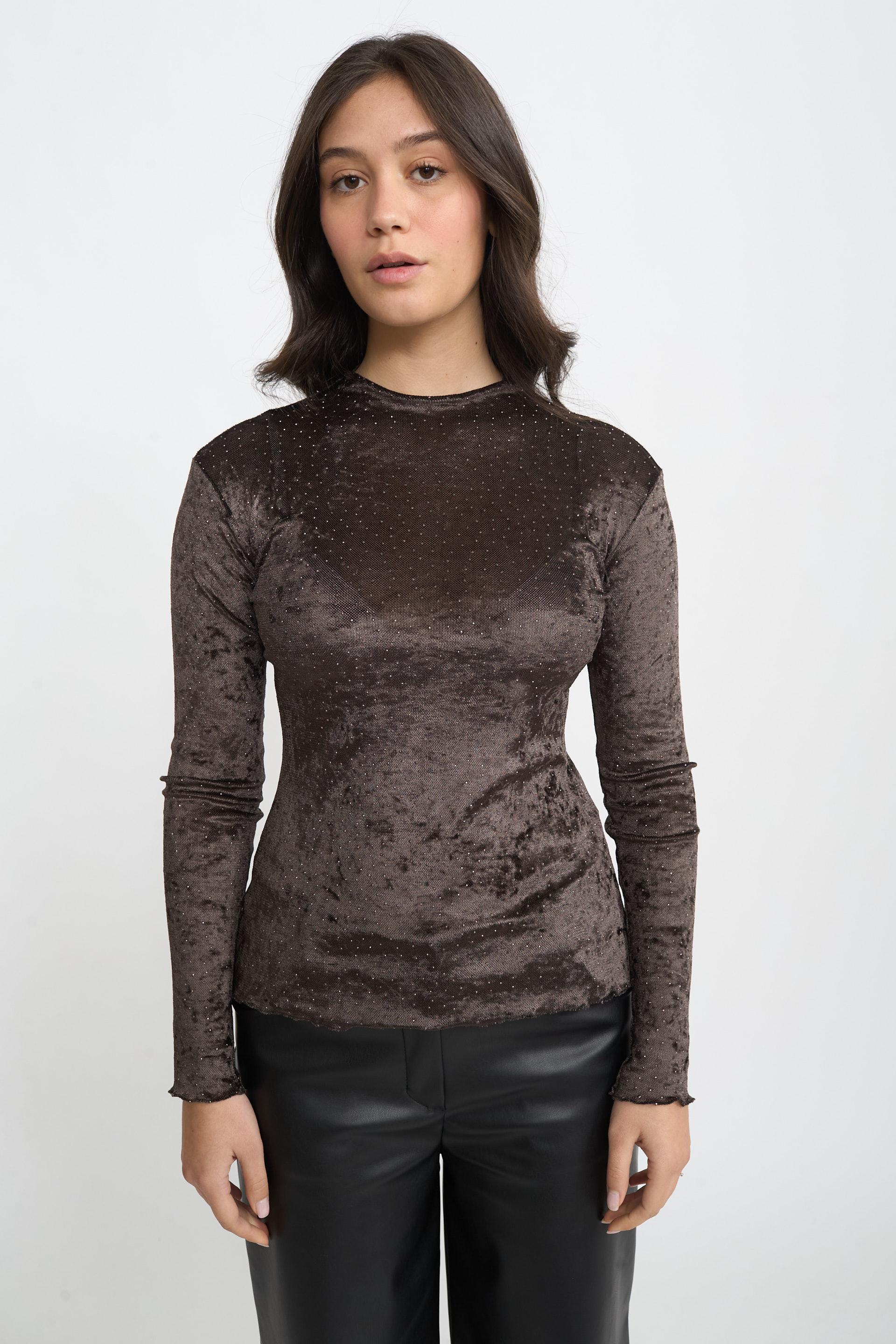 | Maglia scollo vulcano in ciniglia semitrasparente con strass applicati. | ||