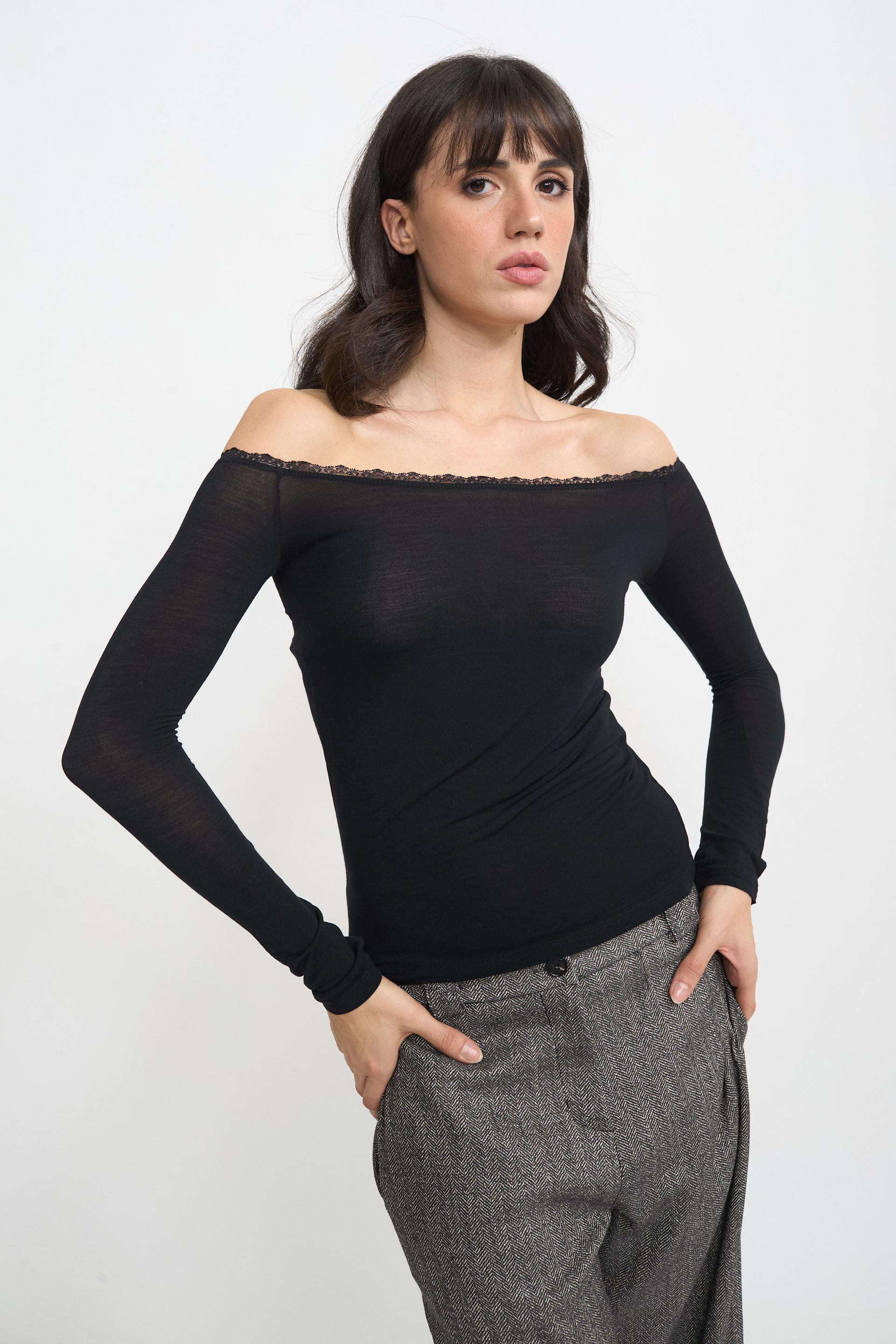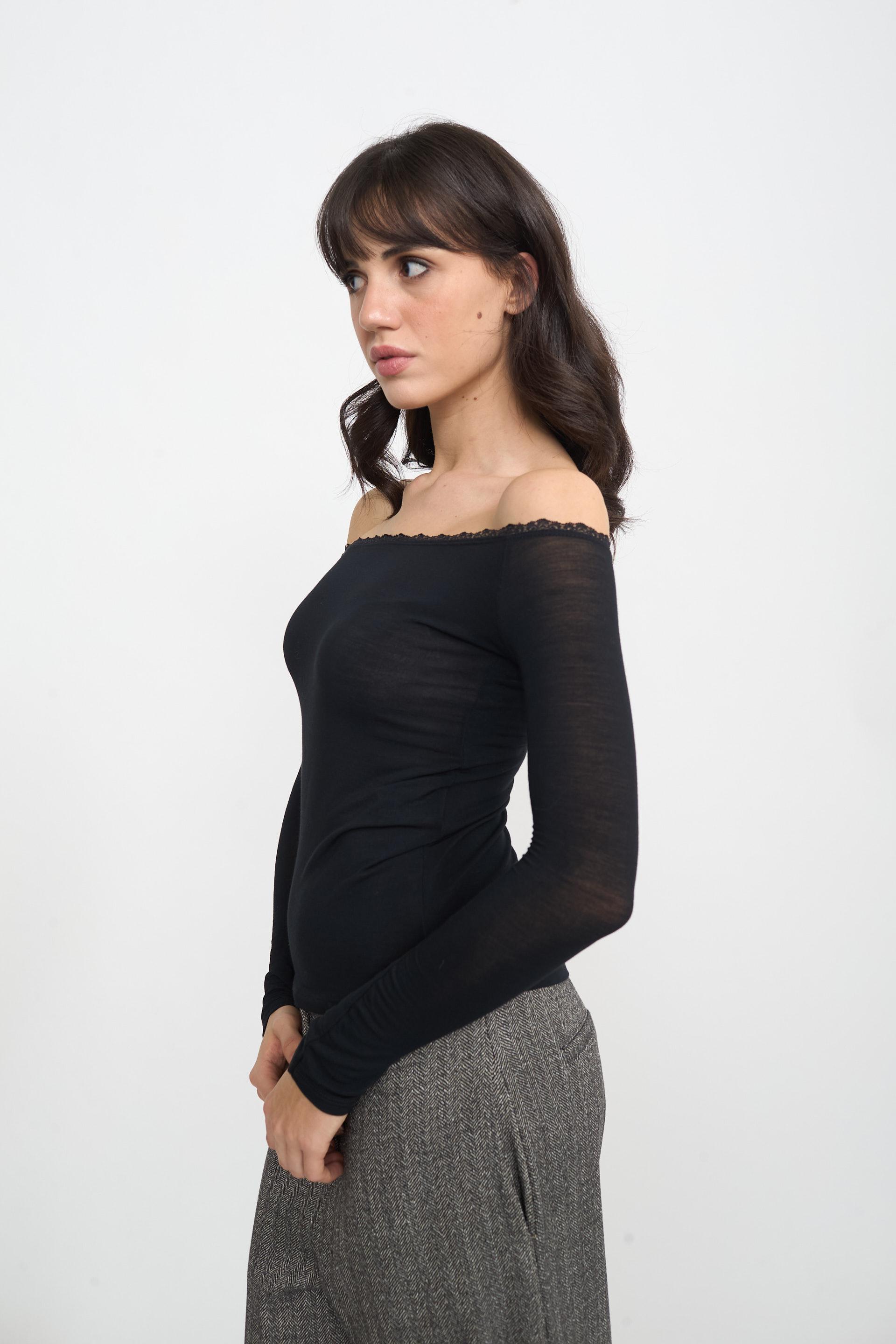 | Maglia scollo barca con pizzo in misto viscosa. | ||