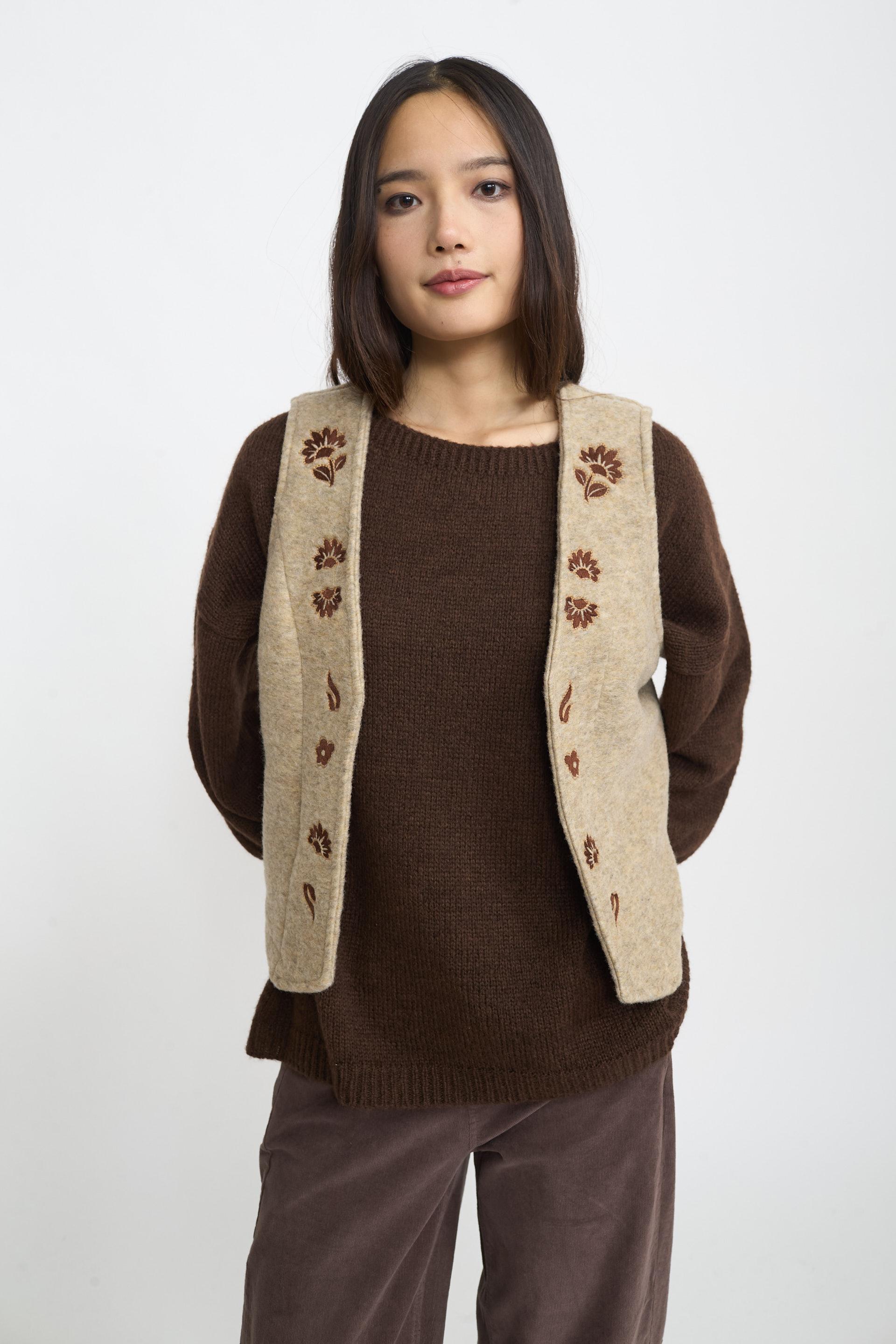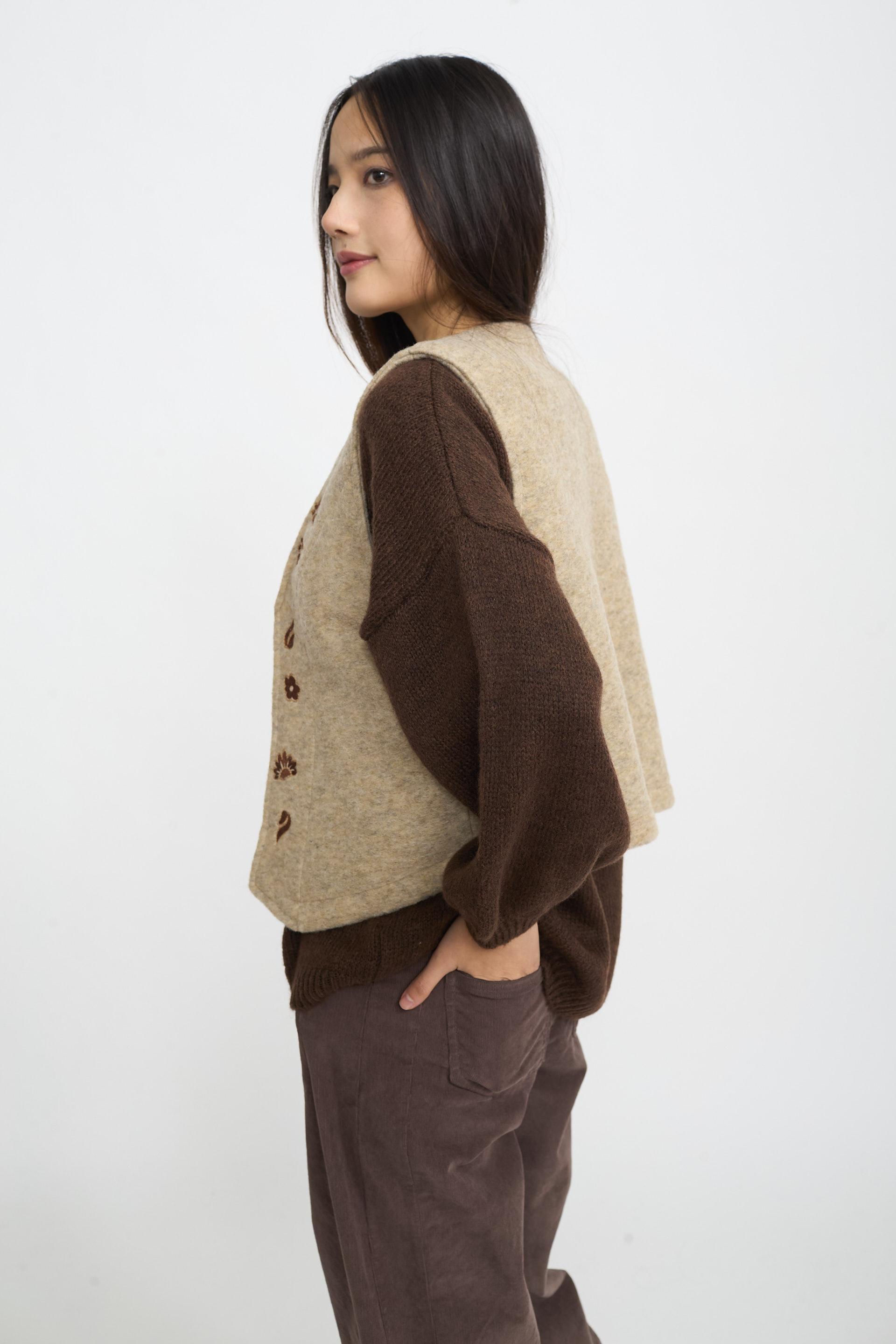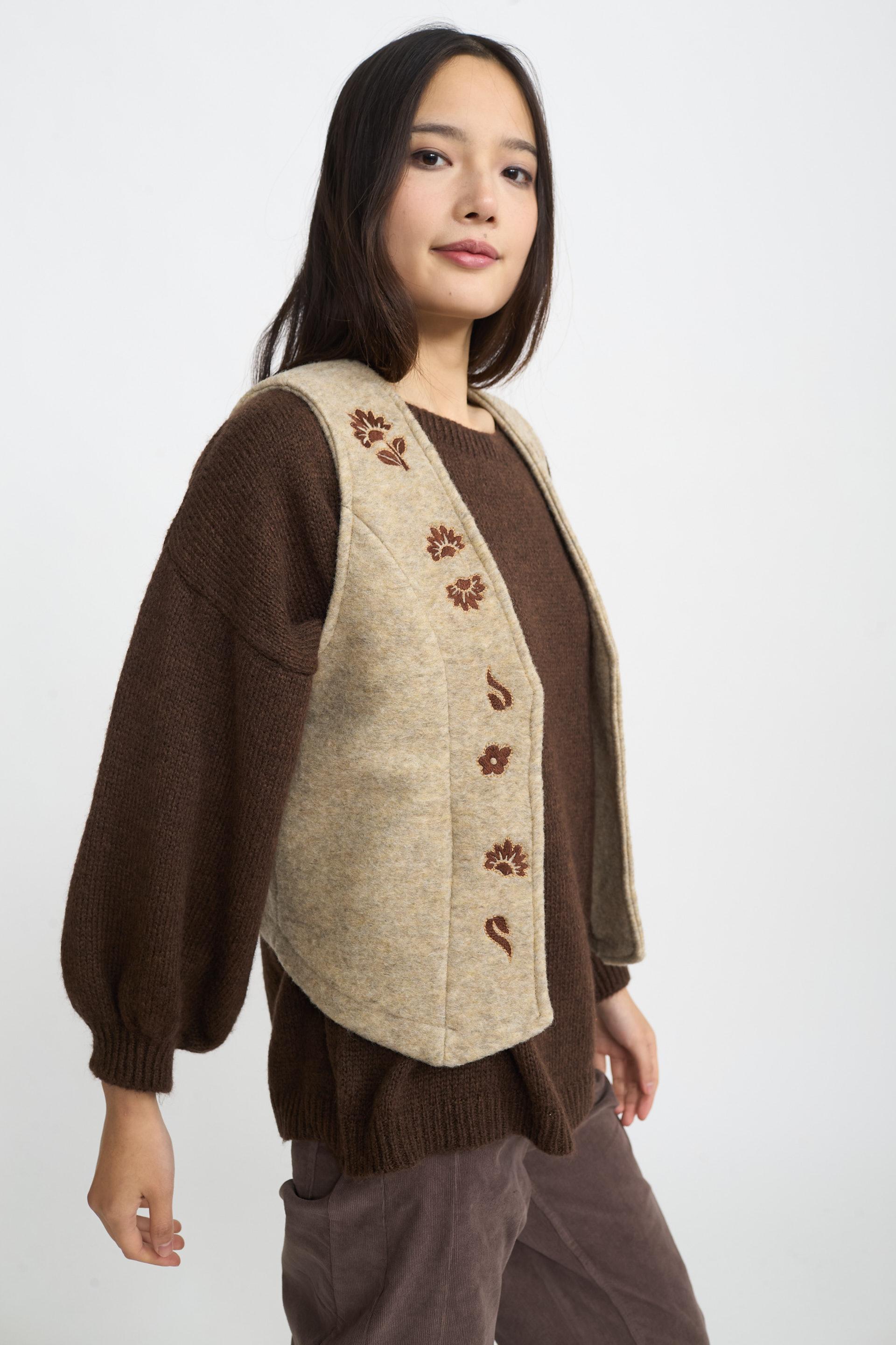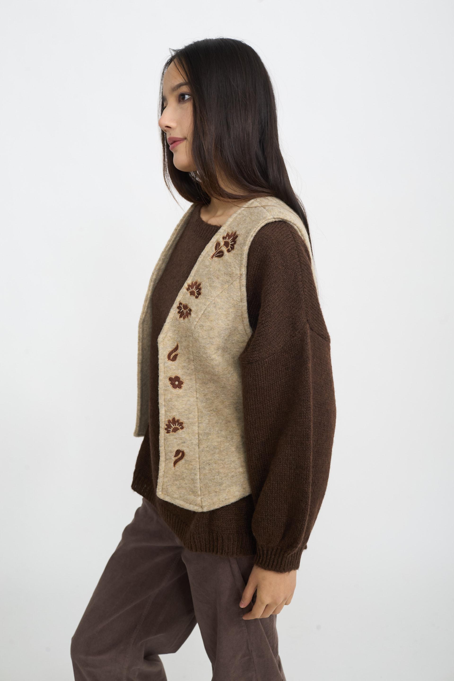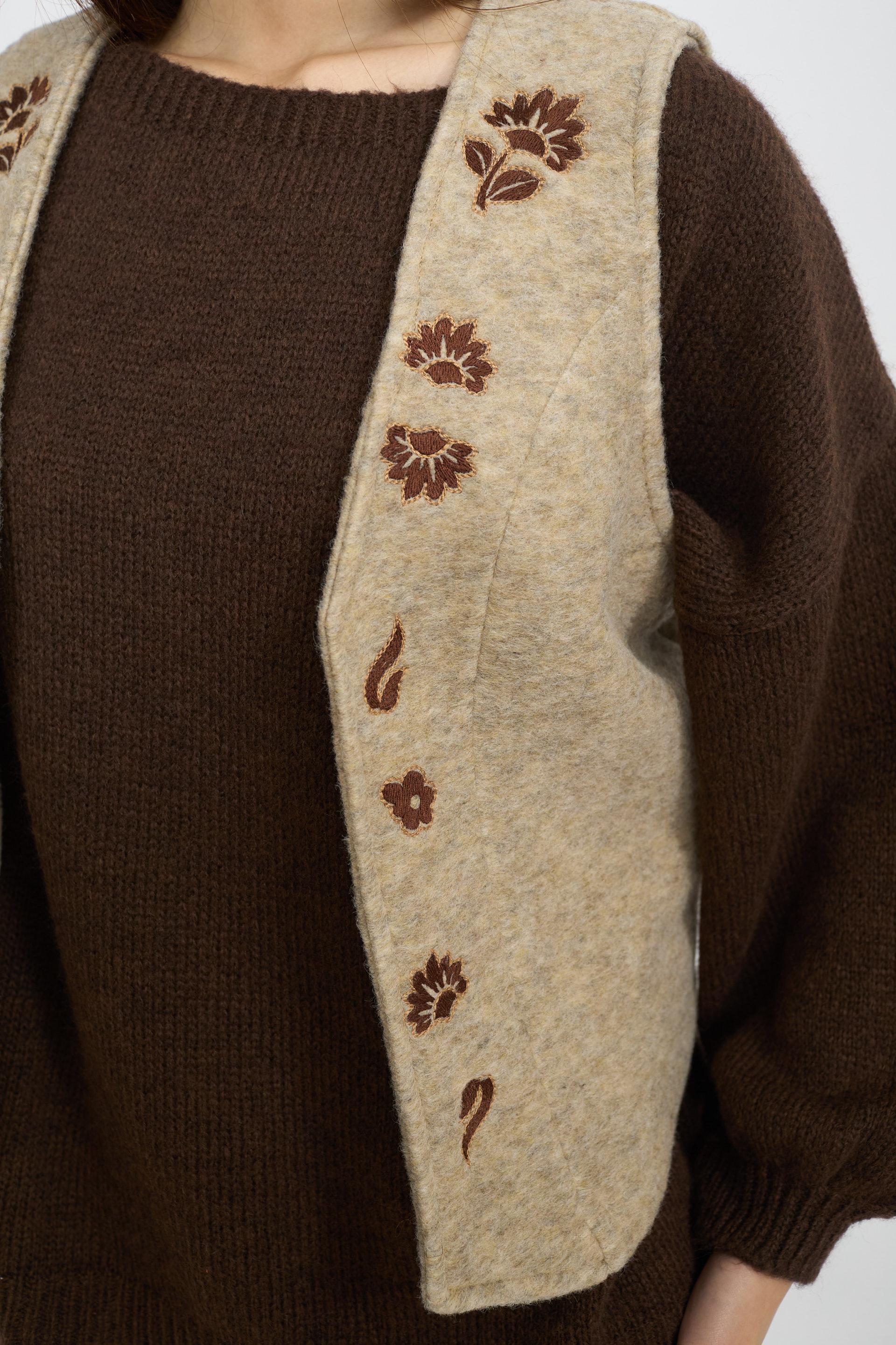 | Gilet mano lana aperto con dettaglio di ricami floreali a contrasto. | ||