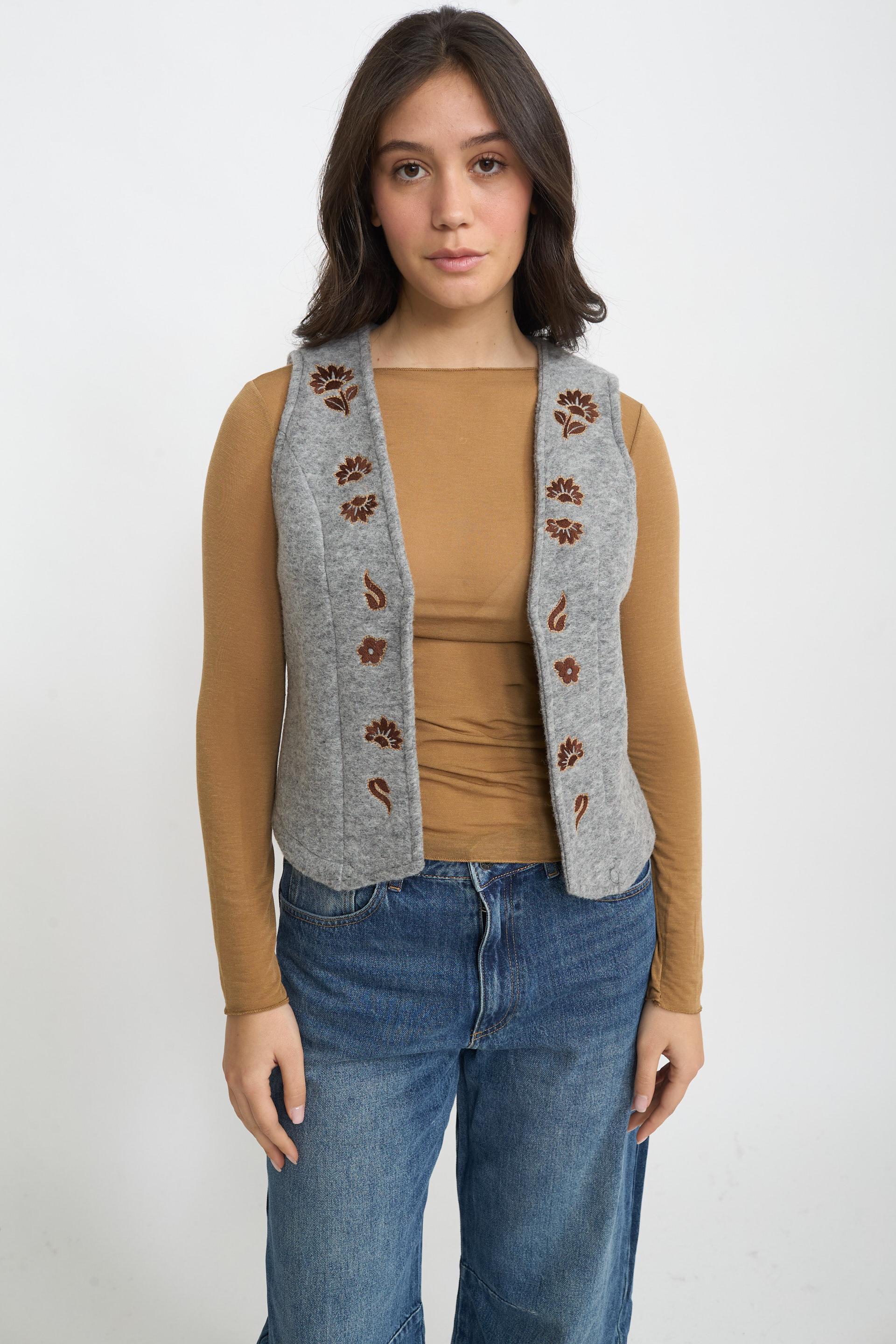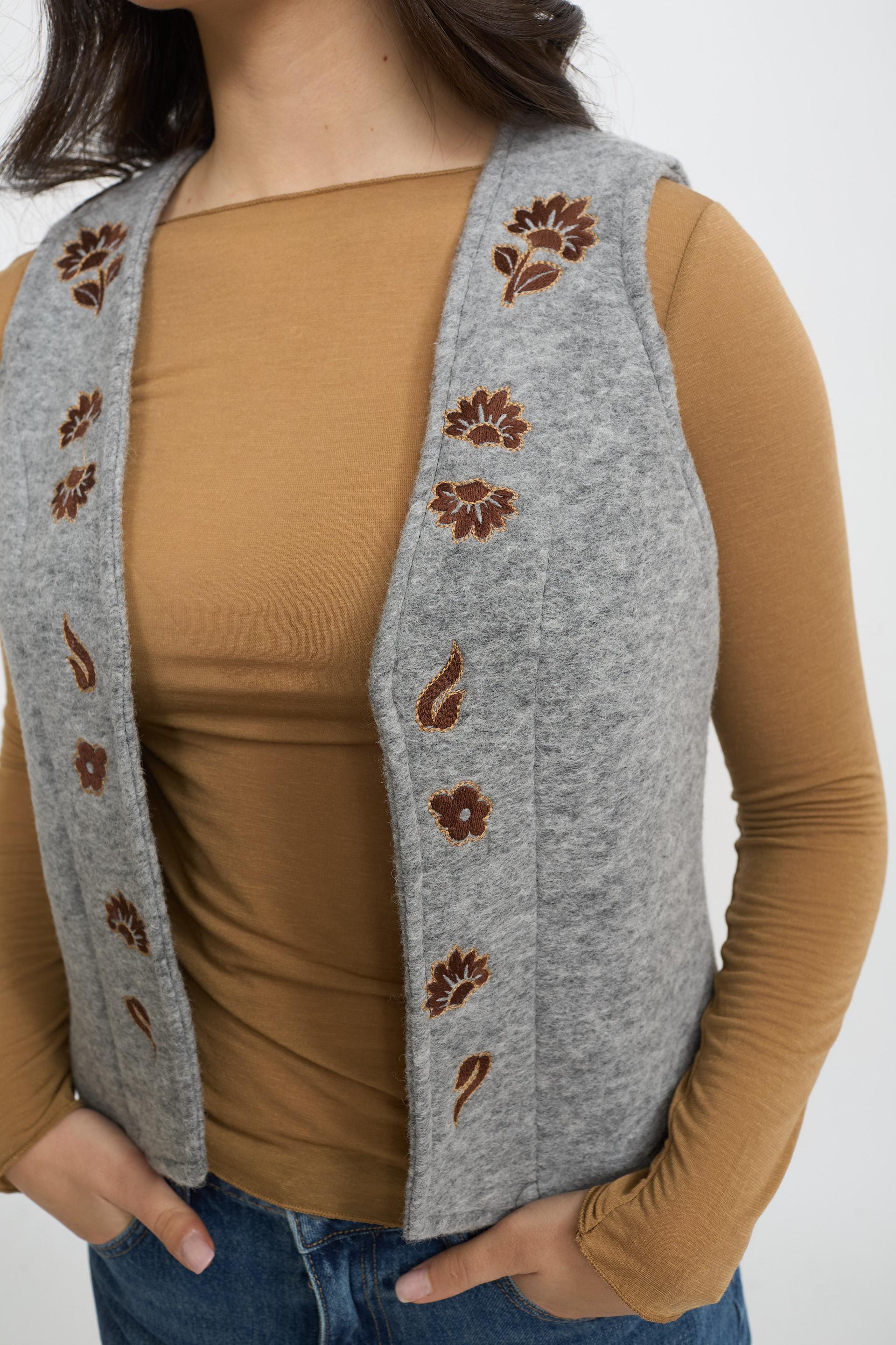 | Gilet mano lana aperto con dettaglio di ricami floreali a contrasto. | ||