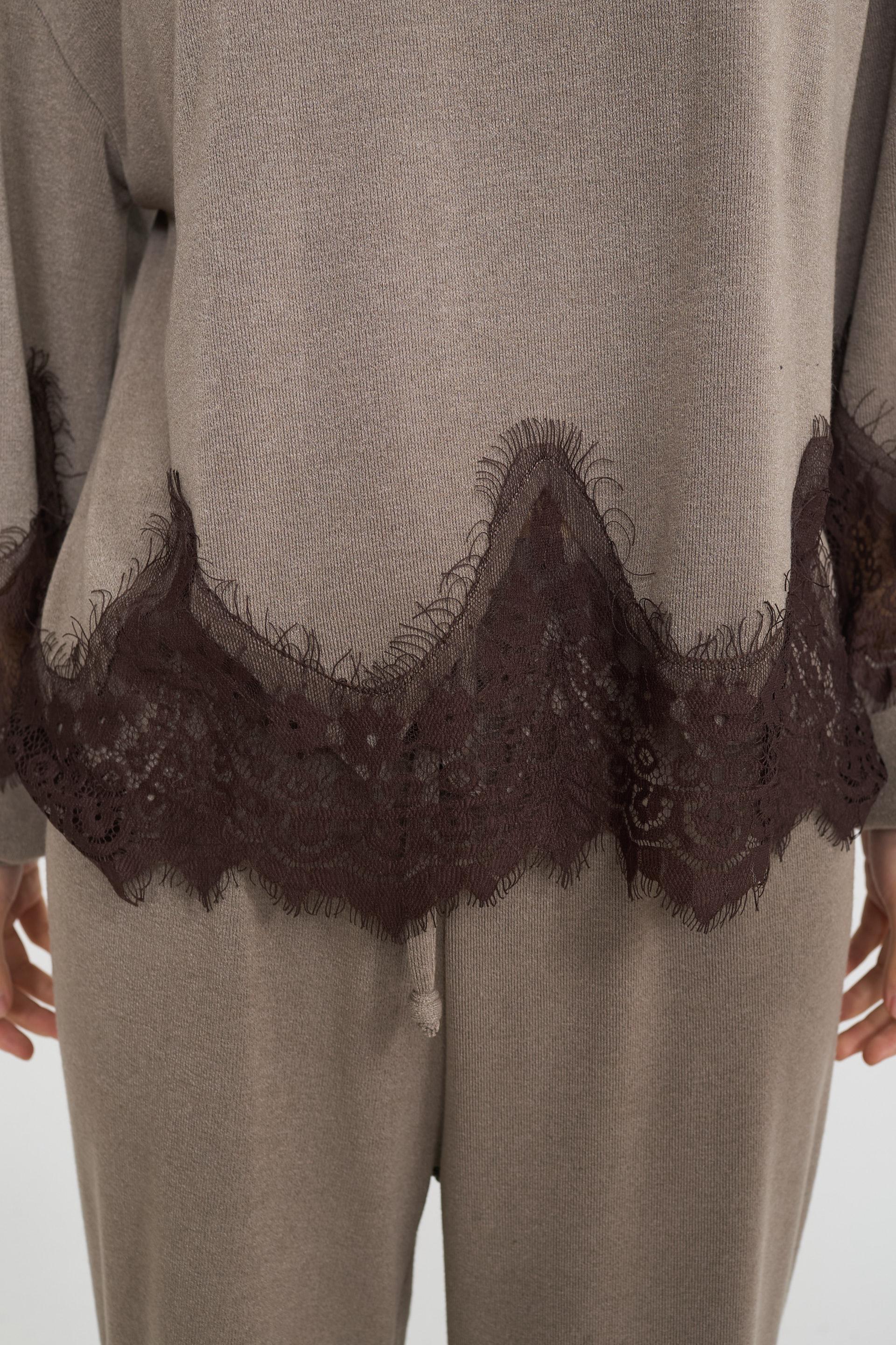 | Maglia girocollo con dettaglio di fascia in pizzo fantasia. | ||
