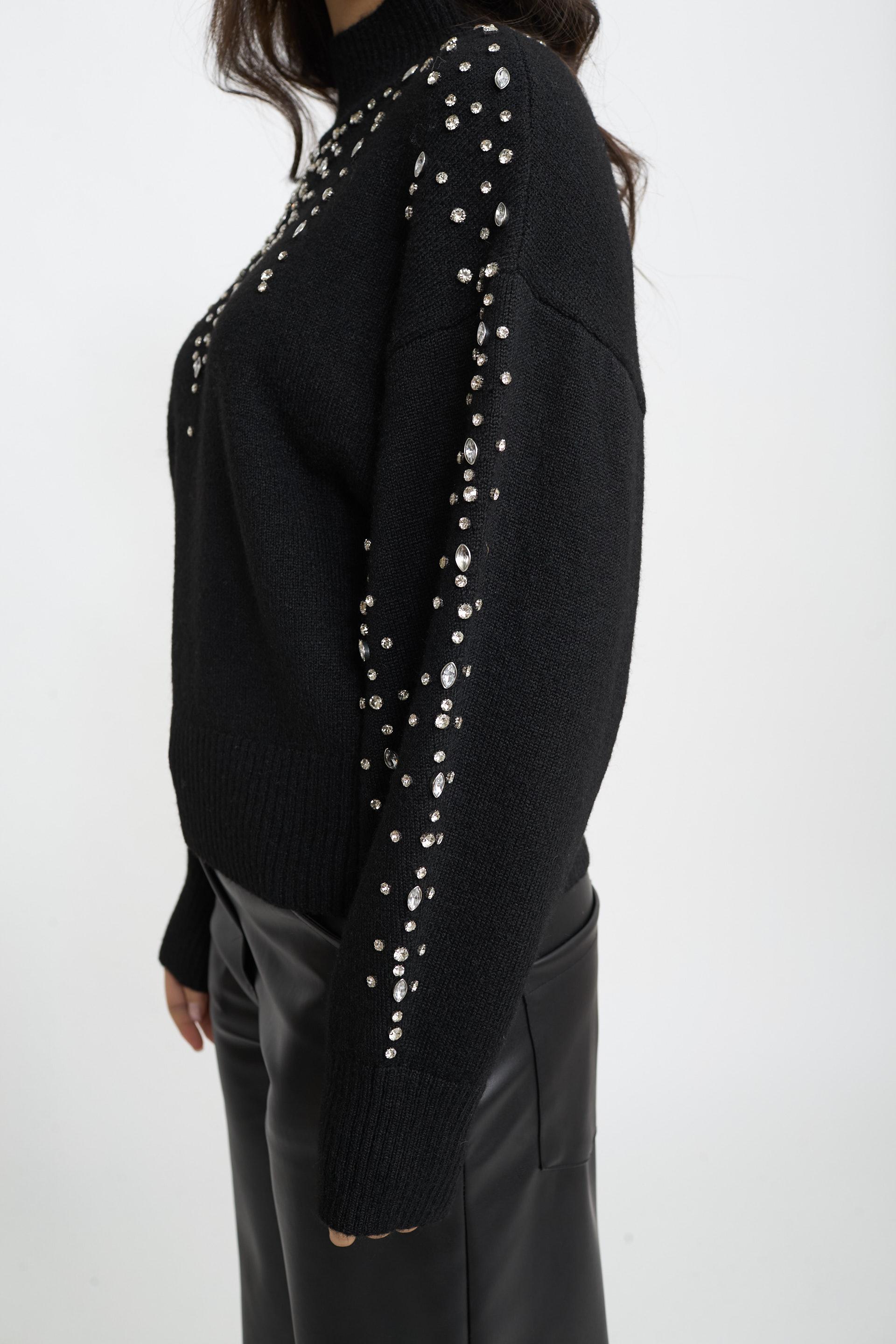| Maglia collo vulcano con dettaglio di strass applicati. Lavorazione a coste su collo, polsi e orlo. | ||