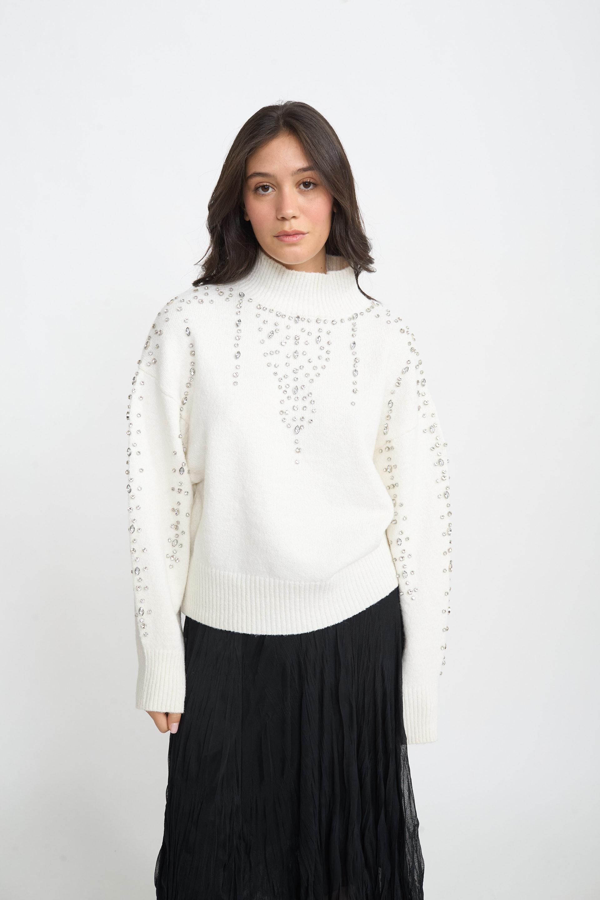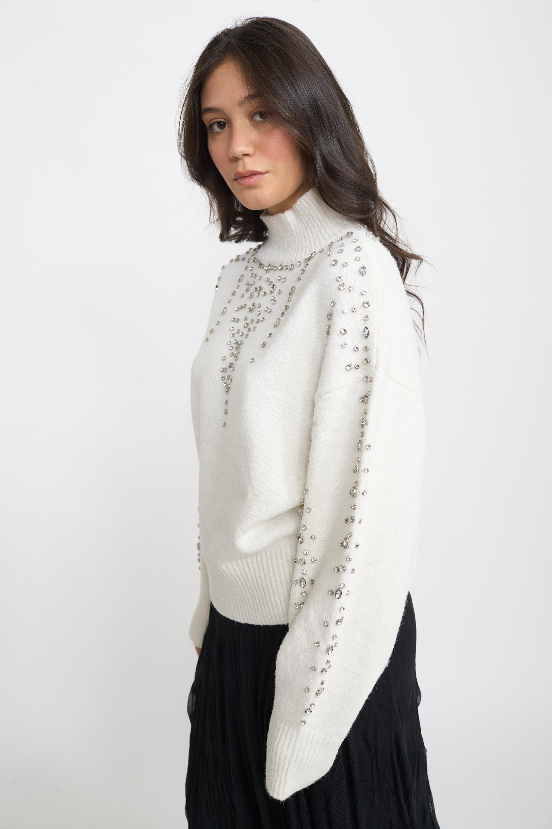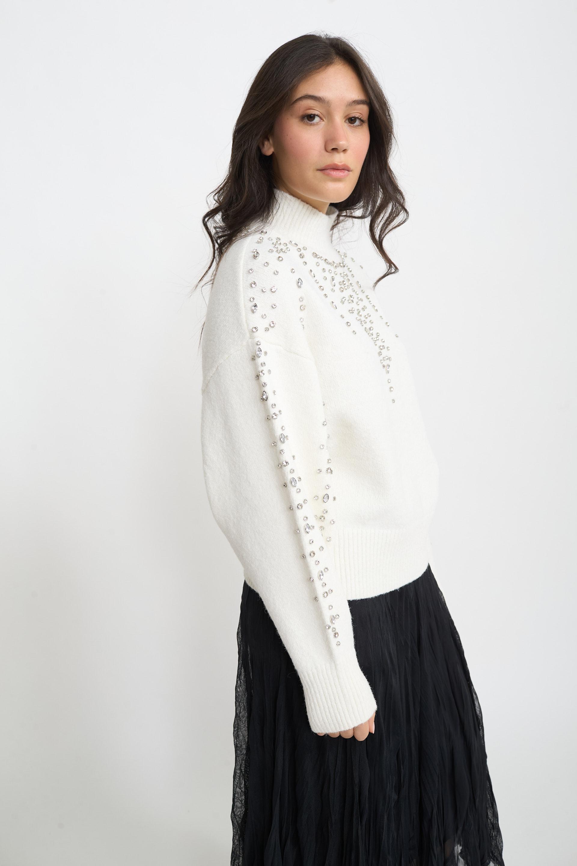 | Maglia collo vulcano con dettaglio di strass applicati. Lavorazione a coste su collo, polsi e orlo. | ||
