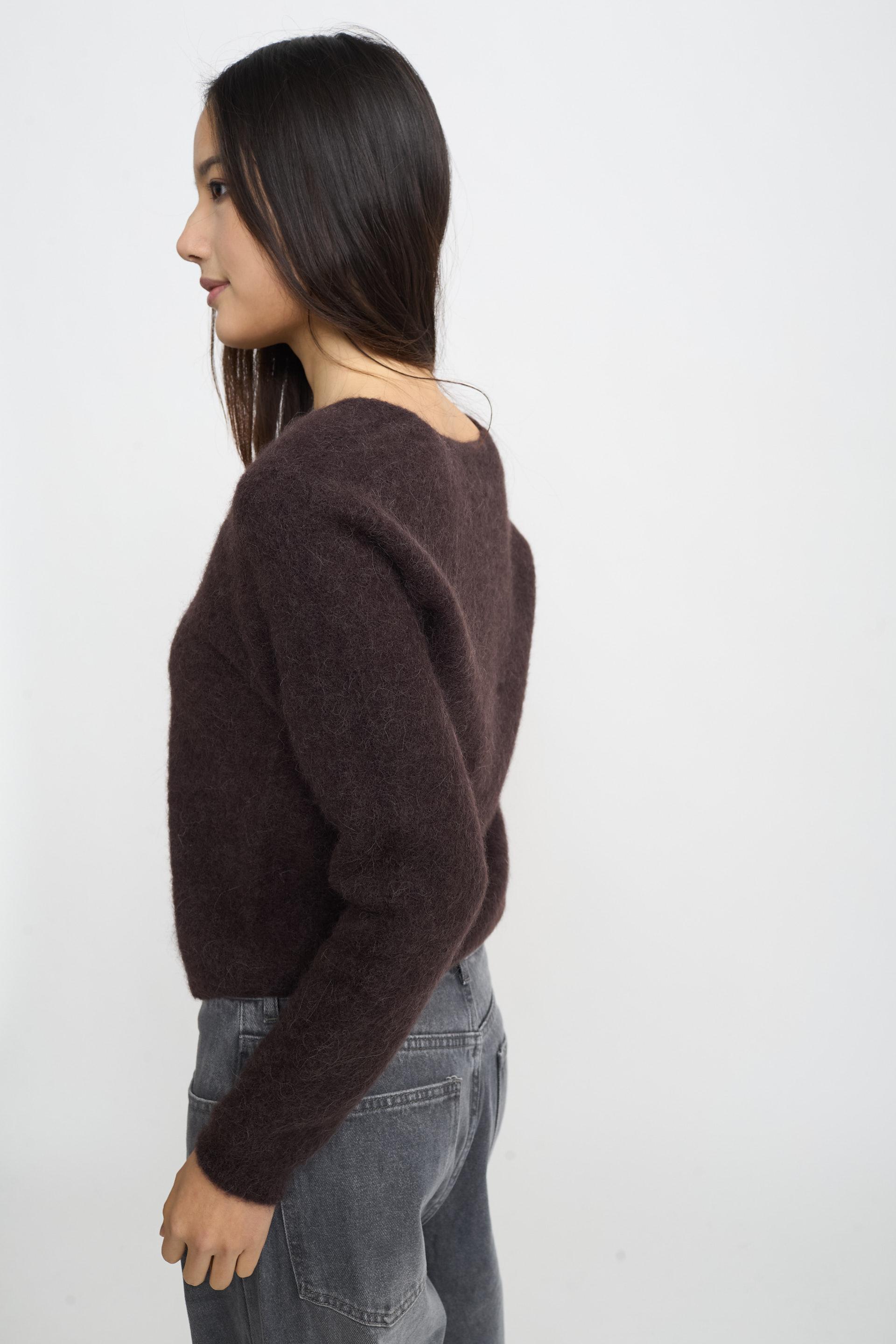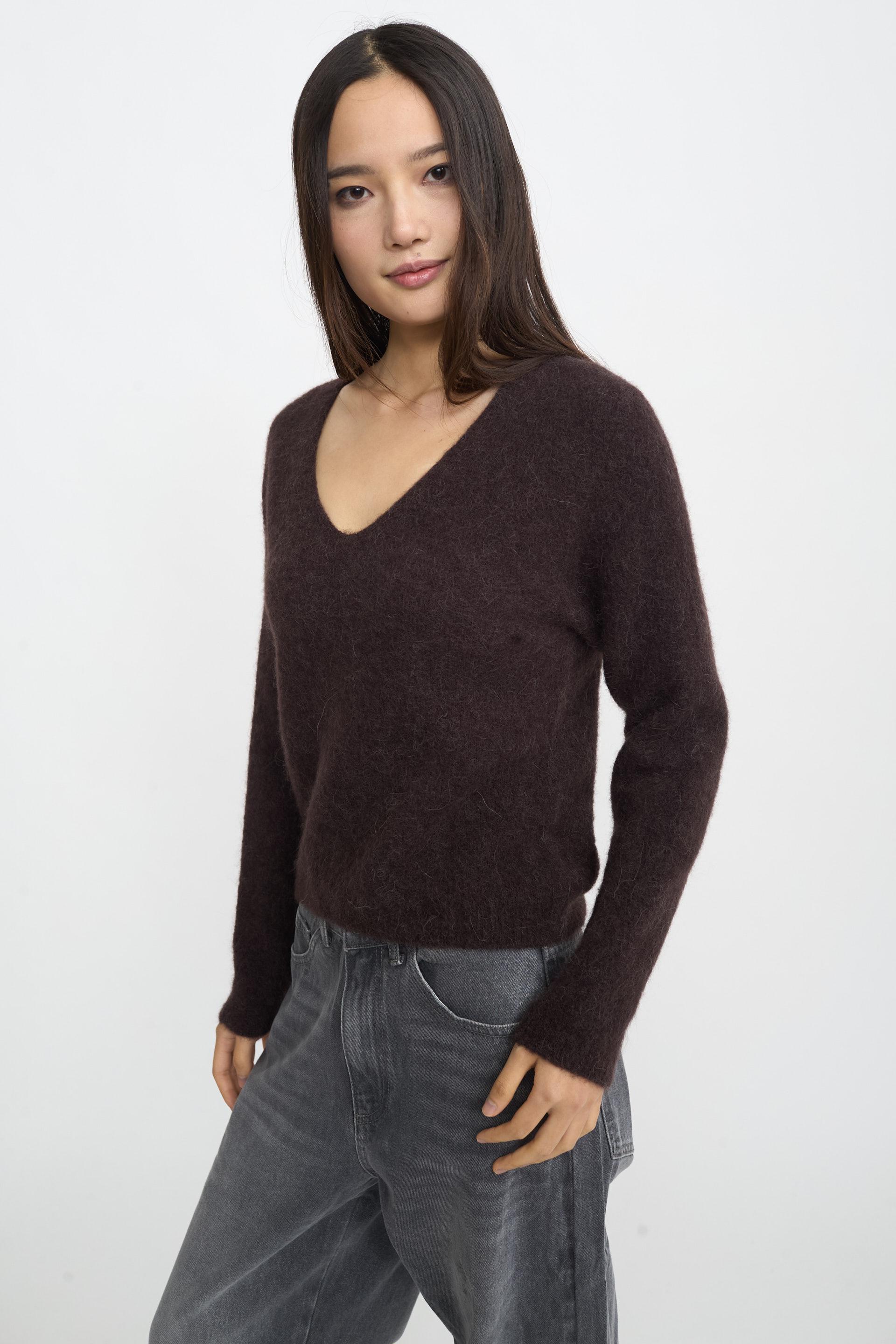 | Maglia scollo V in baby alpaca con dettaglio di lavorazione a coste su polsini e orlo. | ||