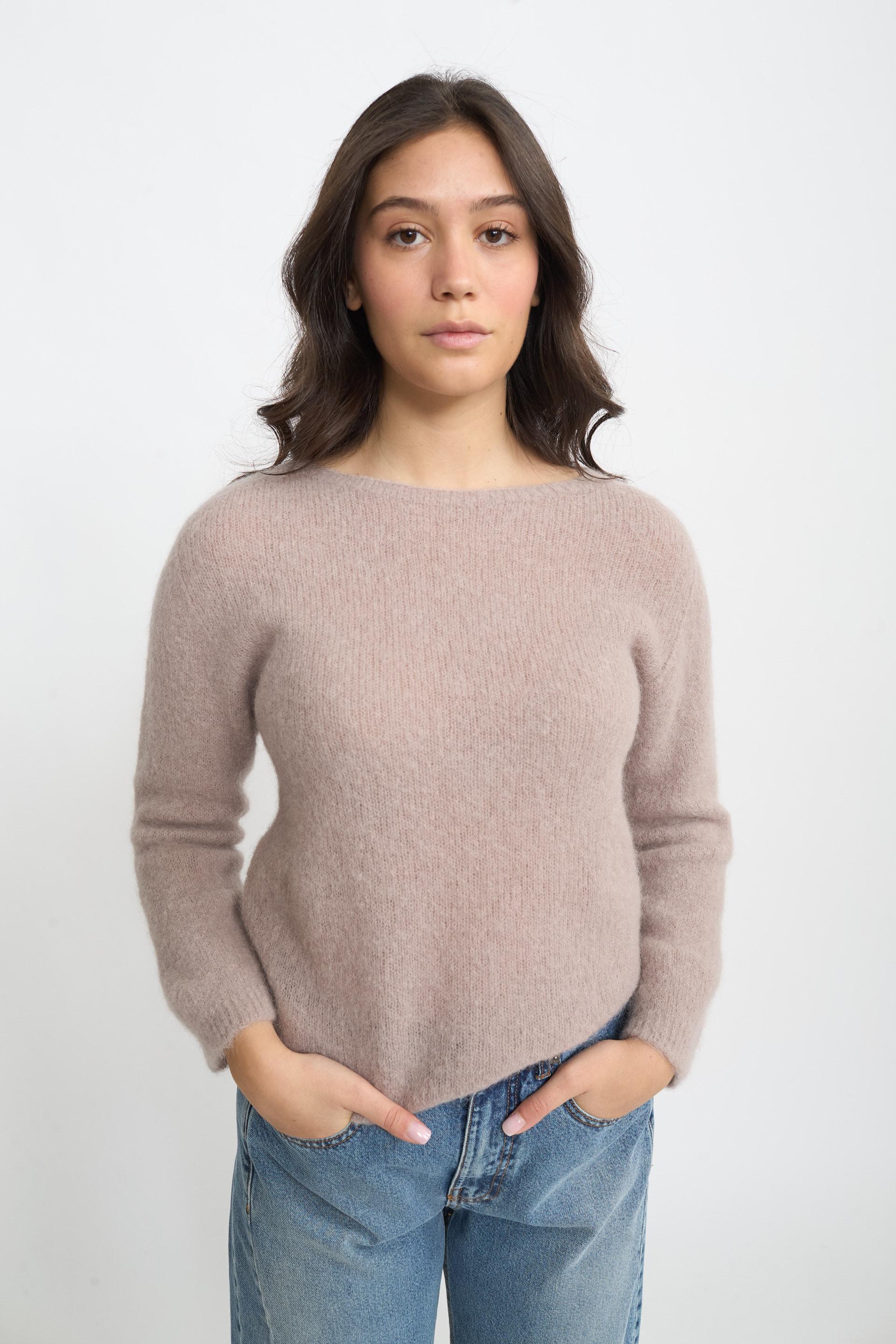 | Maglia scollo barca in baby alpaca con lavorazione a coste su scollo, polsini e orlo. | ||