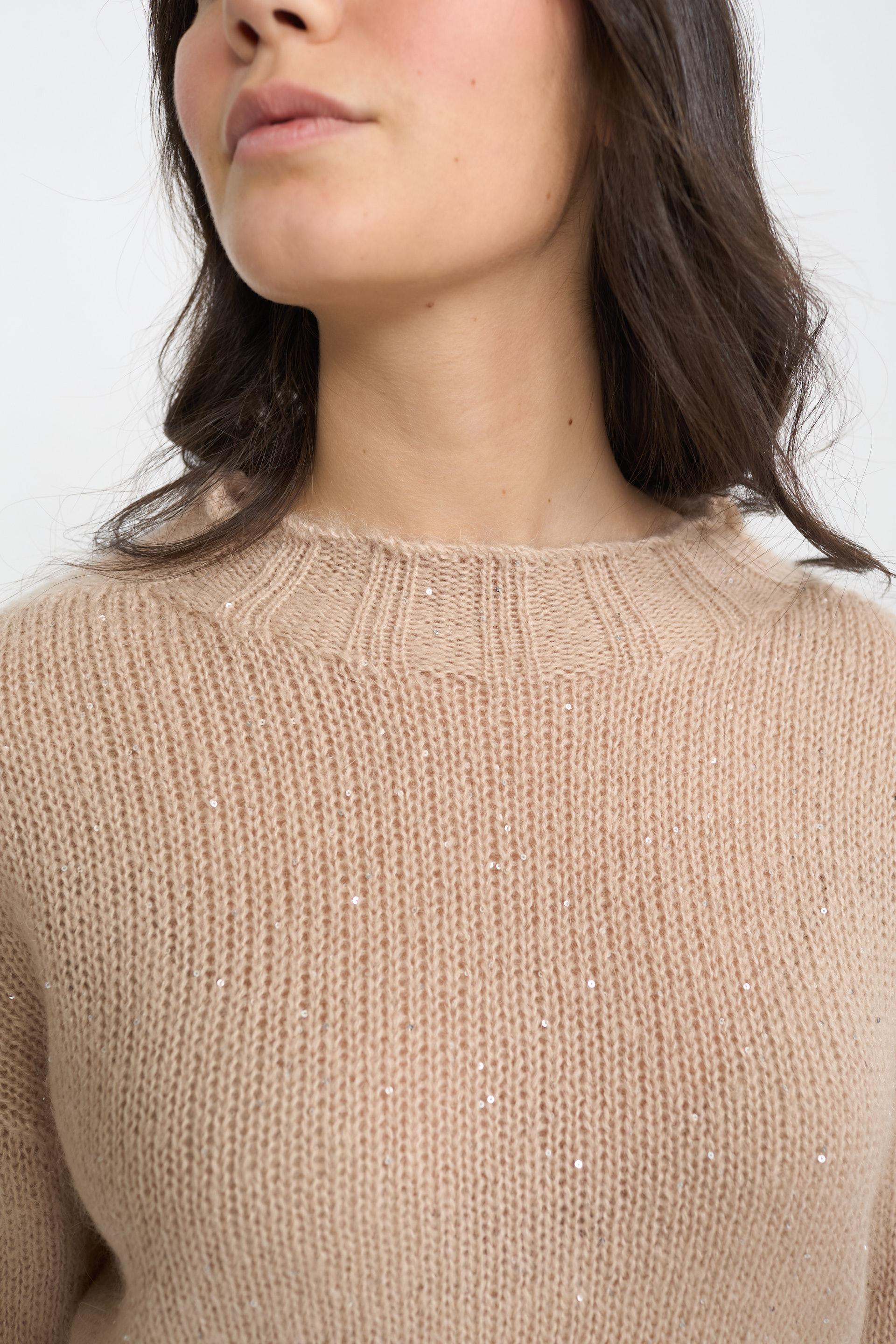 | Maglia paricollo in filato con paillettes. Lavorazione a coste su scollo, polsini e orlo. | ||