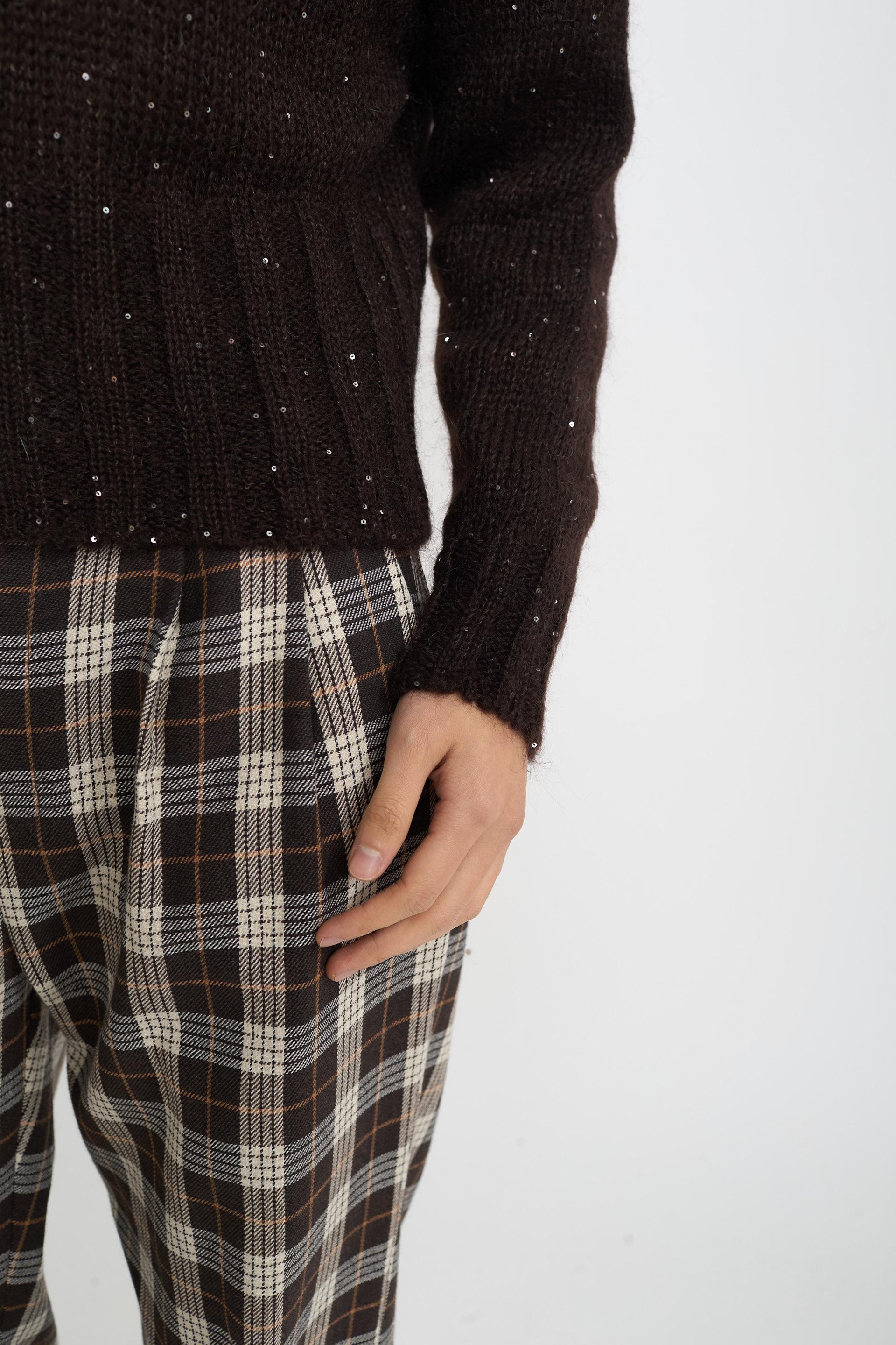 | Maglia paricollo in filato con paillettes. Lavorazione a coste su scollo, polsini e orlo. | ||