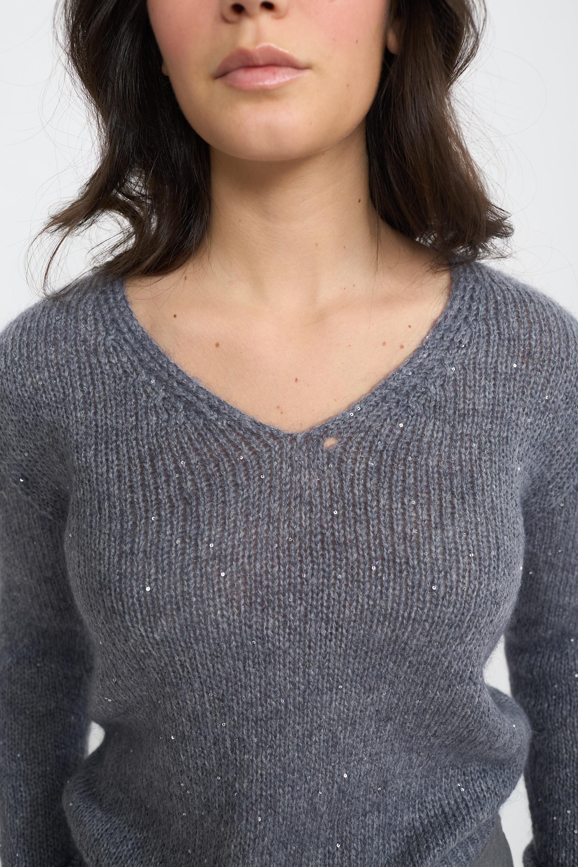 | Maglia scollo V in filato con paillettes. Lavorazione a coste su scollo, polsini e orlo. | ||