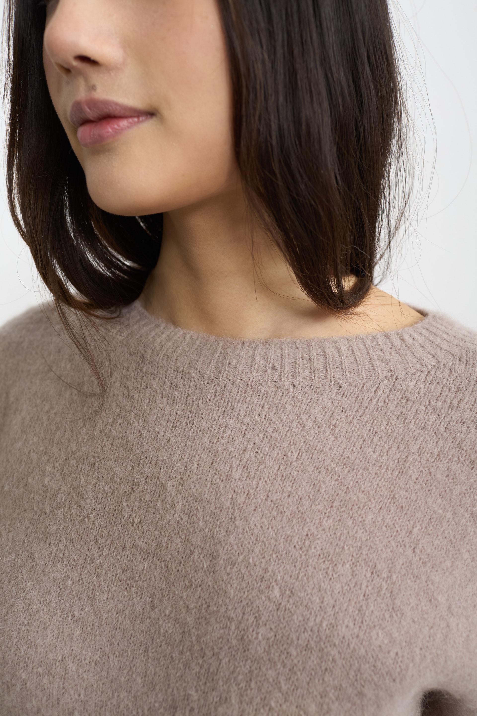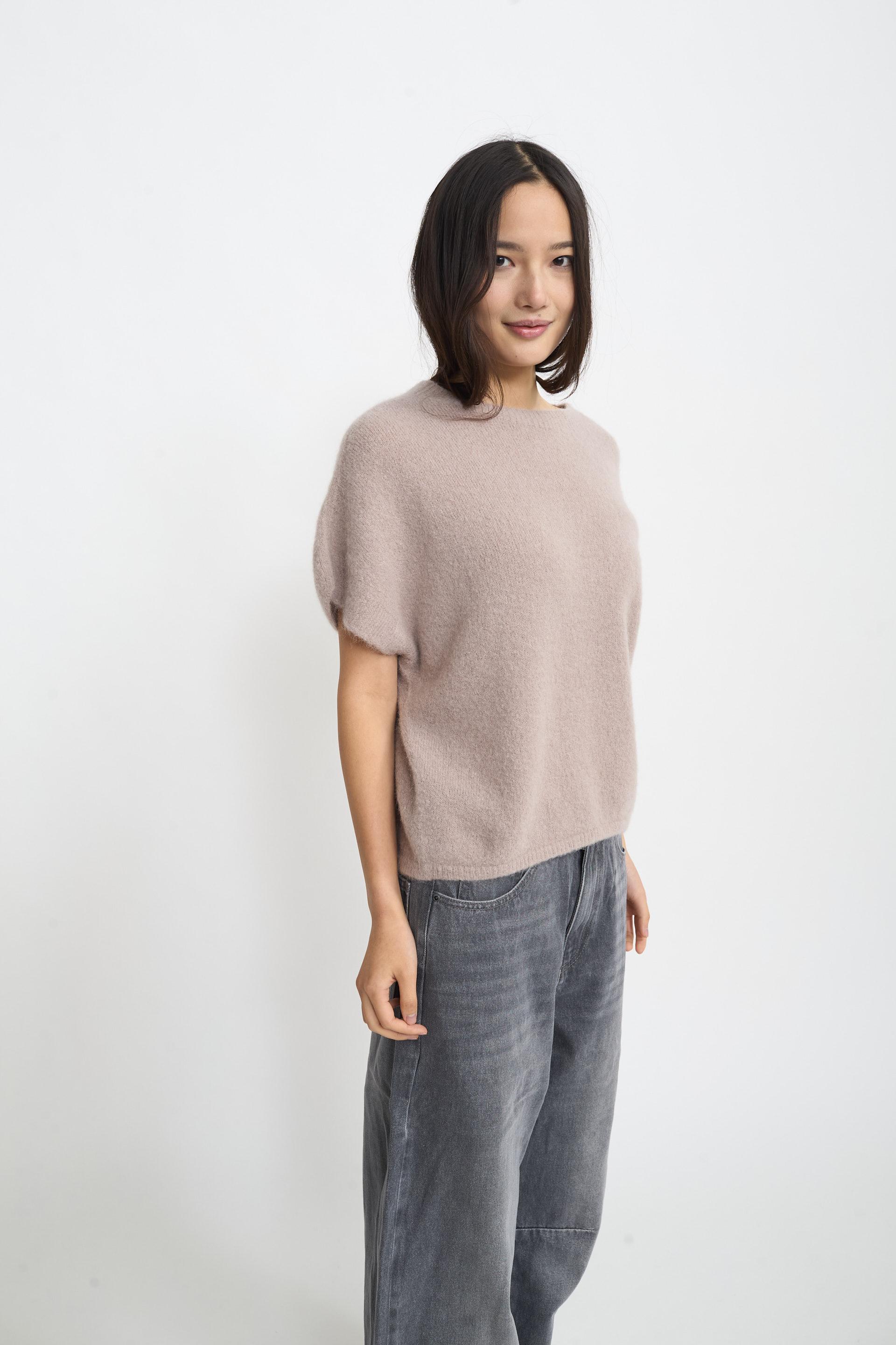 | Maglia girocollo con maniche a kimono in baby alpaca. Dettaglio di lavorazione a coste su scollo giromanica e orlo. | ||