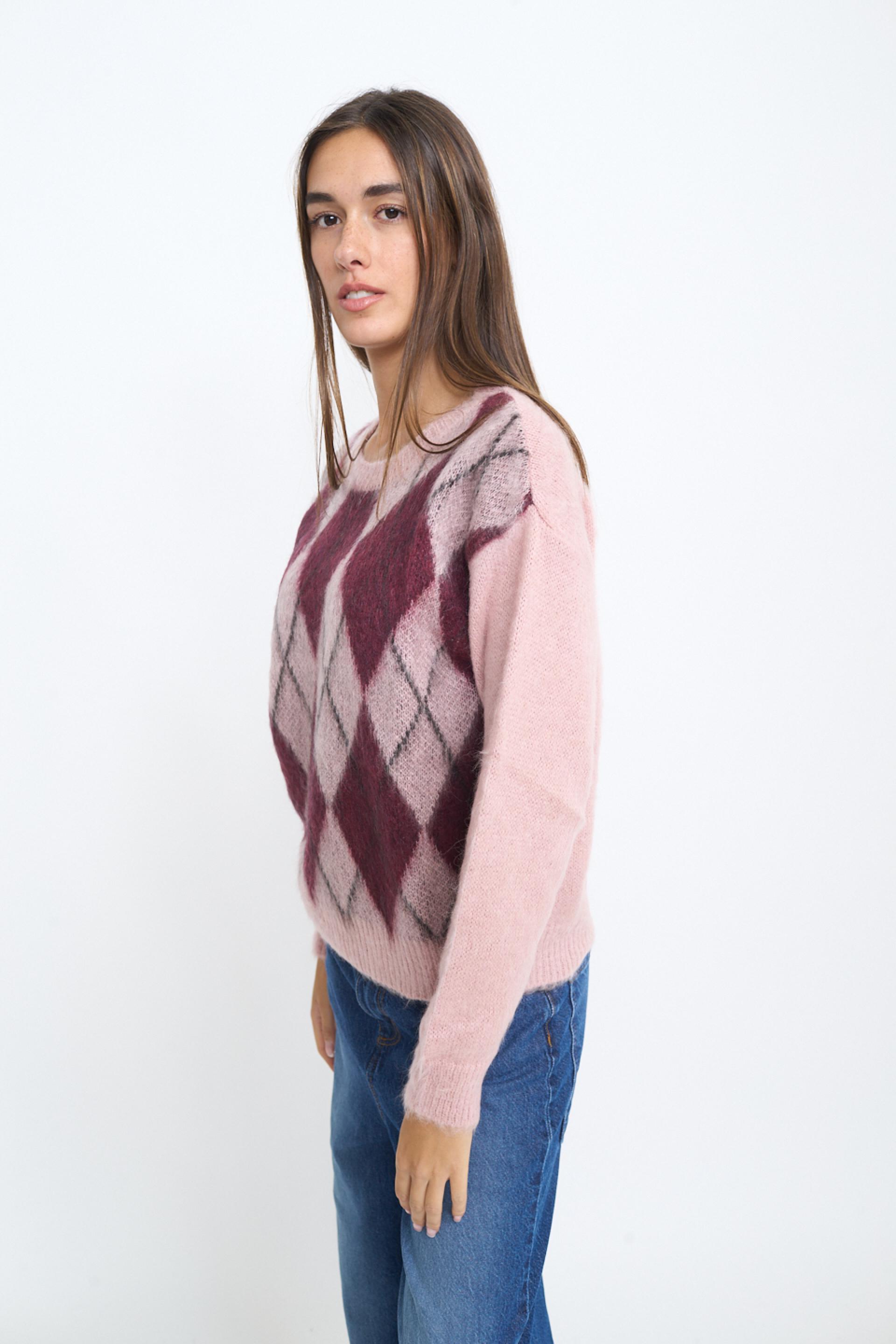| Maglia rombi scollo rotondo con dettaglio di lavorazione a coste su collo, polsini e orlo. | ||