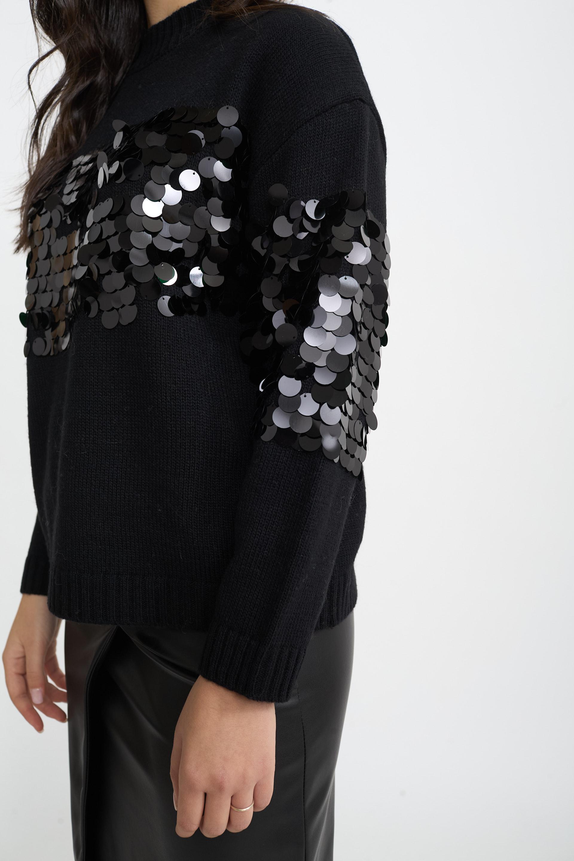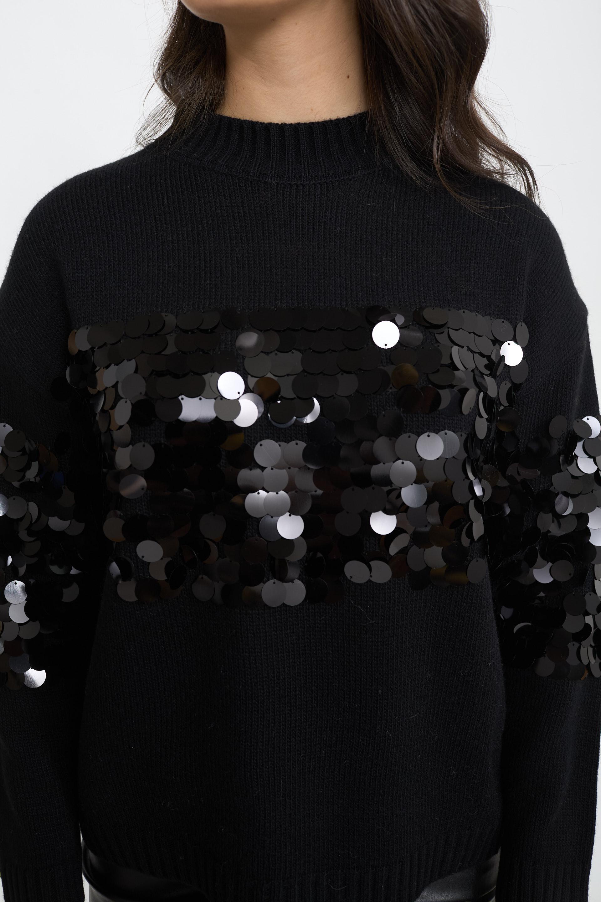 | Maglia paricollo in misto lana con paillettes grandi centrali. | ||