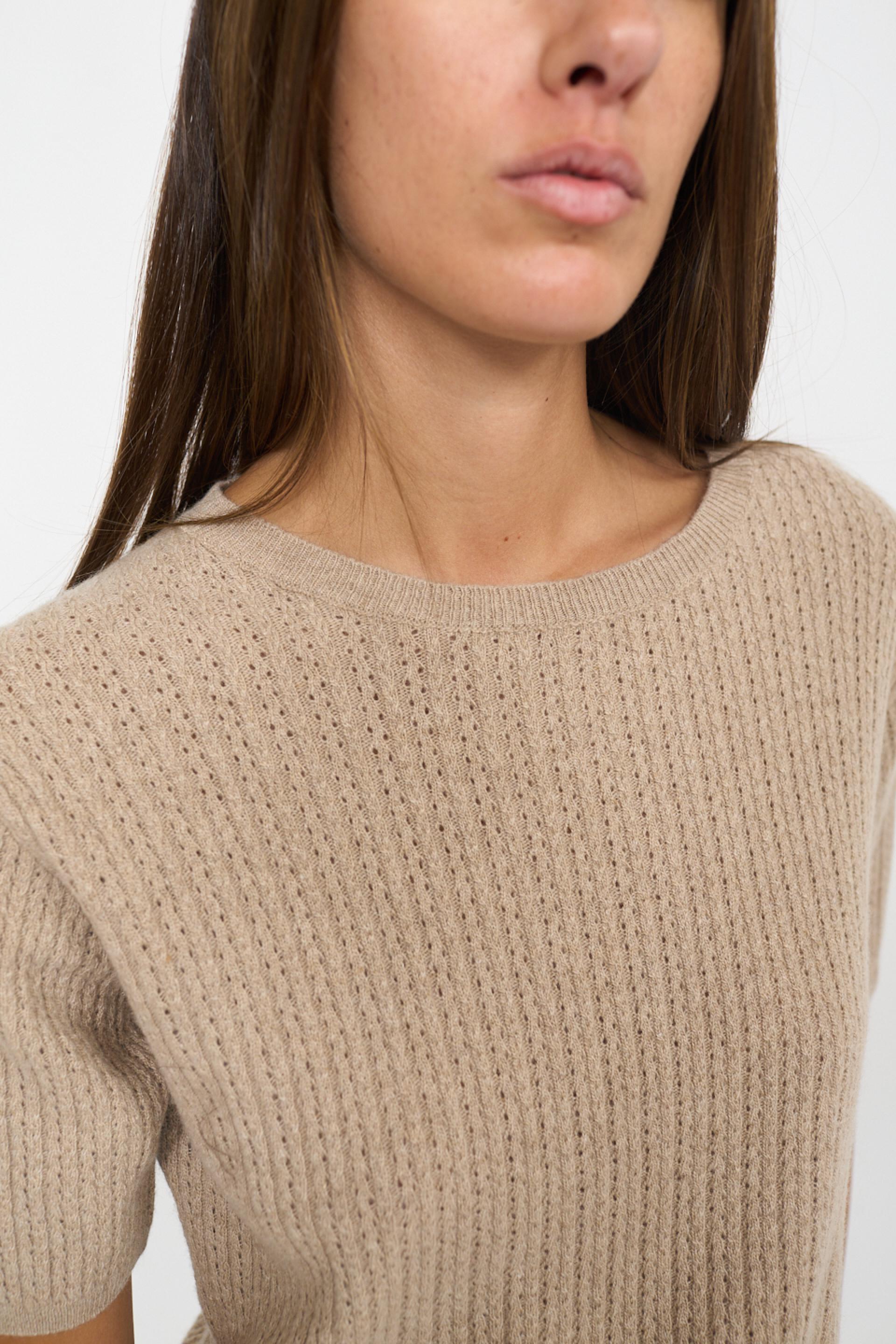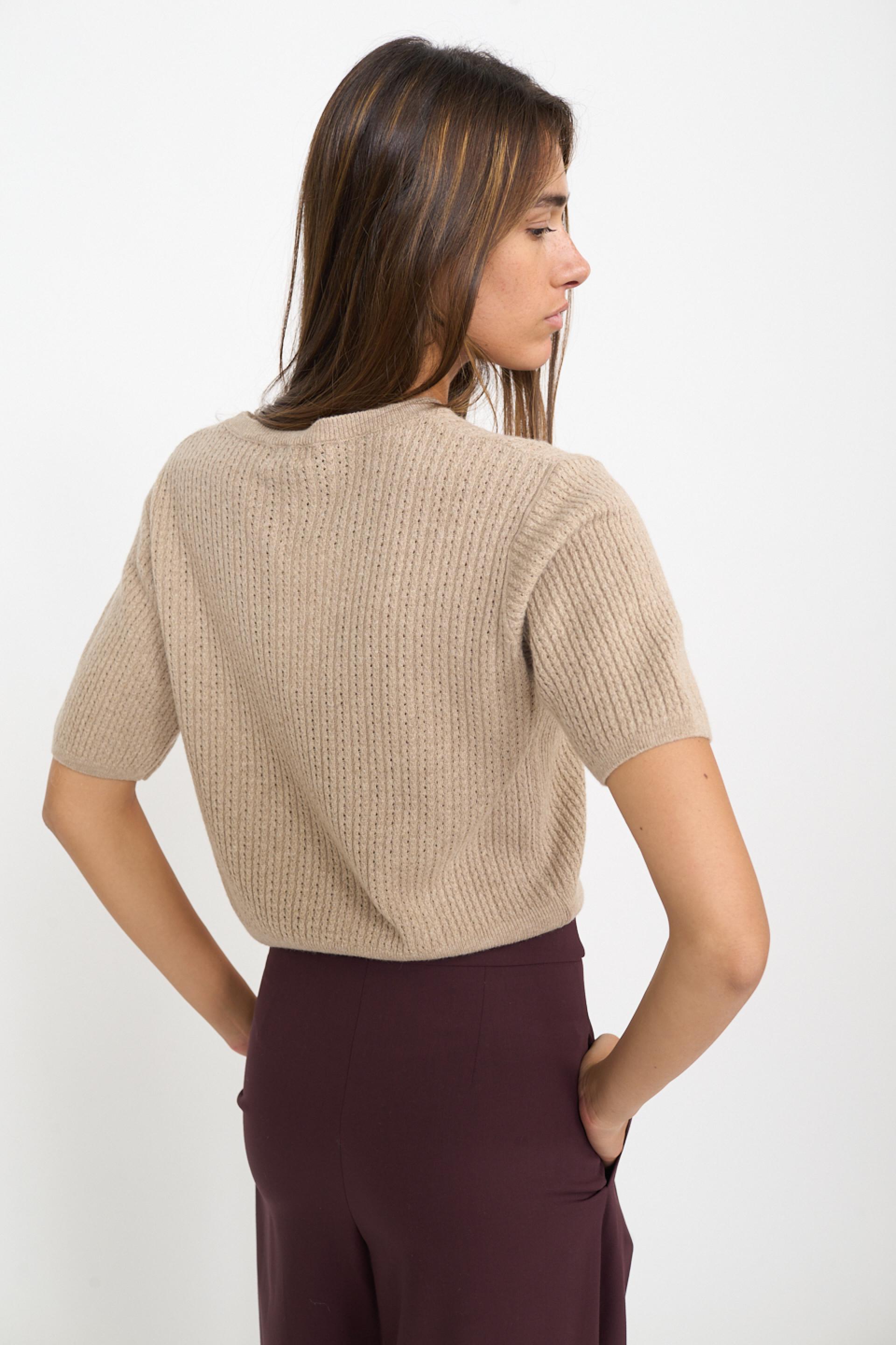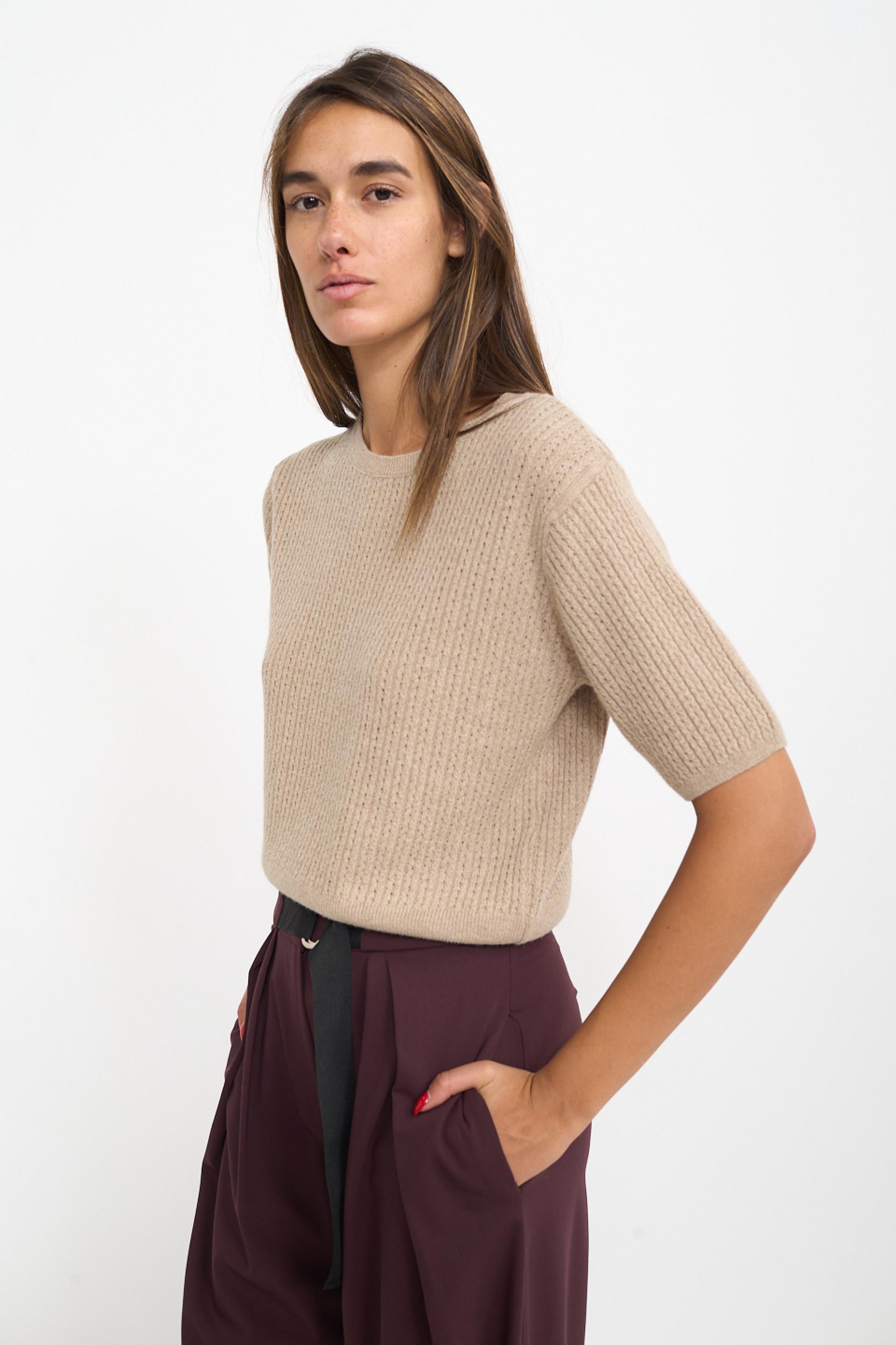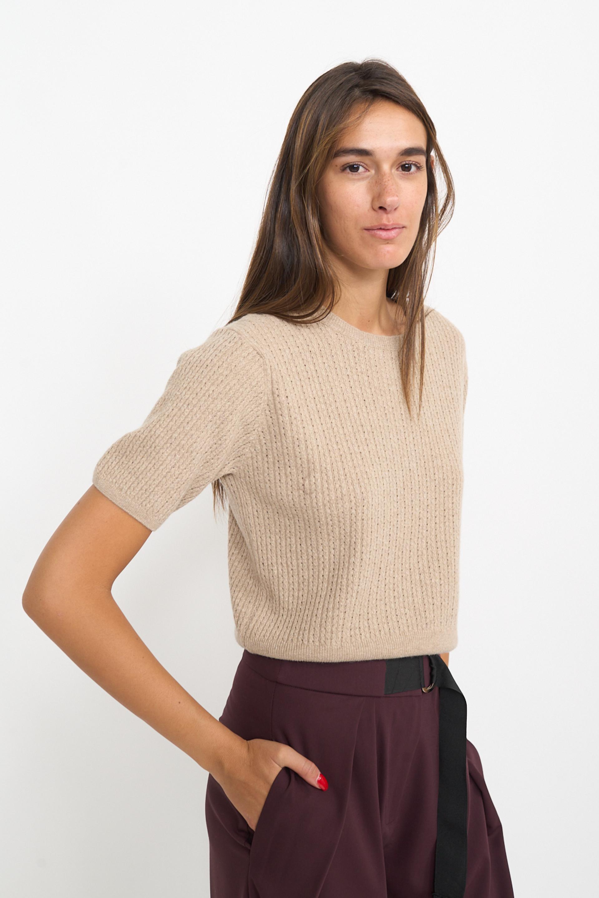 | Maglia scollo rotondo a mezza manica in misto lana, viscosa e cachemire. Filato con lavorazione a treccine con piccoli trafori. Dettaglio di lavorazione a costine su scollo, fine manica e orlo. | ||