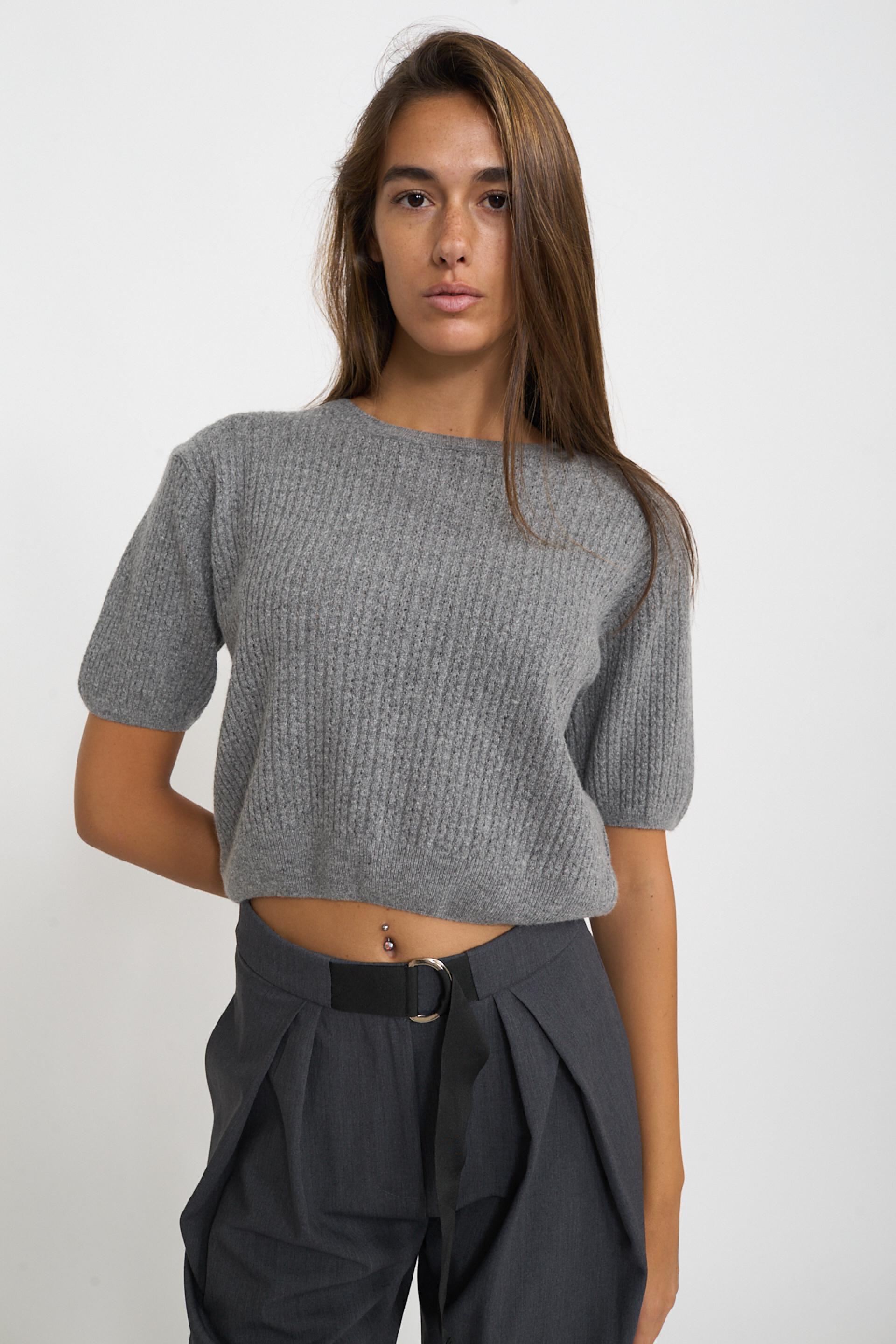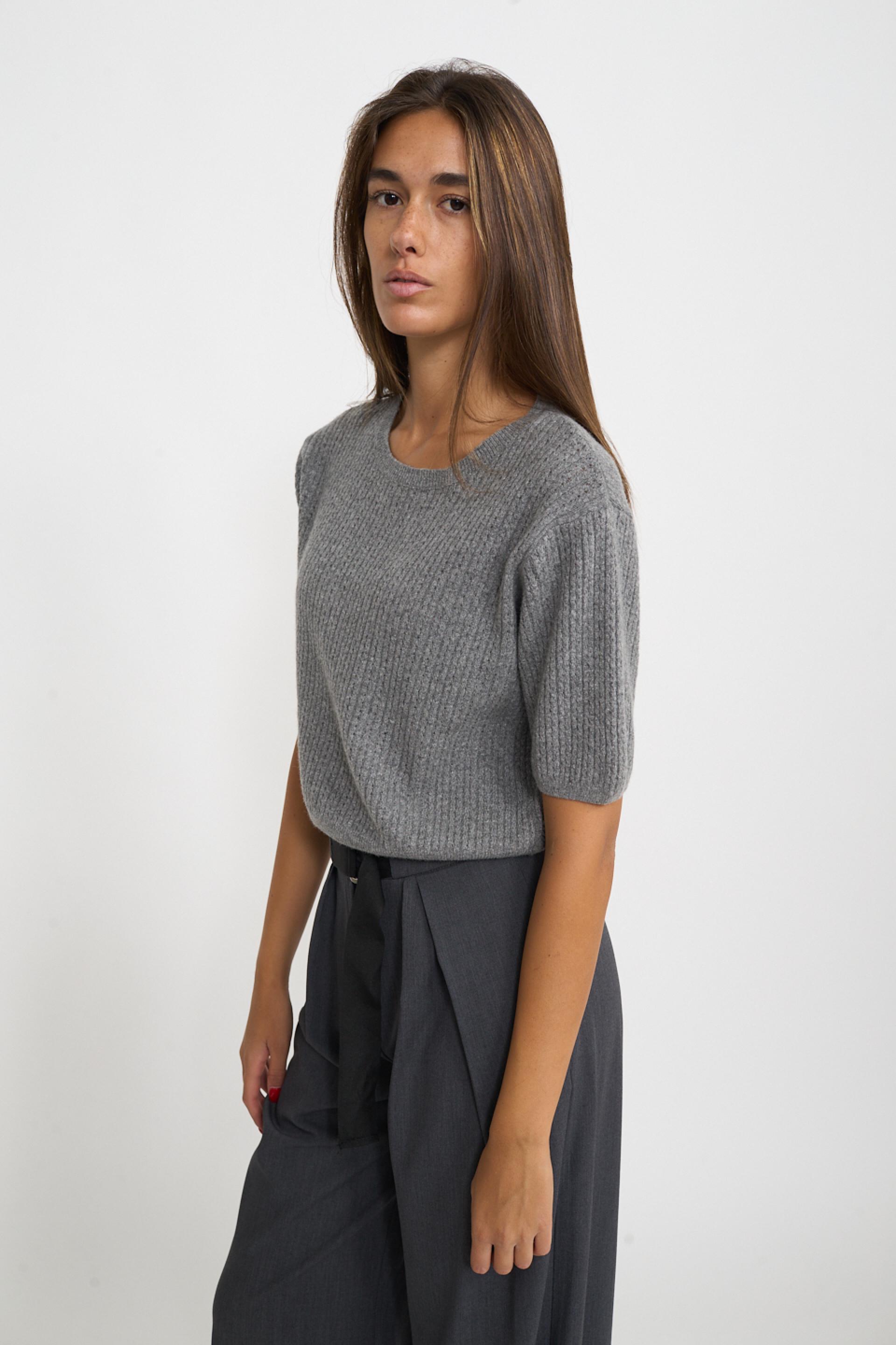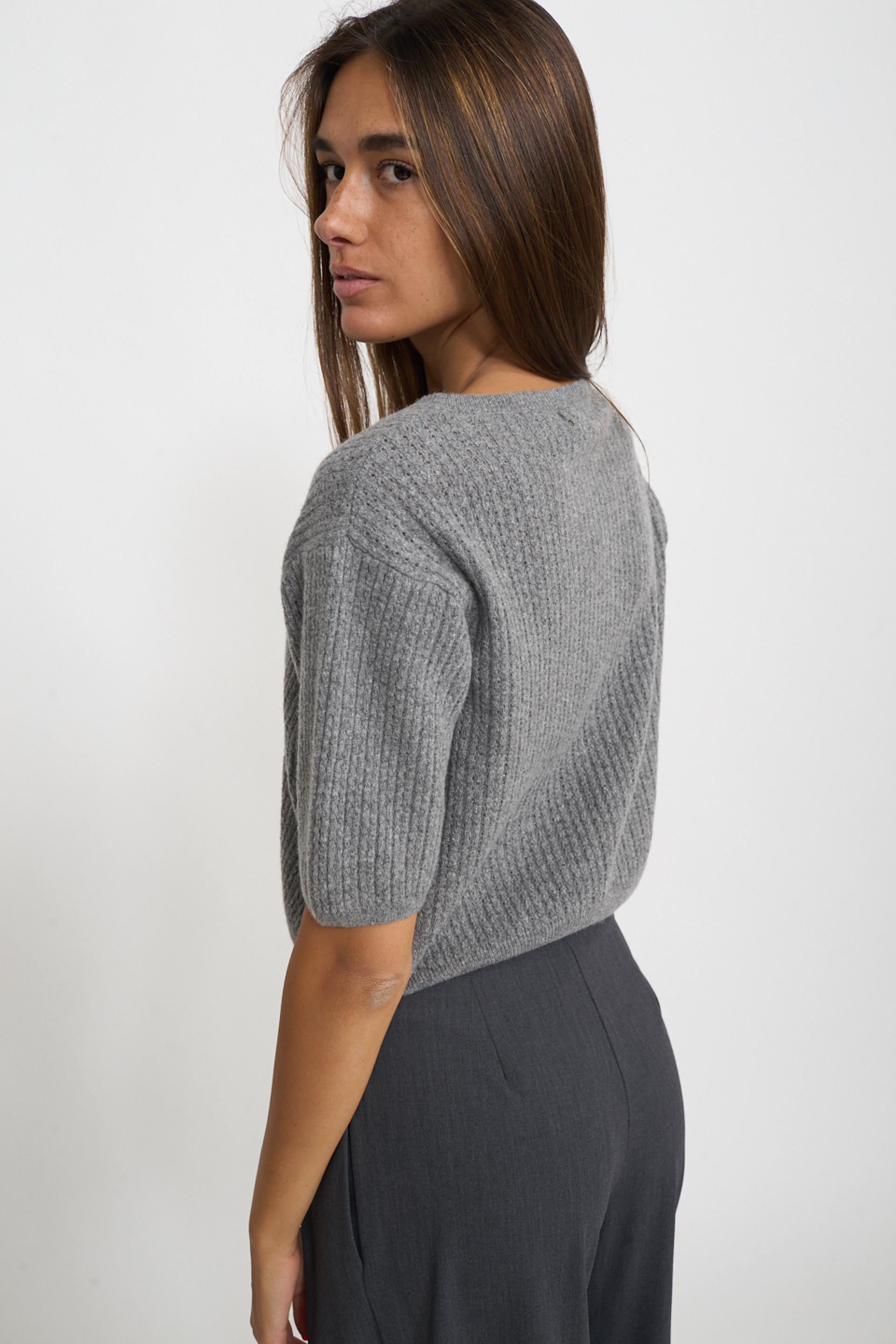| Maglia scollo rotondo a mezza manica in misto lana, viscosa e cachemire. Filato con lavorazione a treccine con piccoli trafori. Dettaglio di lavorazione a costine su scollo, fine manica e orlo. | ||