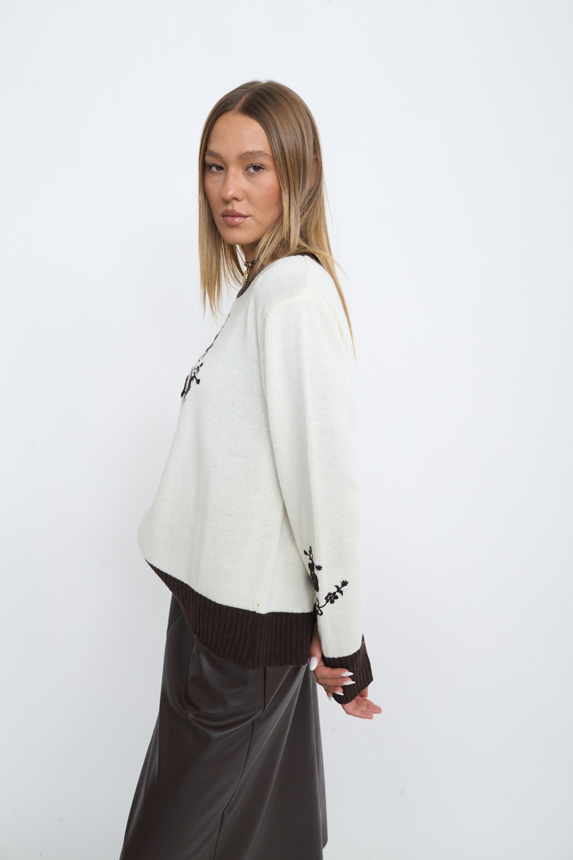 | Maglia in misto cachemire con fiori ricamati sul petto e sule maniche. Dettaglio di lavorazione a coste su scollo, polsini e orlo. | ||