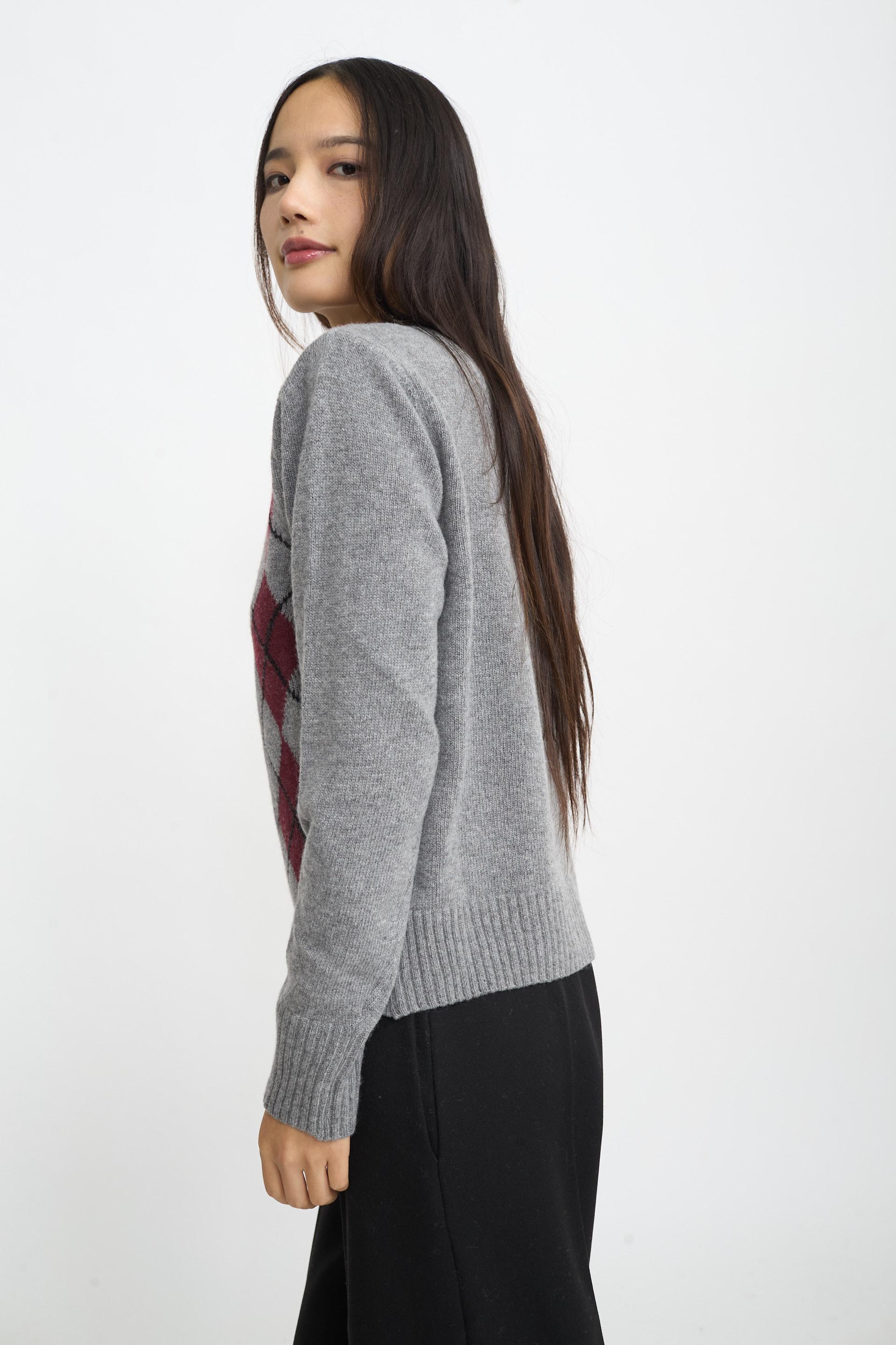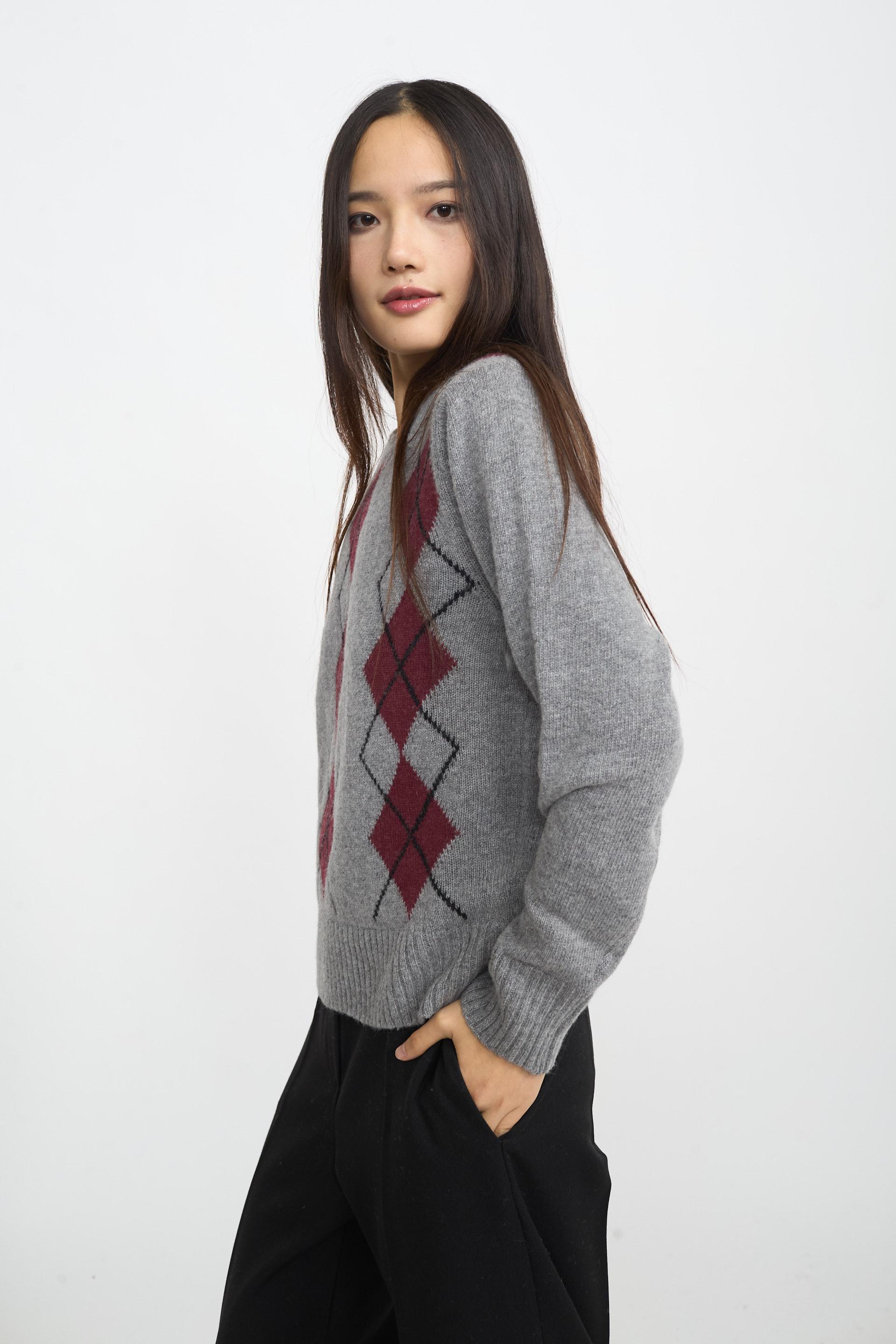 | Maglia girocollo in misto cachemire fantasia rombi. Lavorazione a costine su scollo, polsini e orlo. | ||
