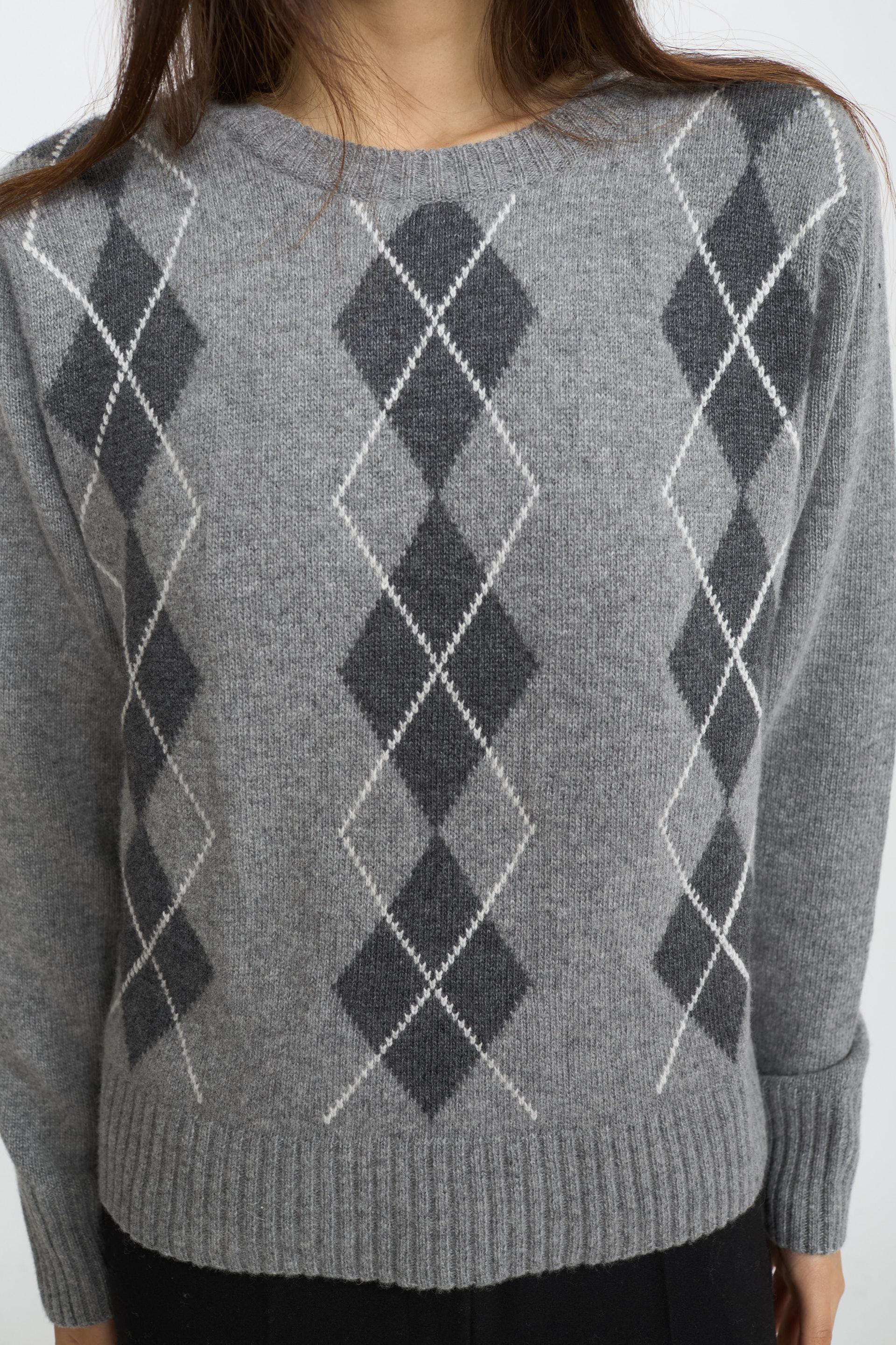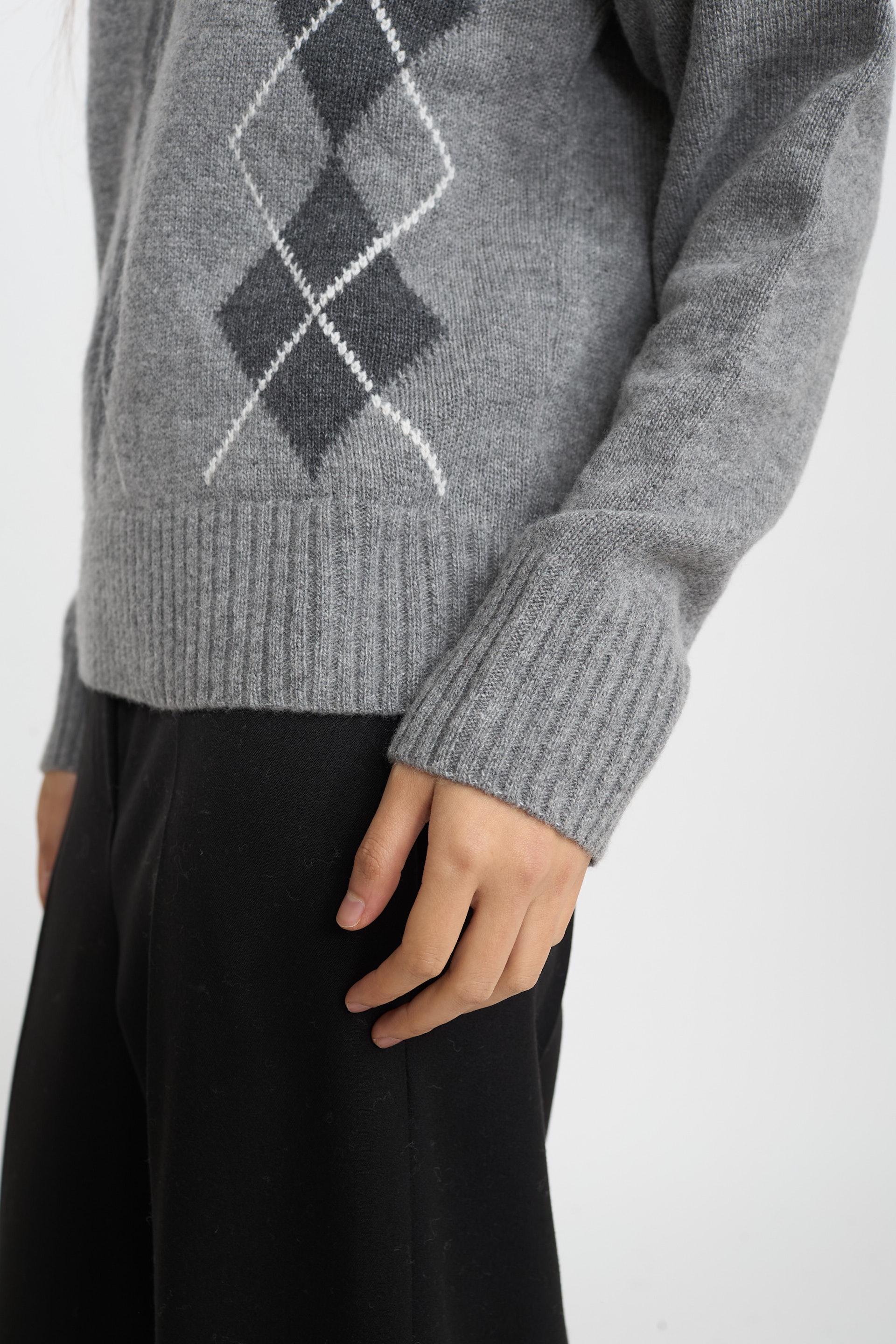 | Maglia girocollo in misto cachemire fantasia rombi. Lavorazione a costine su scollo, polsini e orlo. | ||