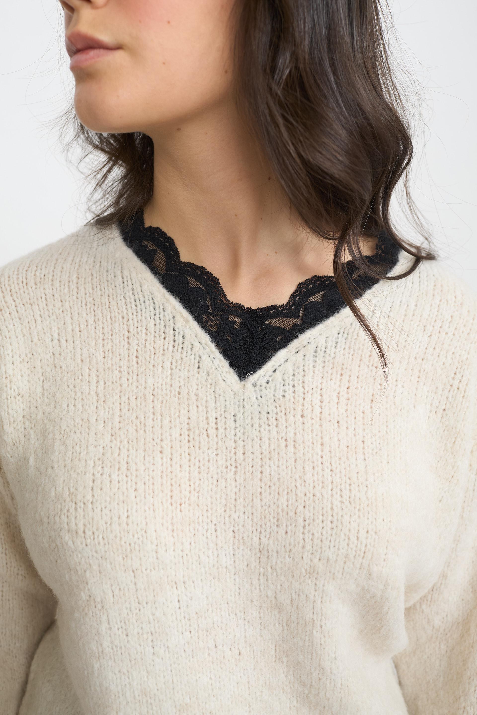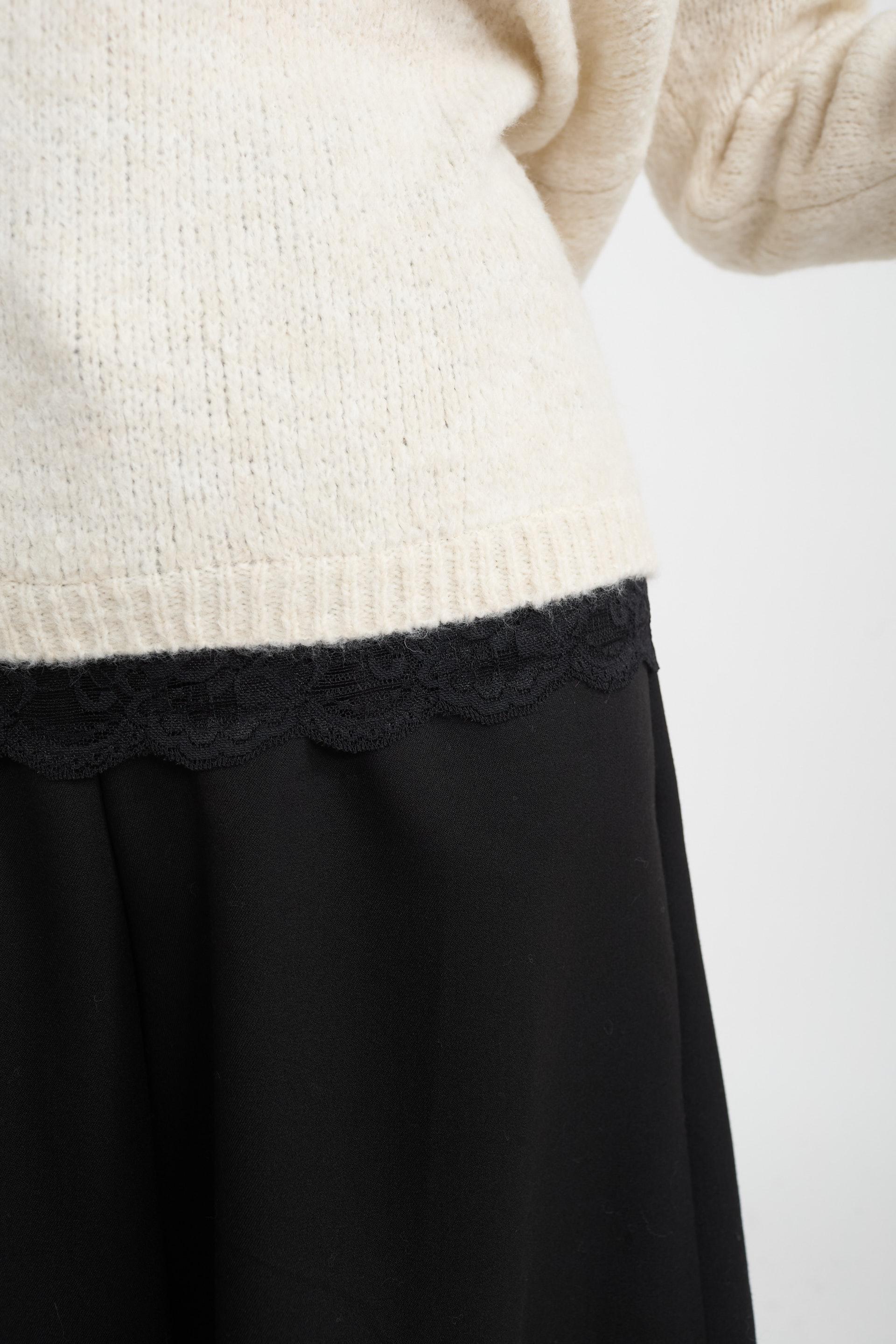 | Maglia scollo V in misto lana e viscosa con dettaglio di fascia in pizzo su scollo e orlo. | ||