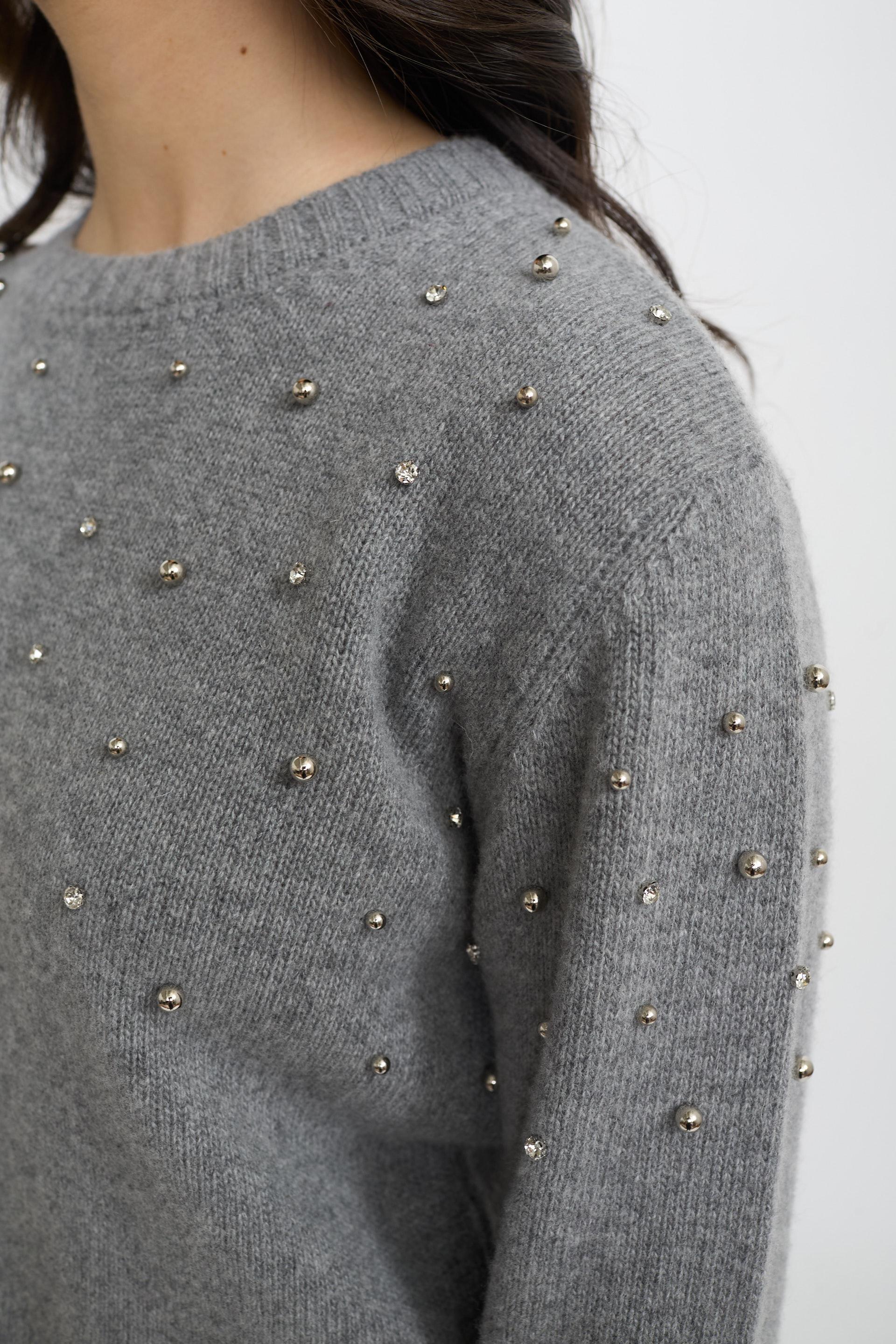| Maglia girocollo in misto cachemire con applicazioni di borchie sferiche e strass. Lavorazione a coste su scollo, polsini e orlo. | ||