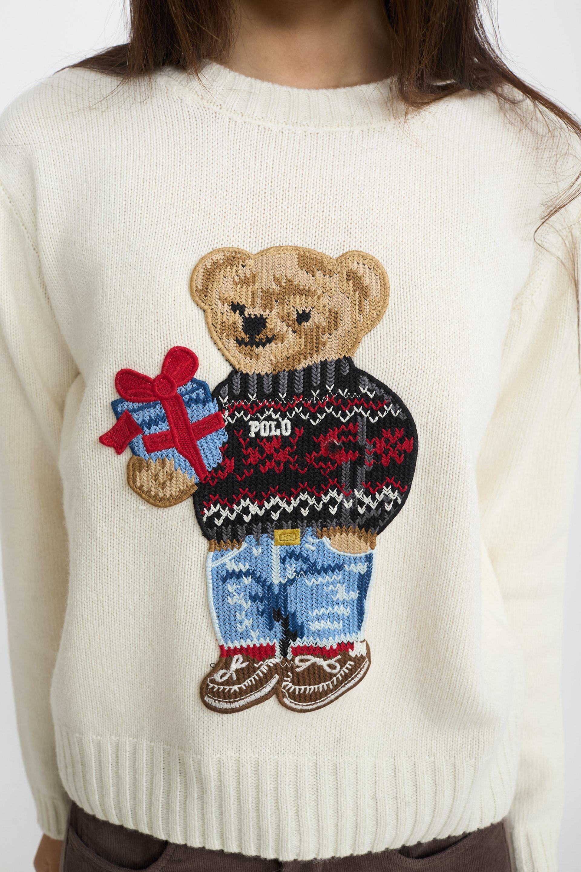 | Maglia girocollo in misto cachemire con patch ricamata Teddy sweater. Lavorazione a coste su scollo, polsini e orlo. | ||
