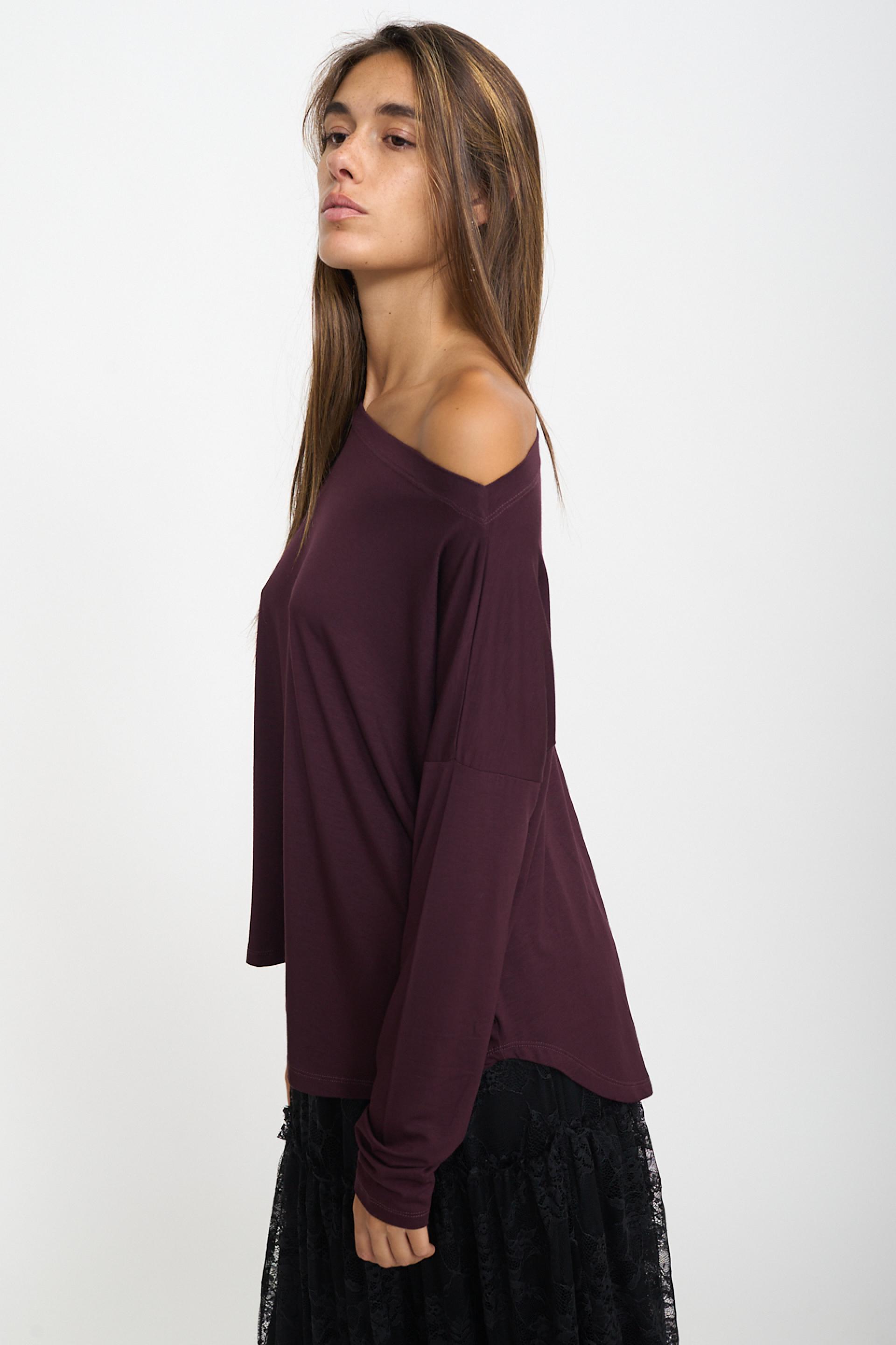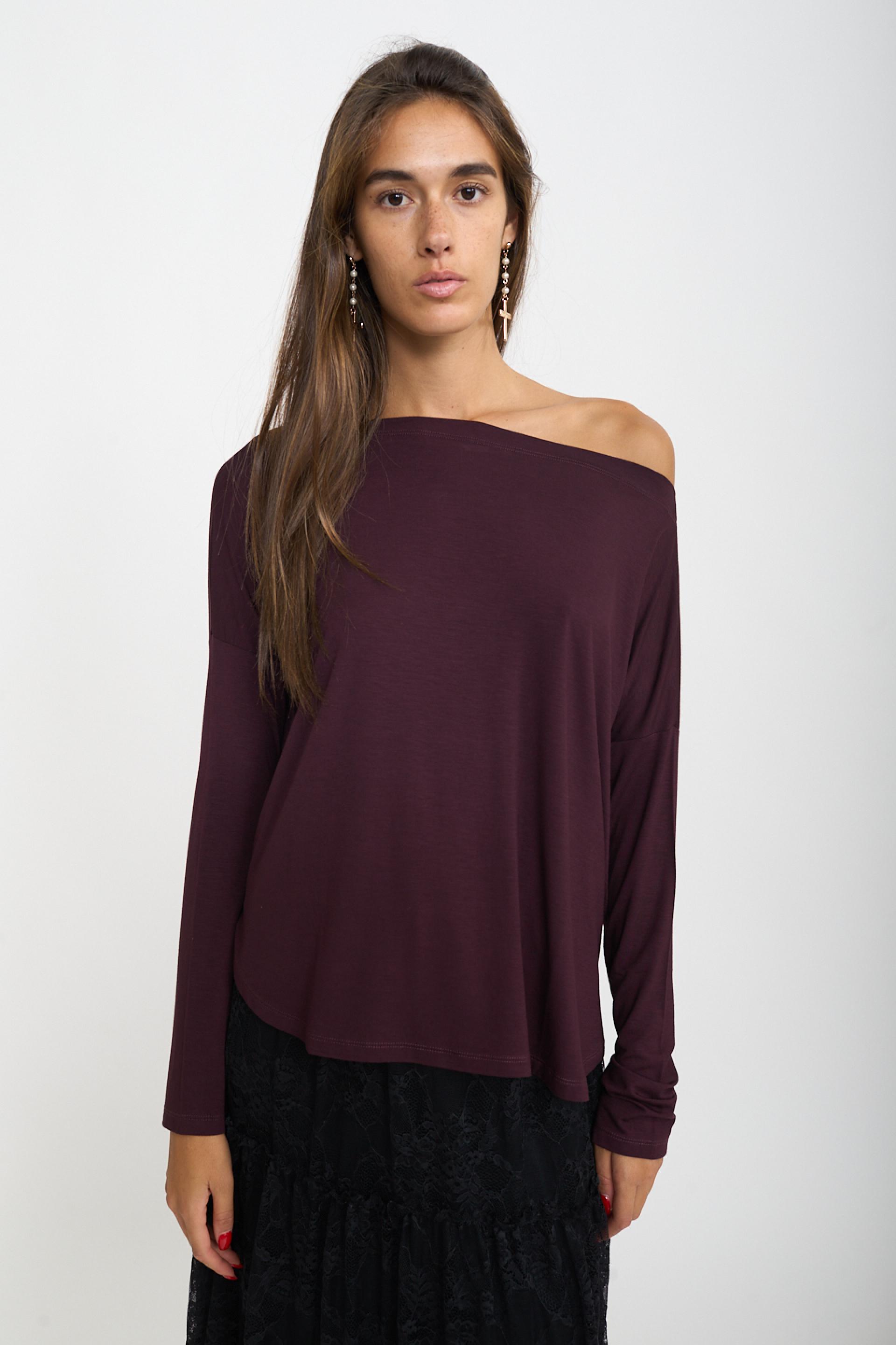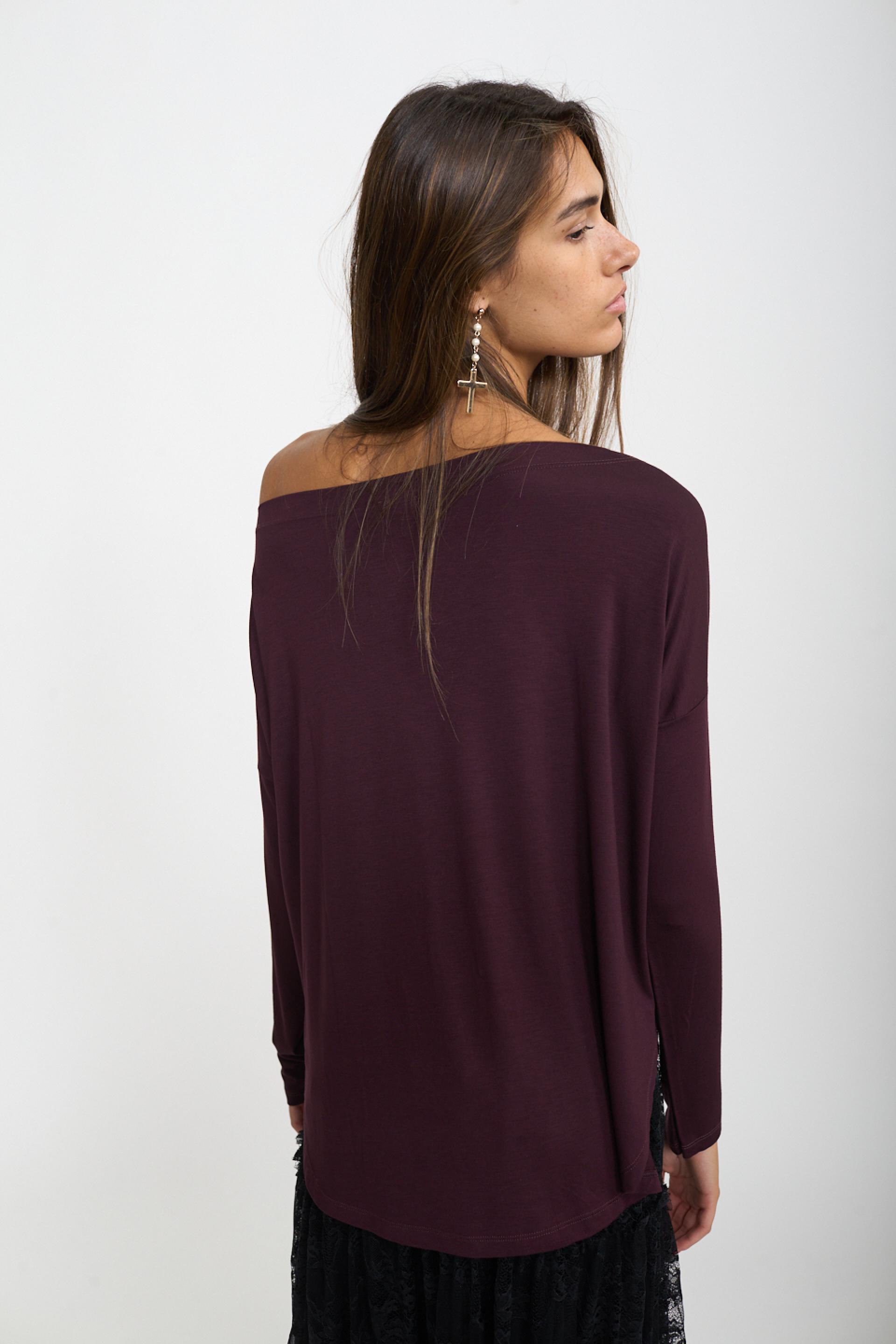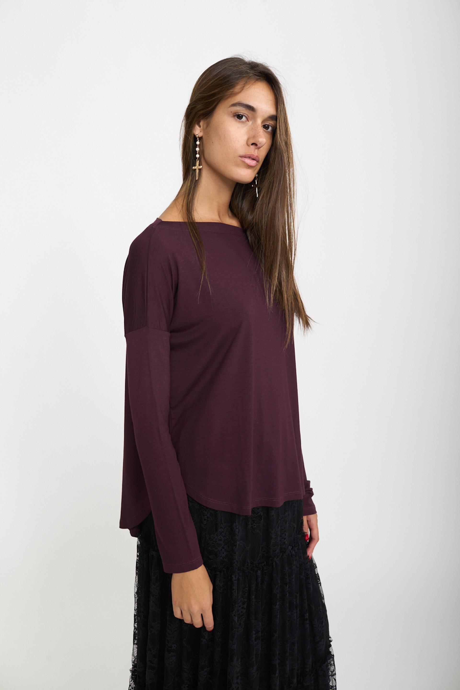 | Maxi maglia scollo a barca in viscosa con dettaglio di orlo leggermente asimmetrico e stondato. | ||