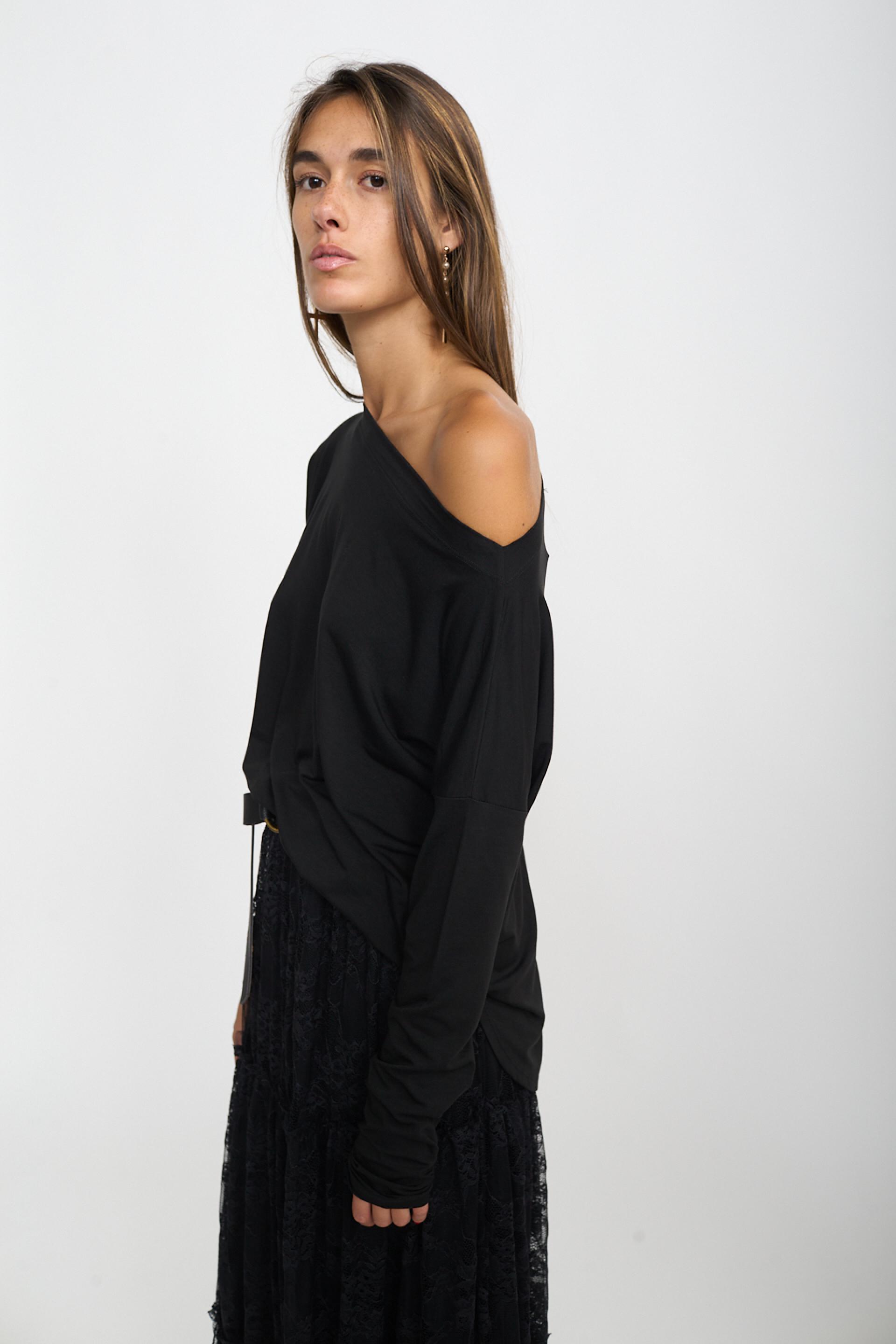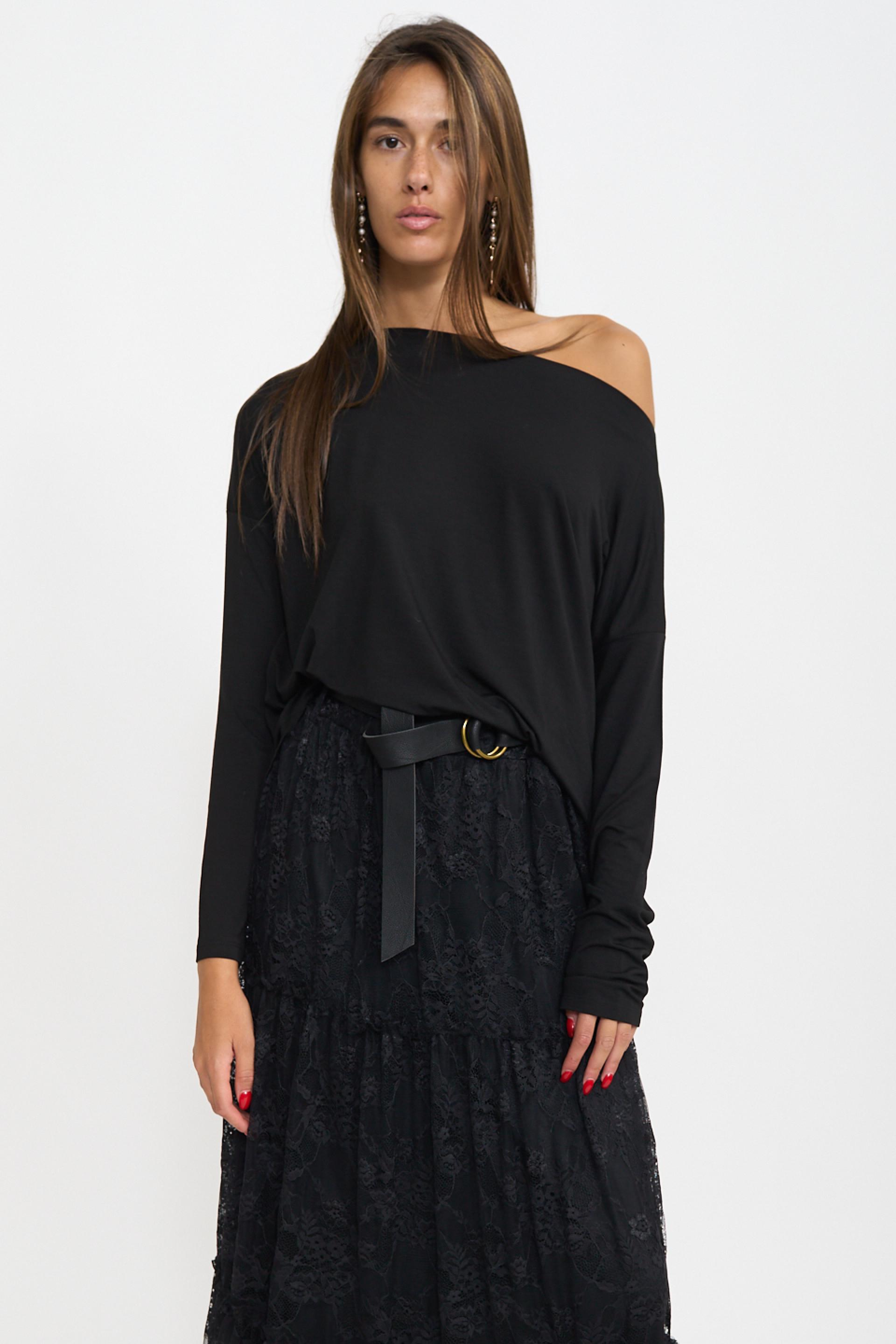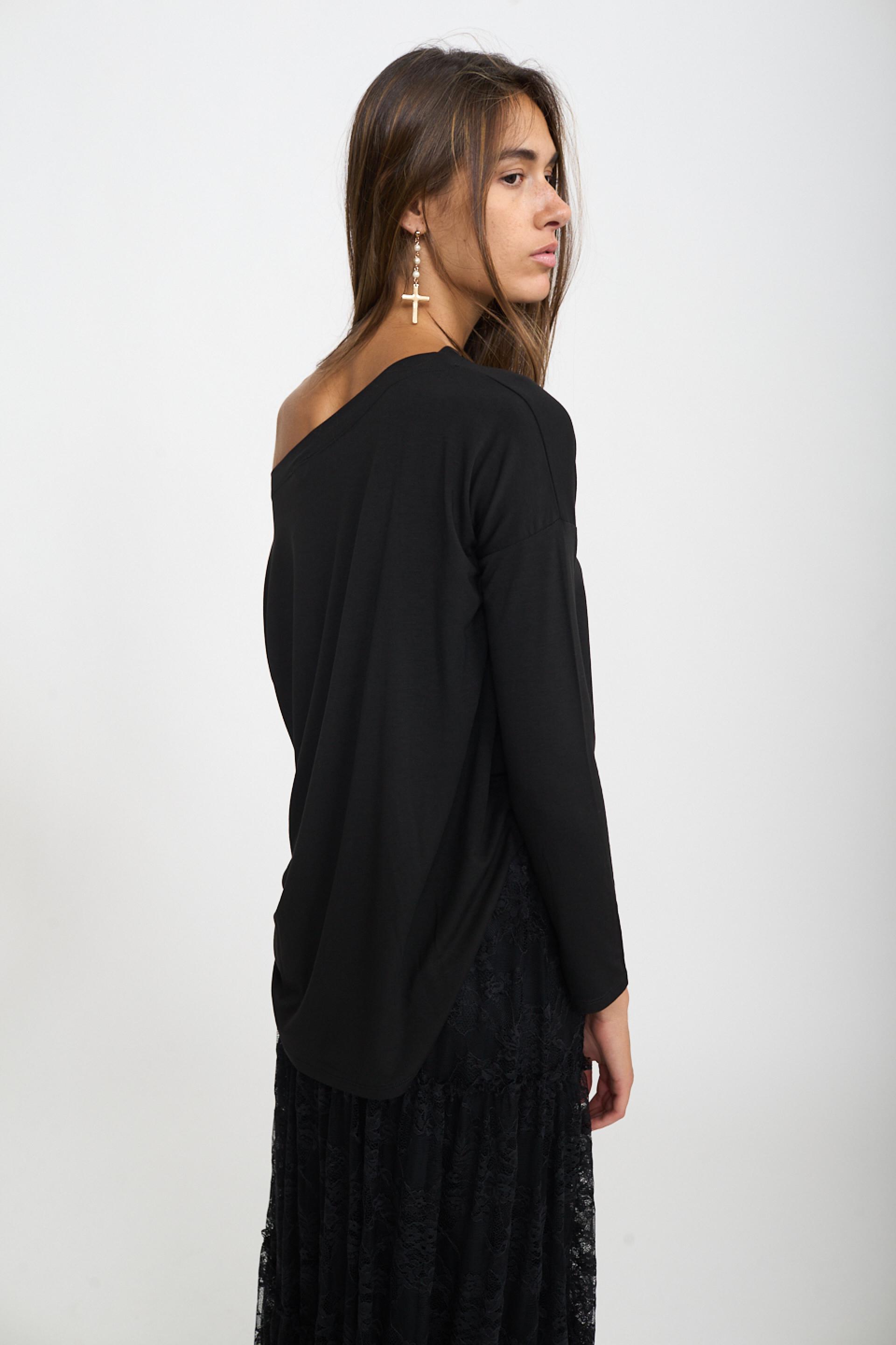| Maxi maglia scollo a barca in viscosa con dettaglio di orlo leggermente asimmetrico e stondato. | ||