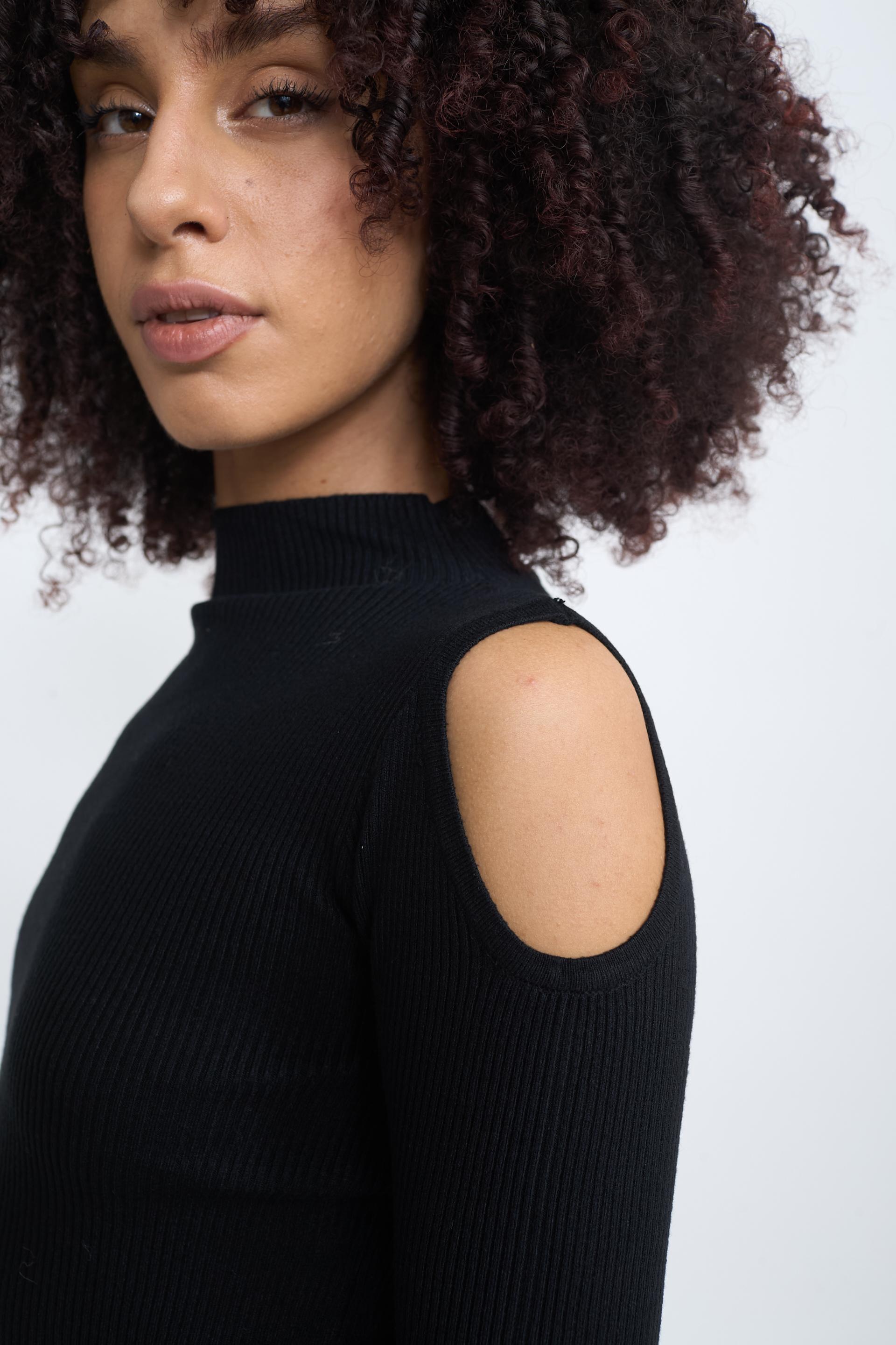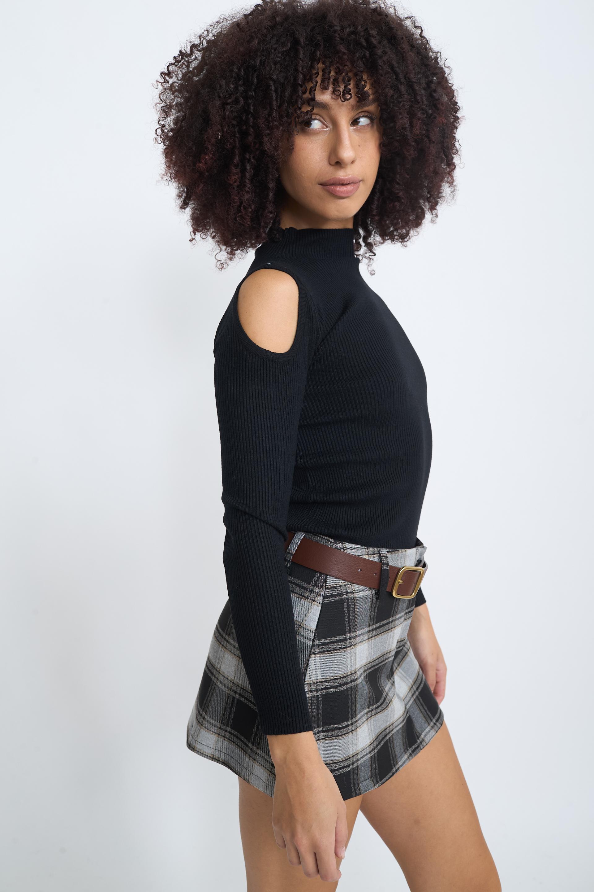 Maglia scollo vulcano a costine con cut-out sulle spalle. | ||
