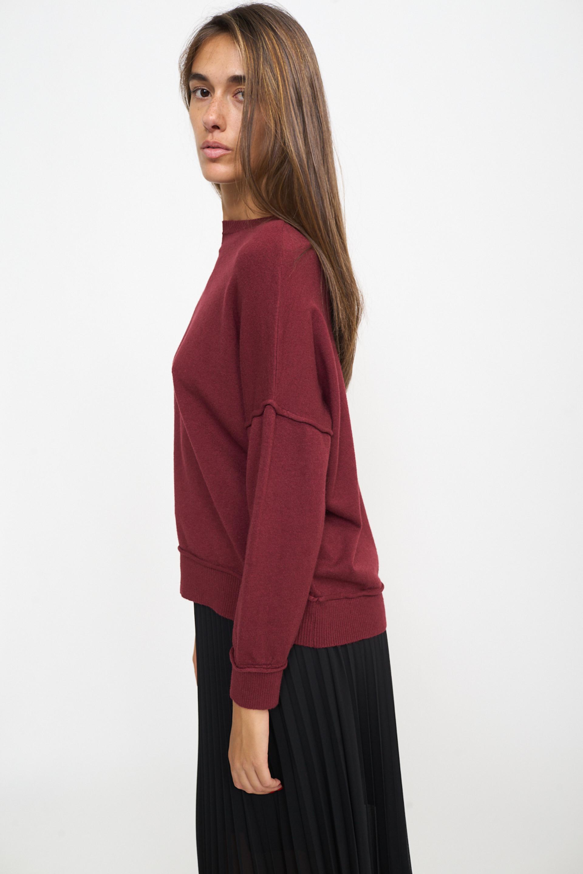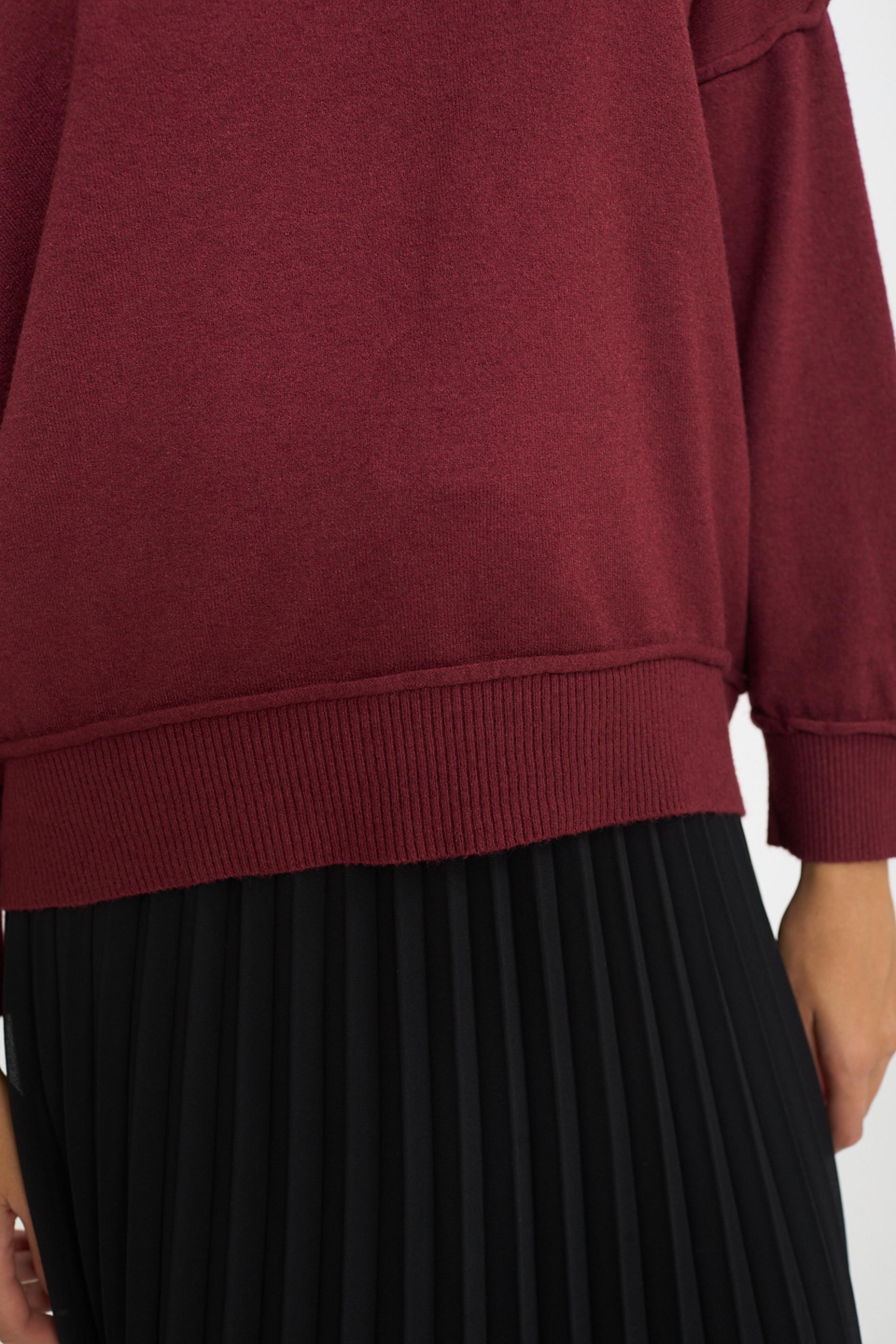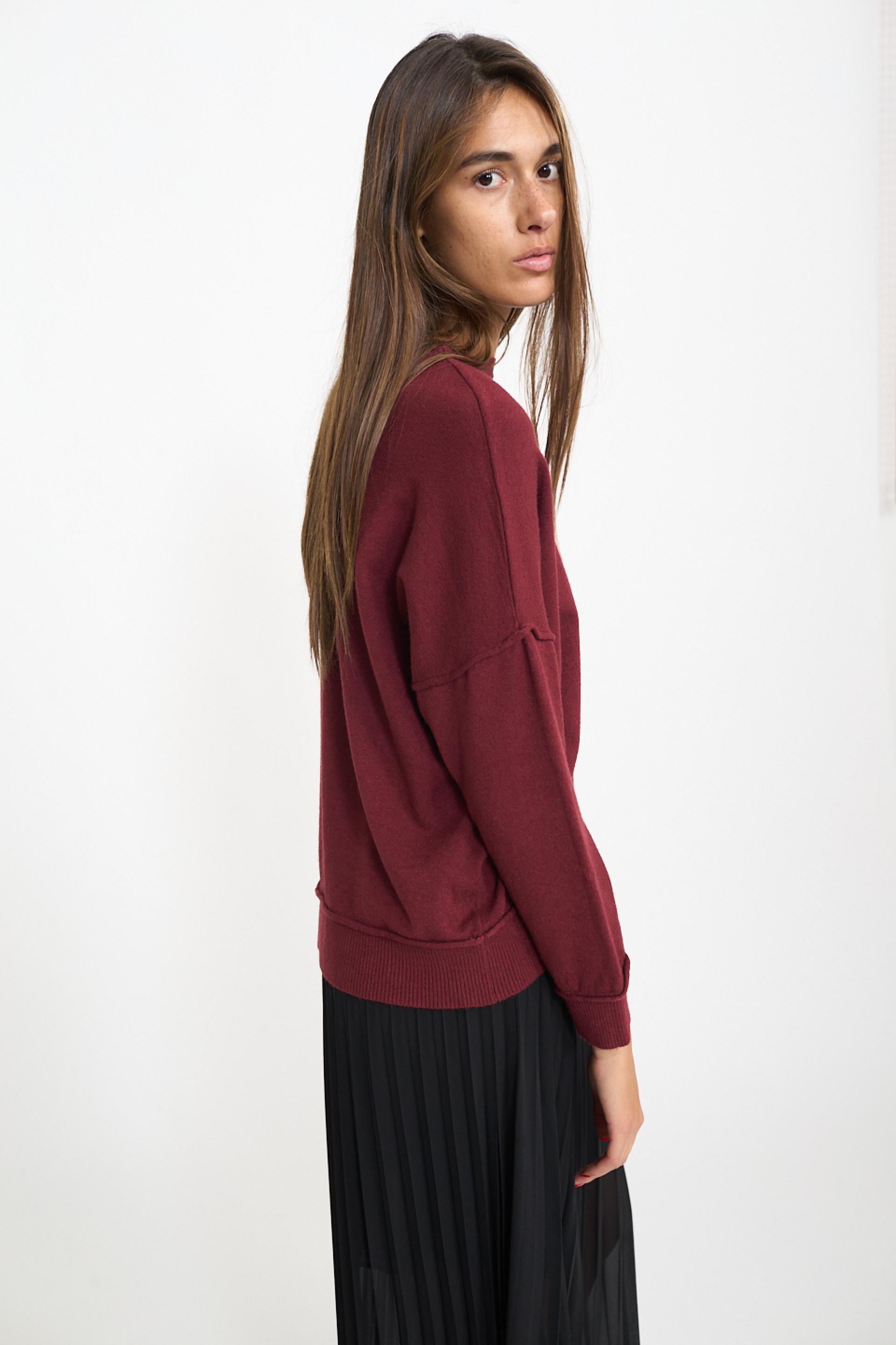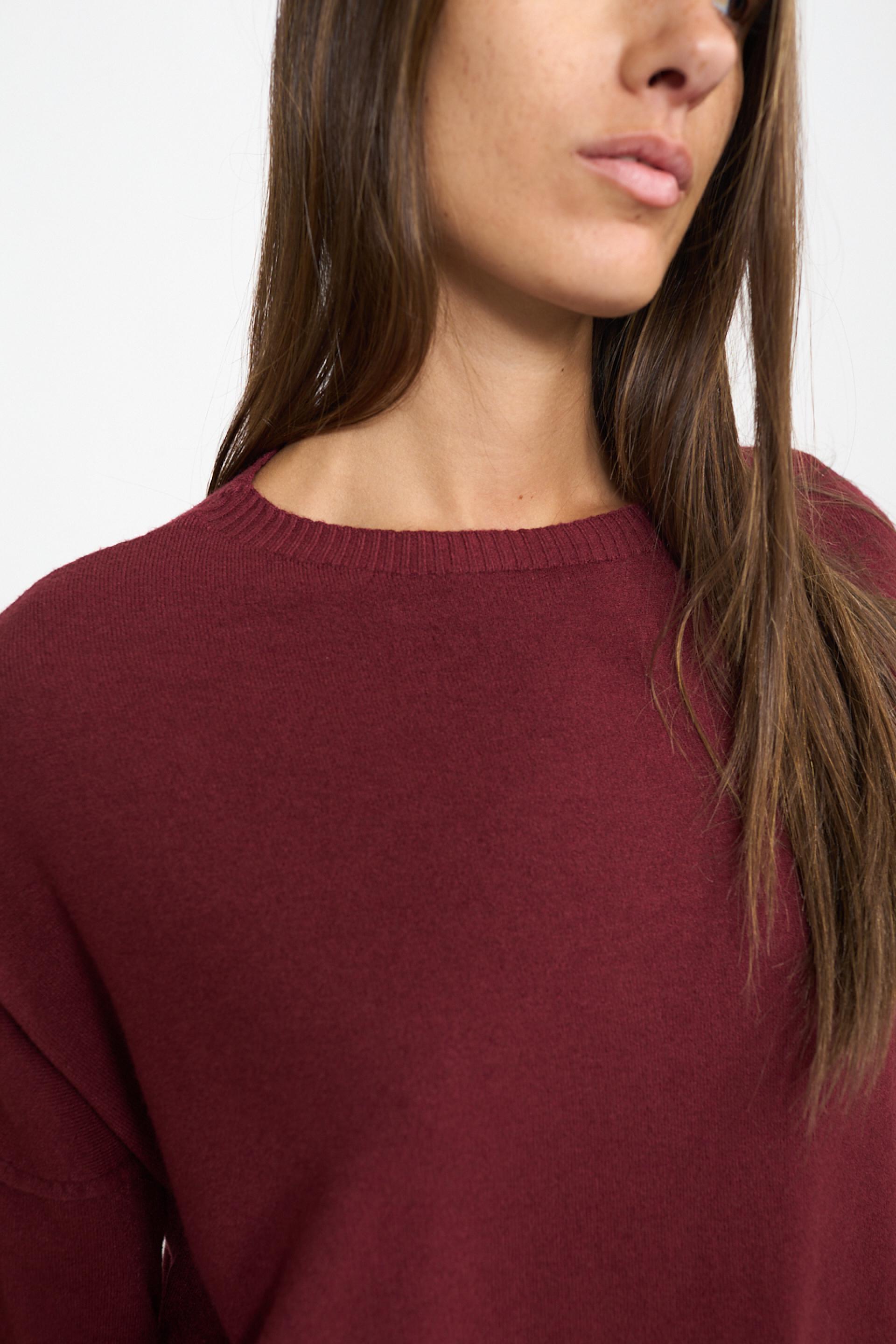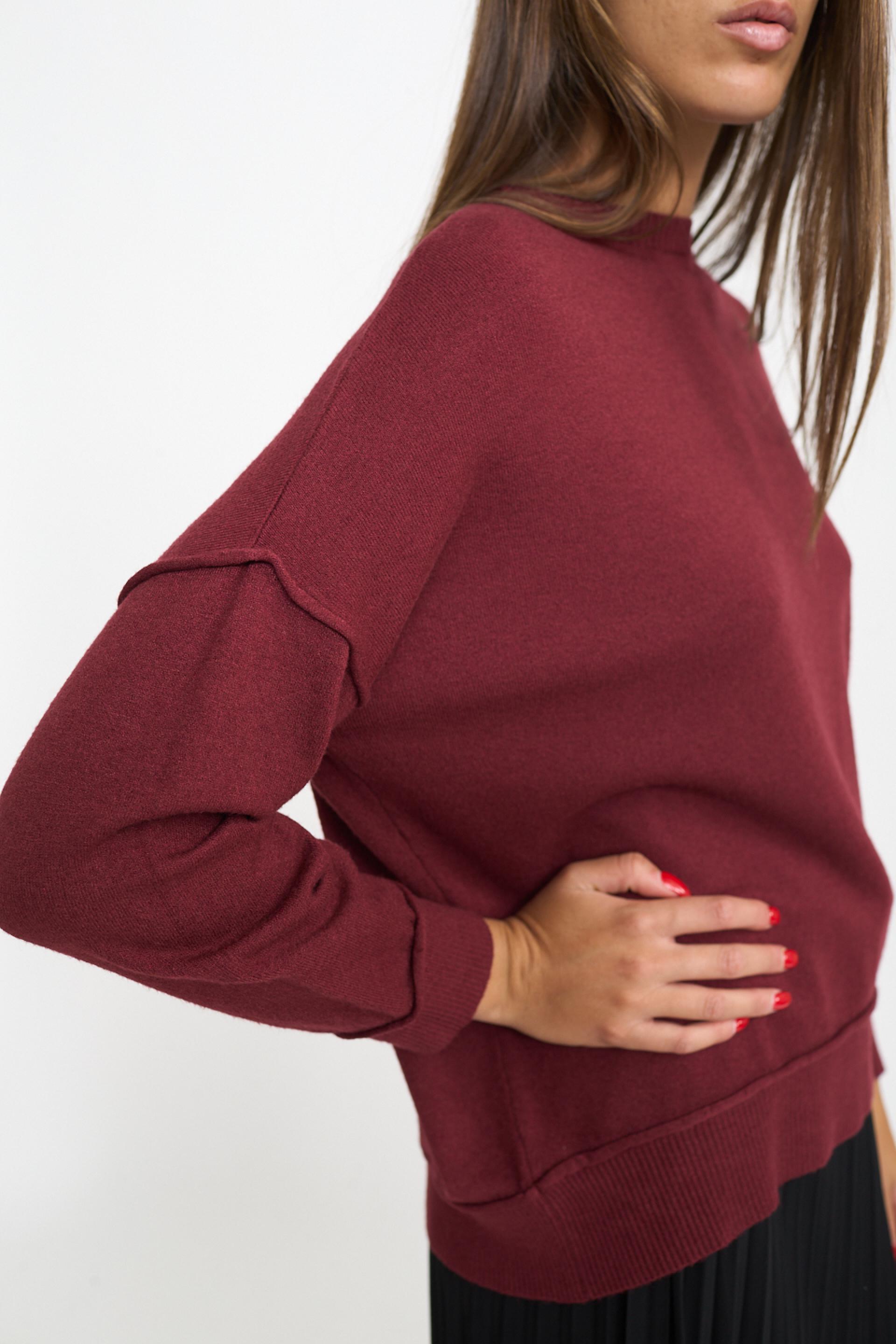 | Maglia girocollo in misto viscosa con dettaglio di rilievi in filato a metà manica e ad inizio polsini e fascia in orlo. Lavorazione a costine su scollo, polsini e fascia in orlo. | ||
