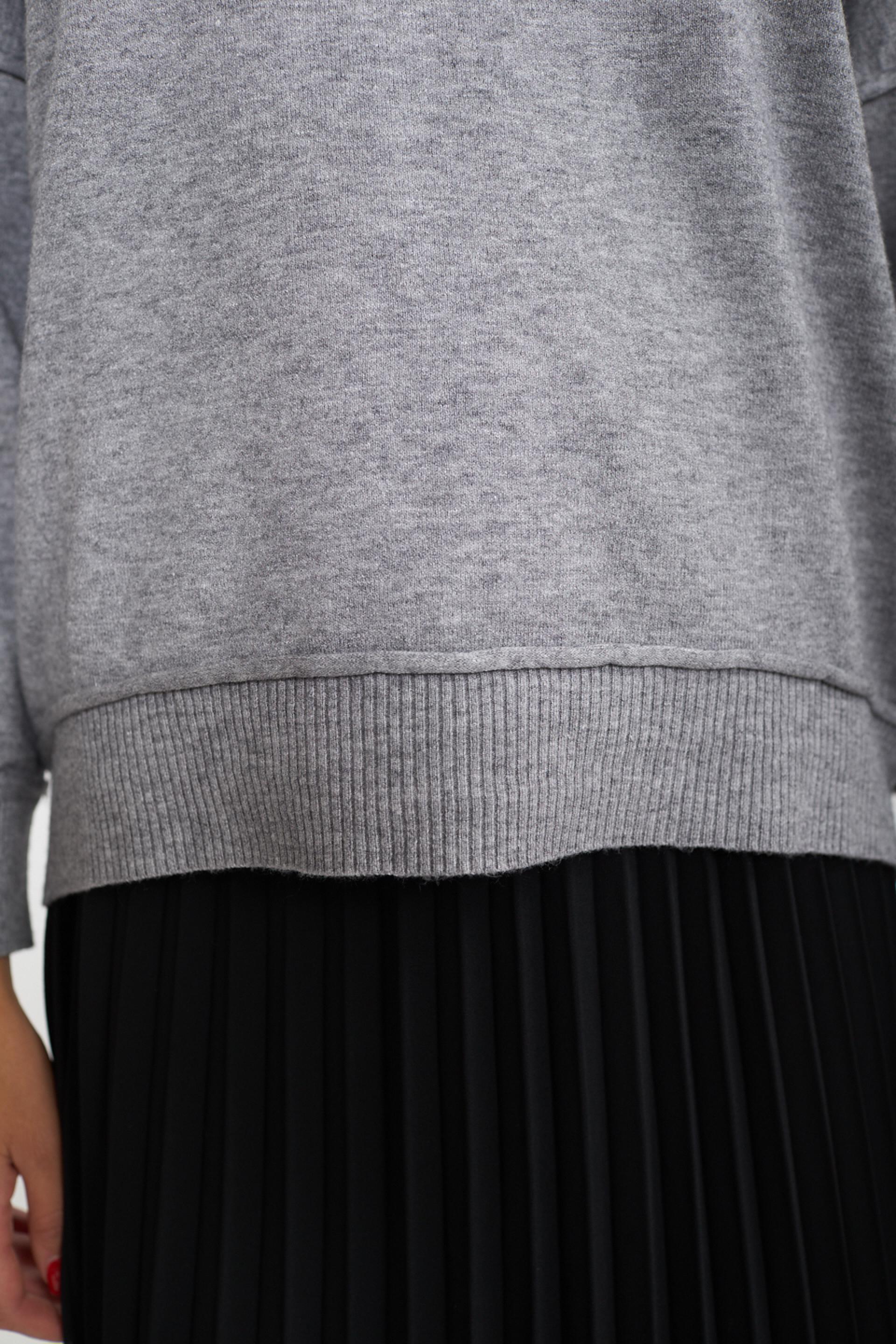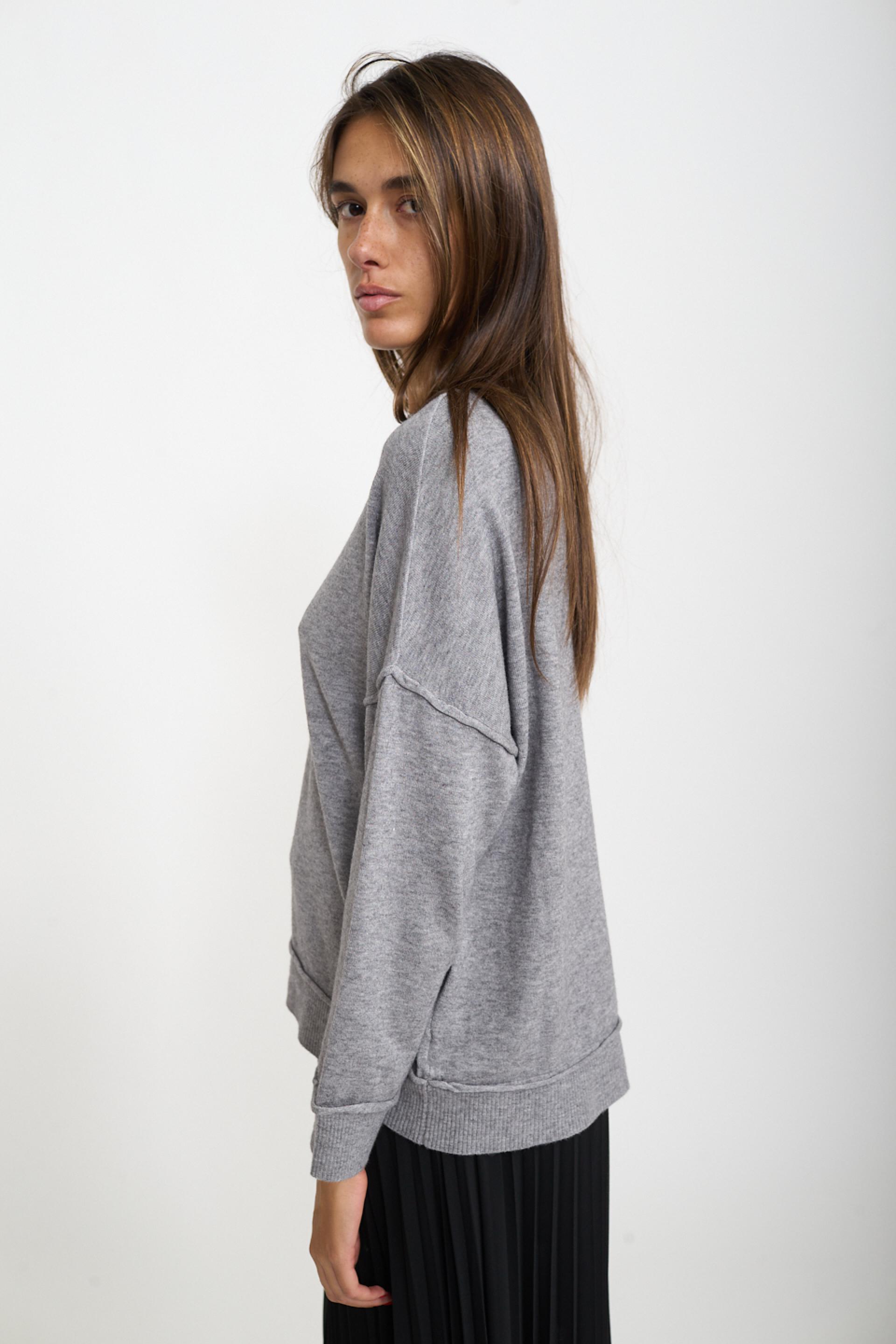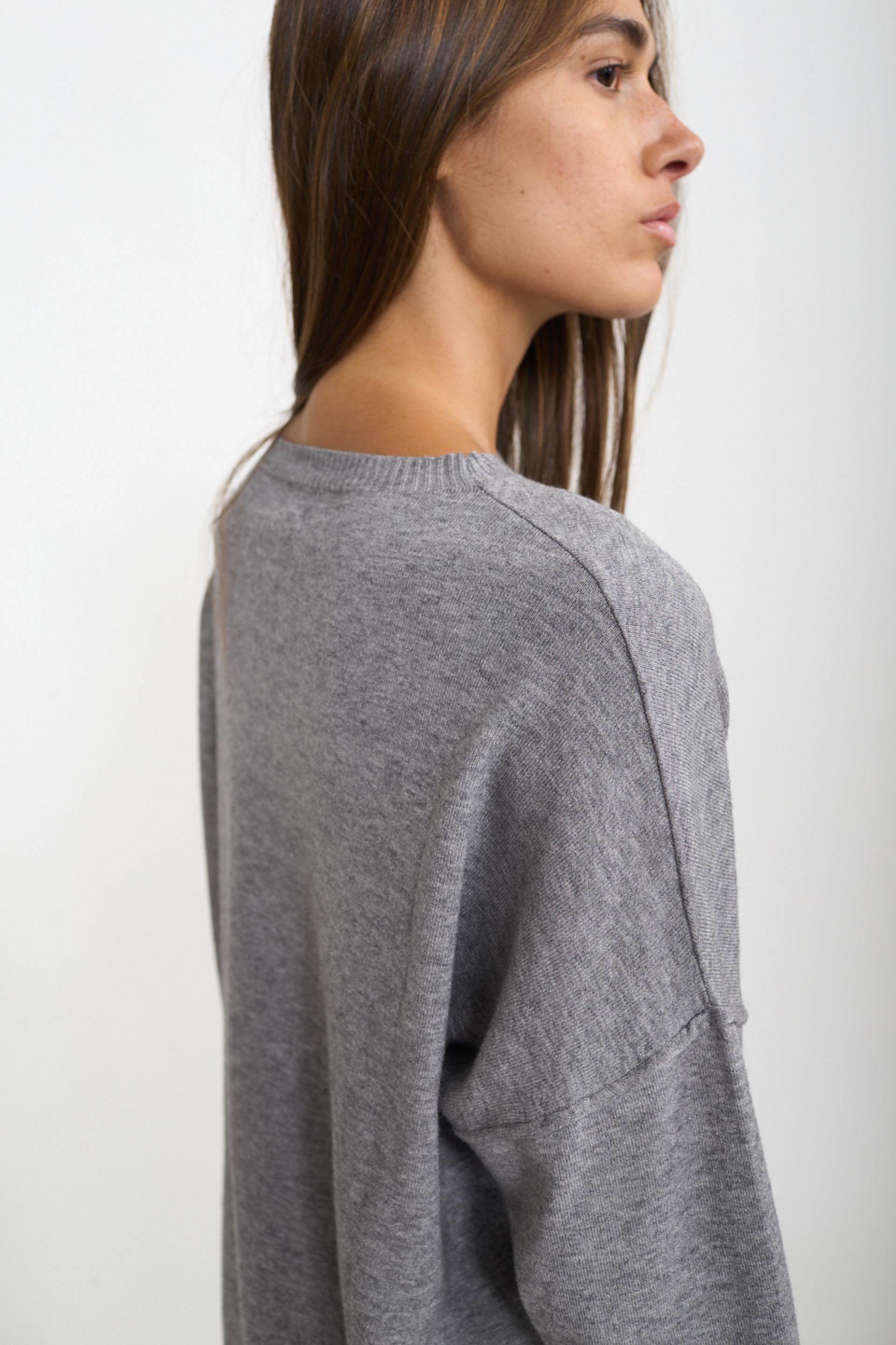 | Maglia girocollo in misto viscosa con dettaglio di rilievi in filato a metà manica e ad inizio polsini e fascia in orlo. Lavorazione a costine su scollo, polsini e fascia in orlo. | ||