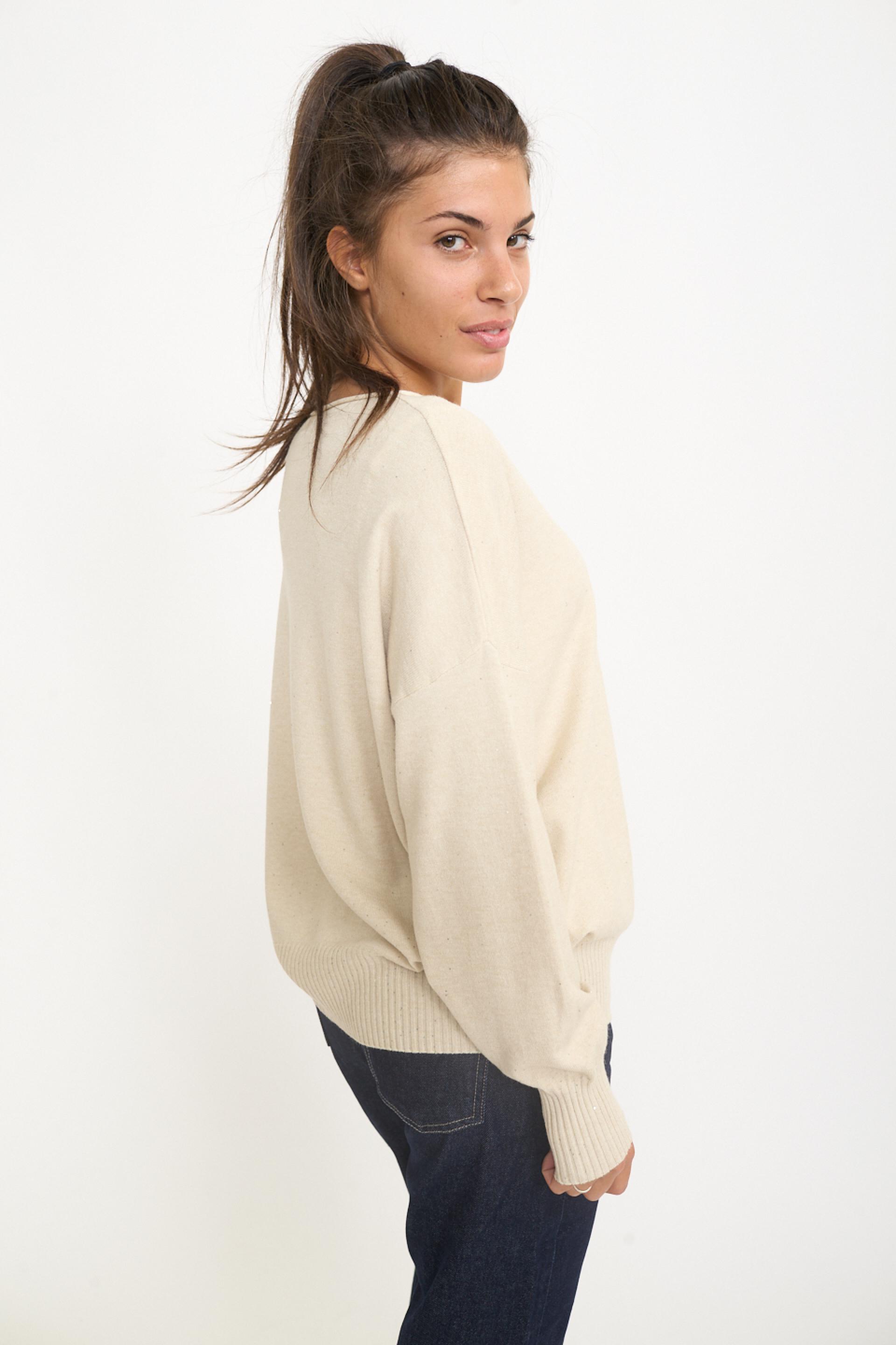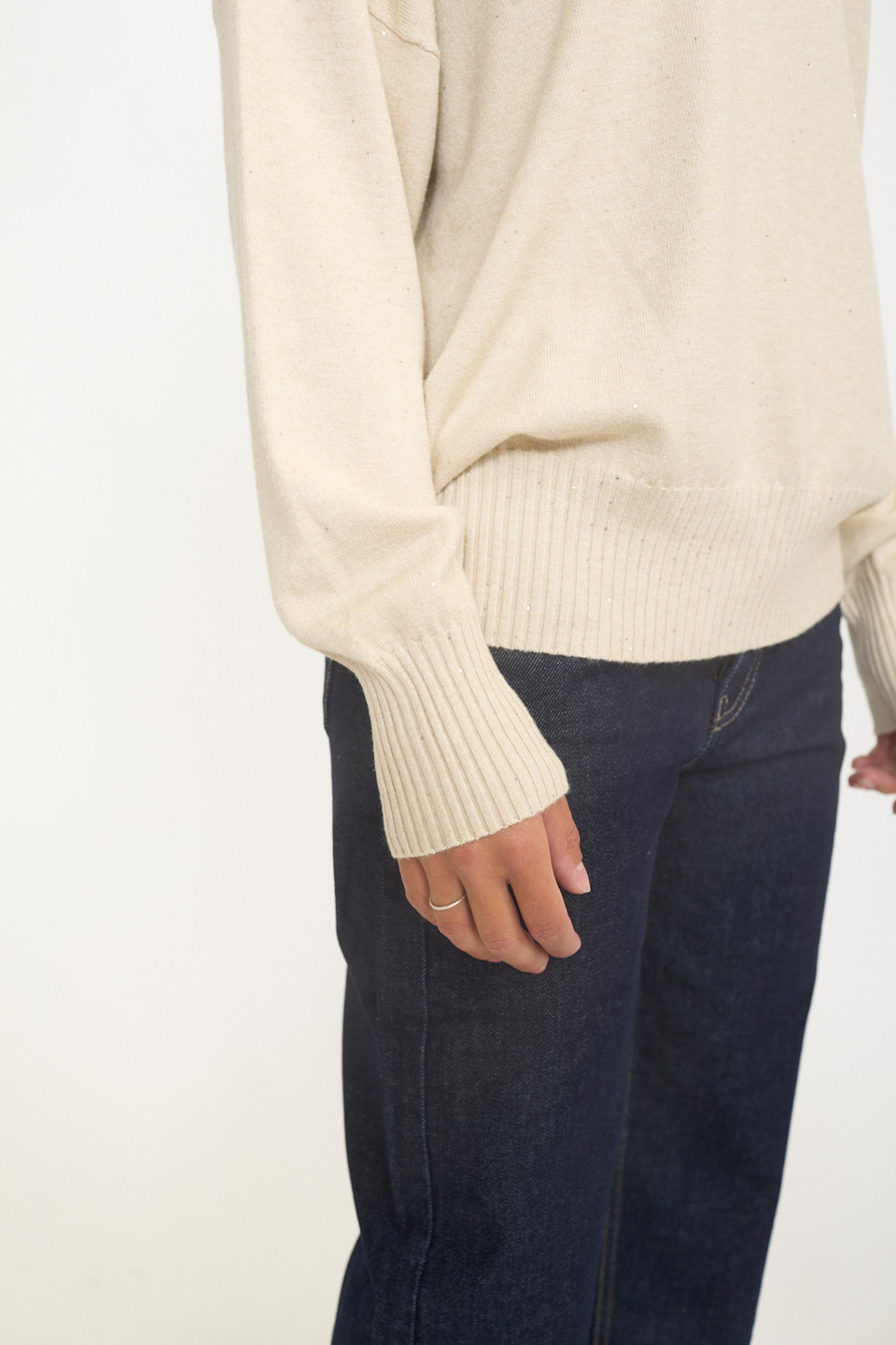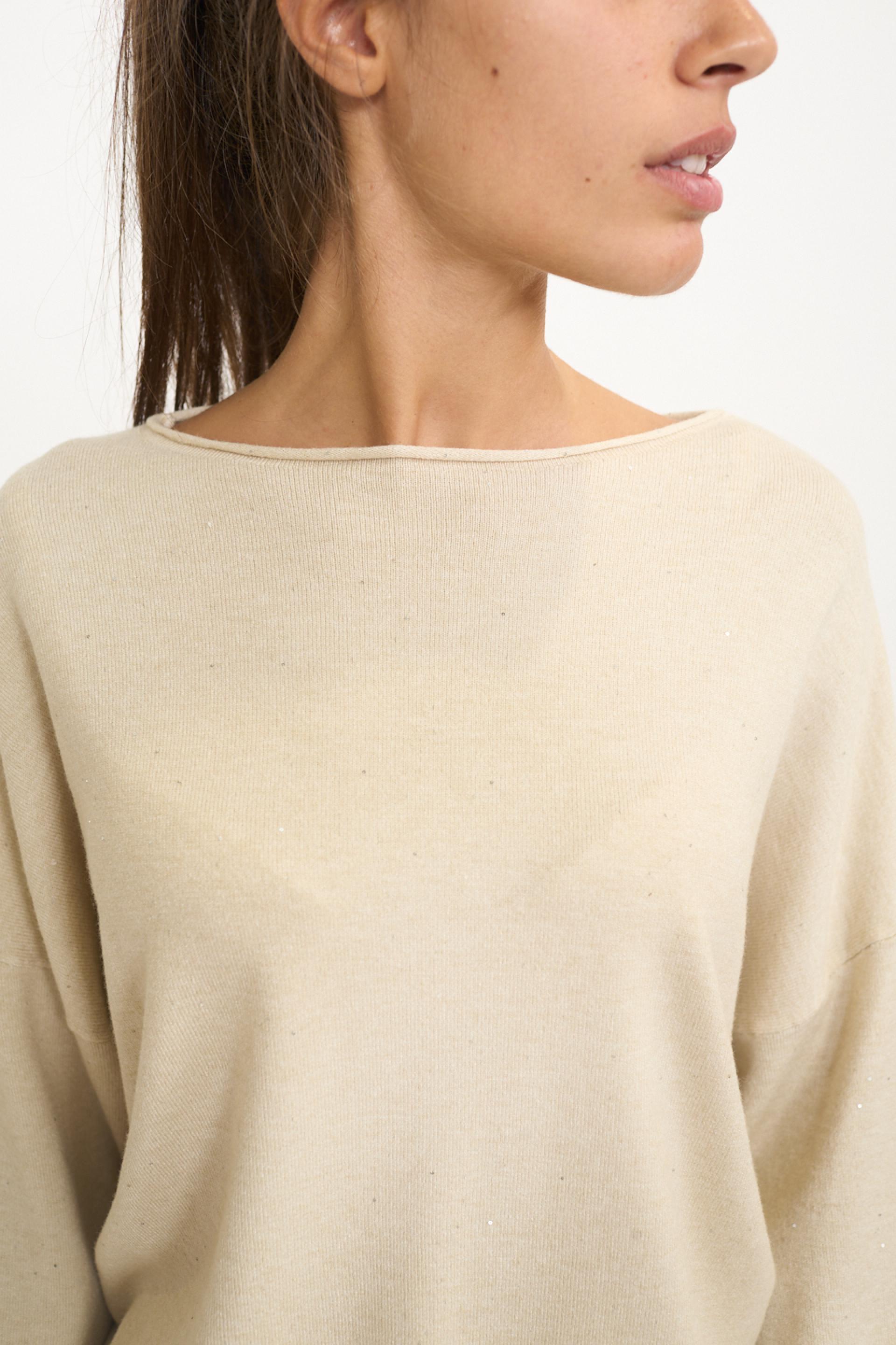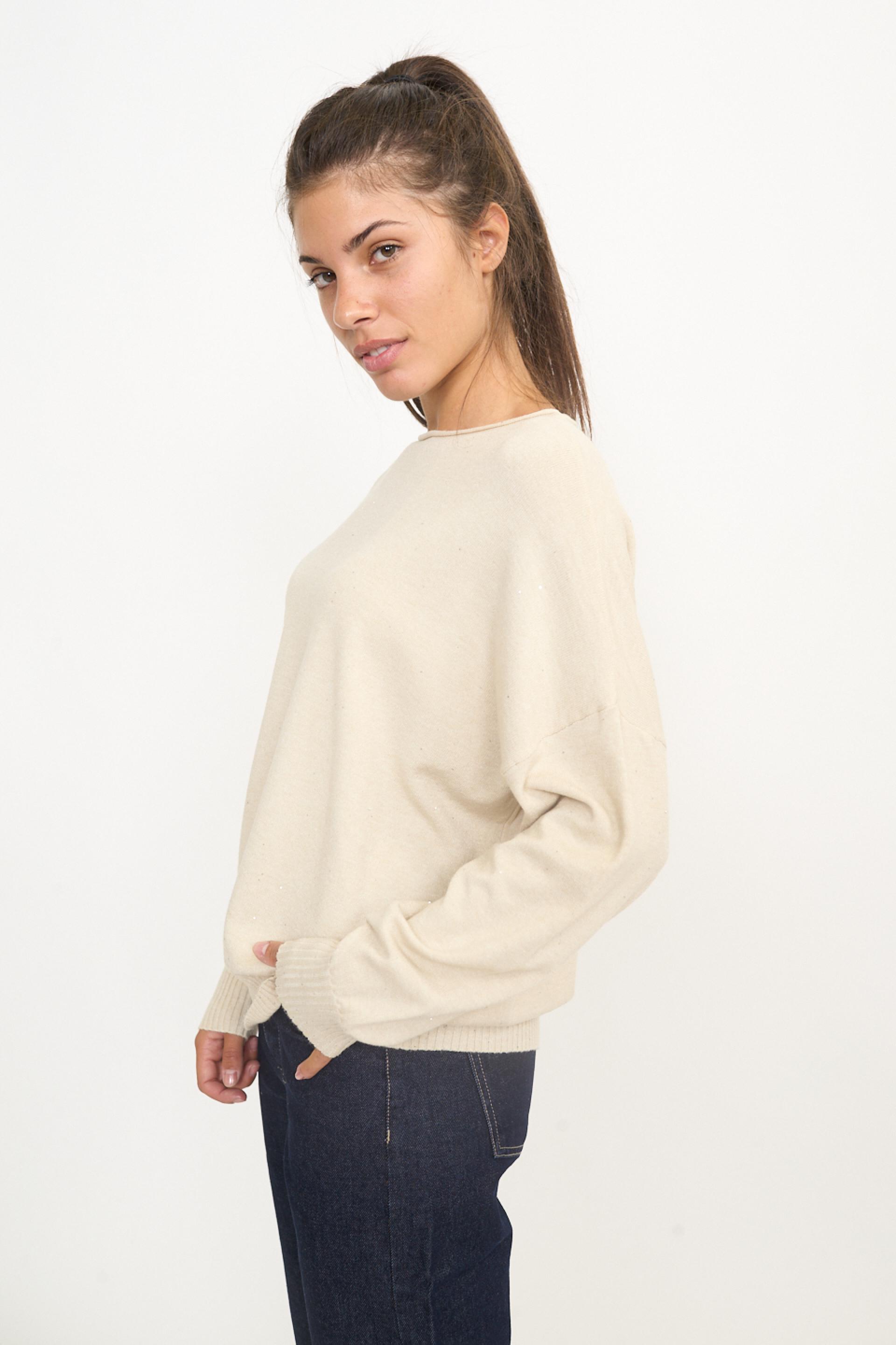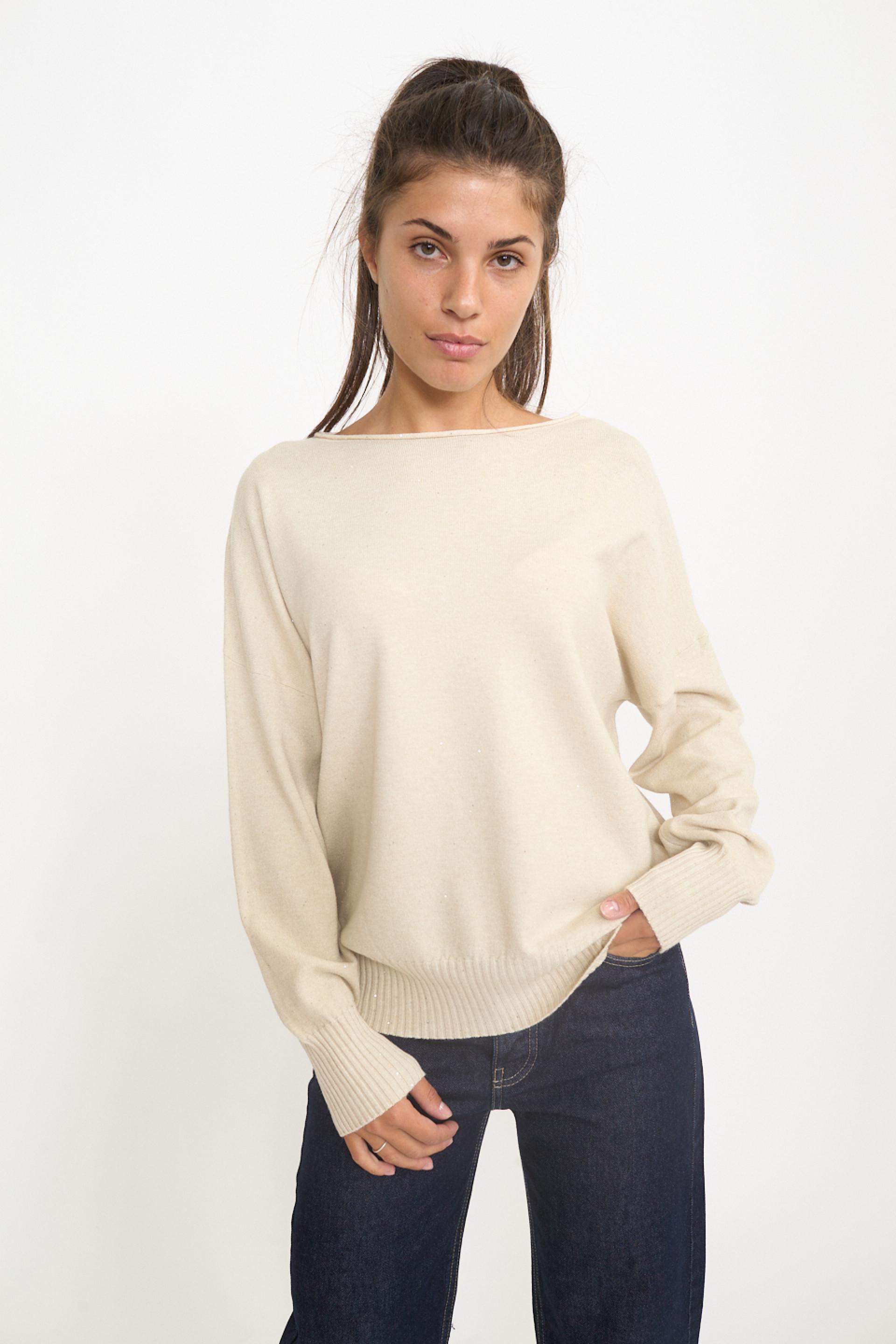 Maglia con scollo barca frullino in misto viscosa. Filato con dettaglio di paillettes e lavorazione a costine su polsini e orlo. | ||