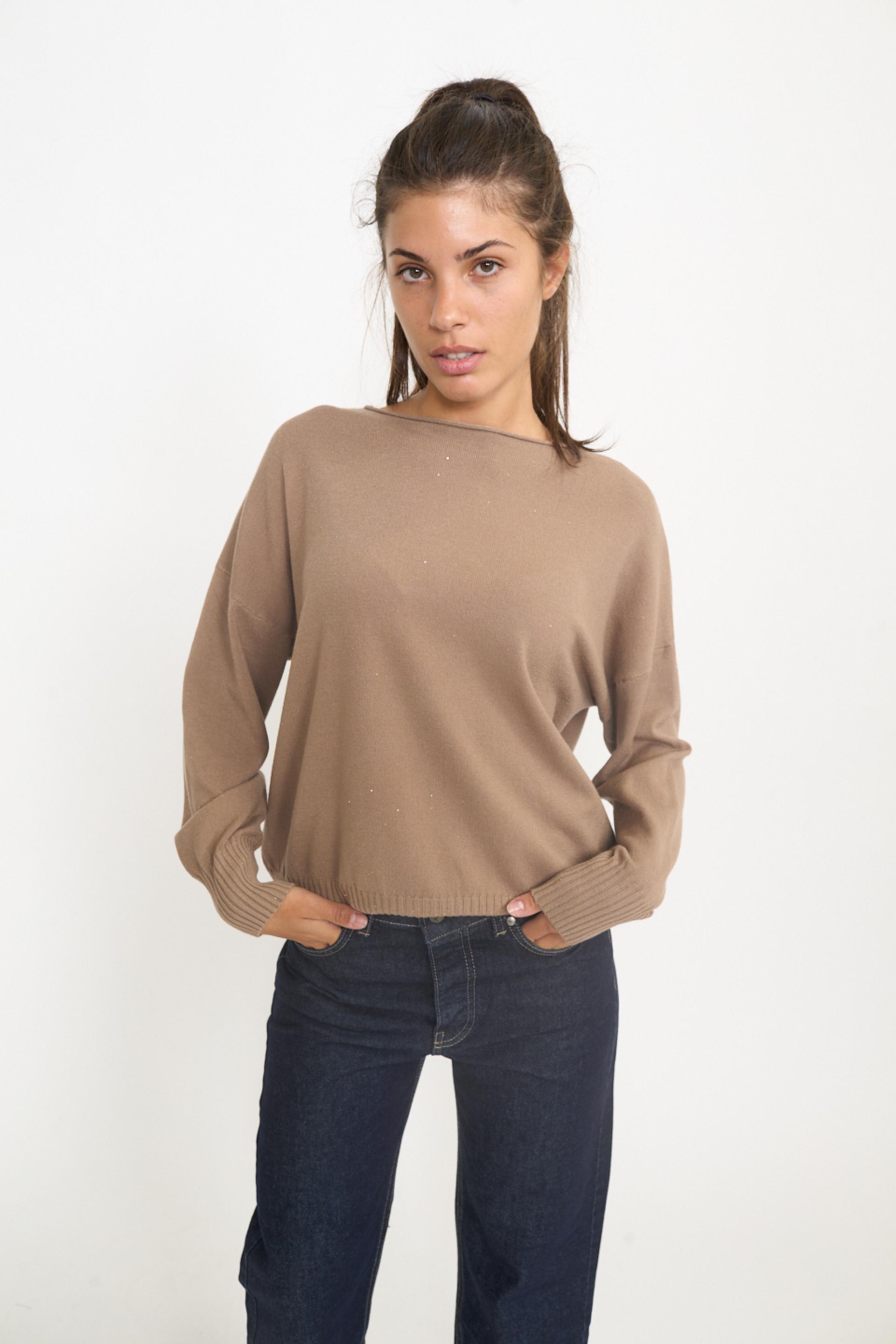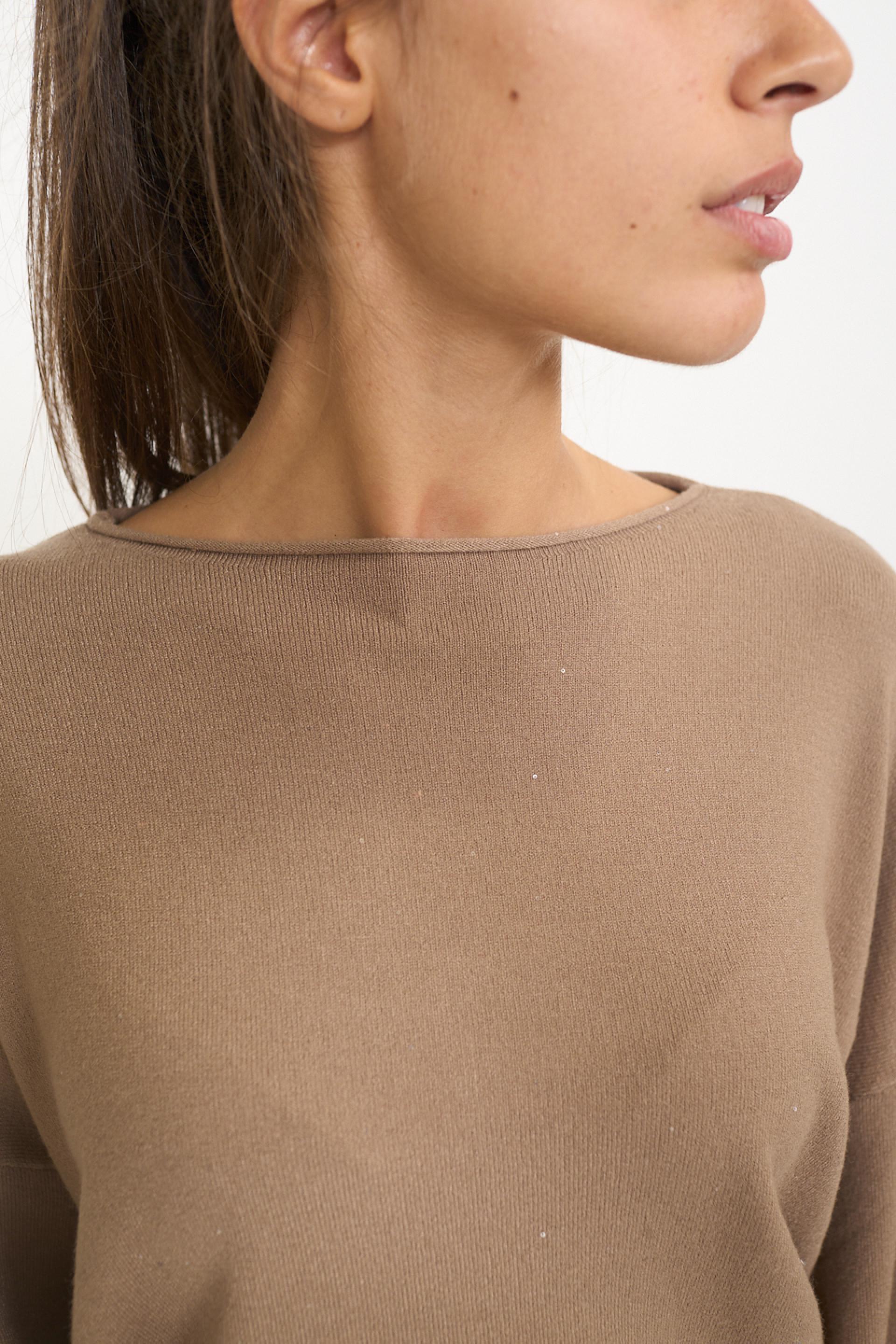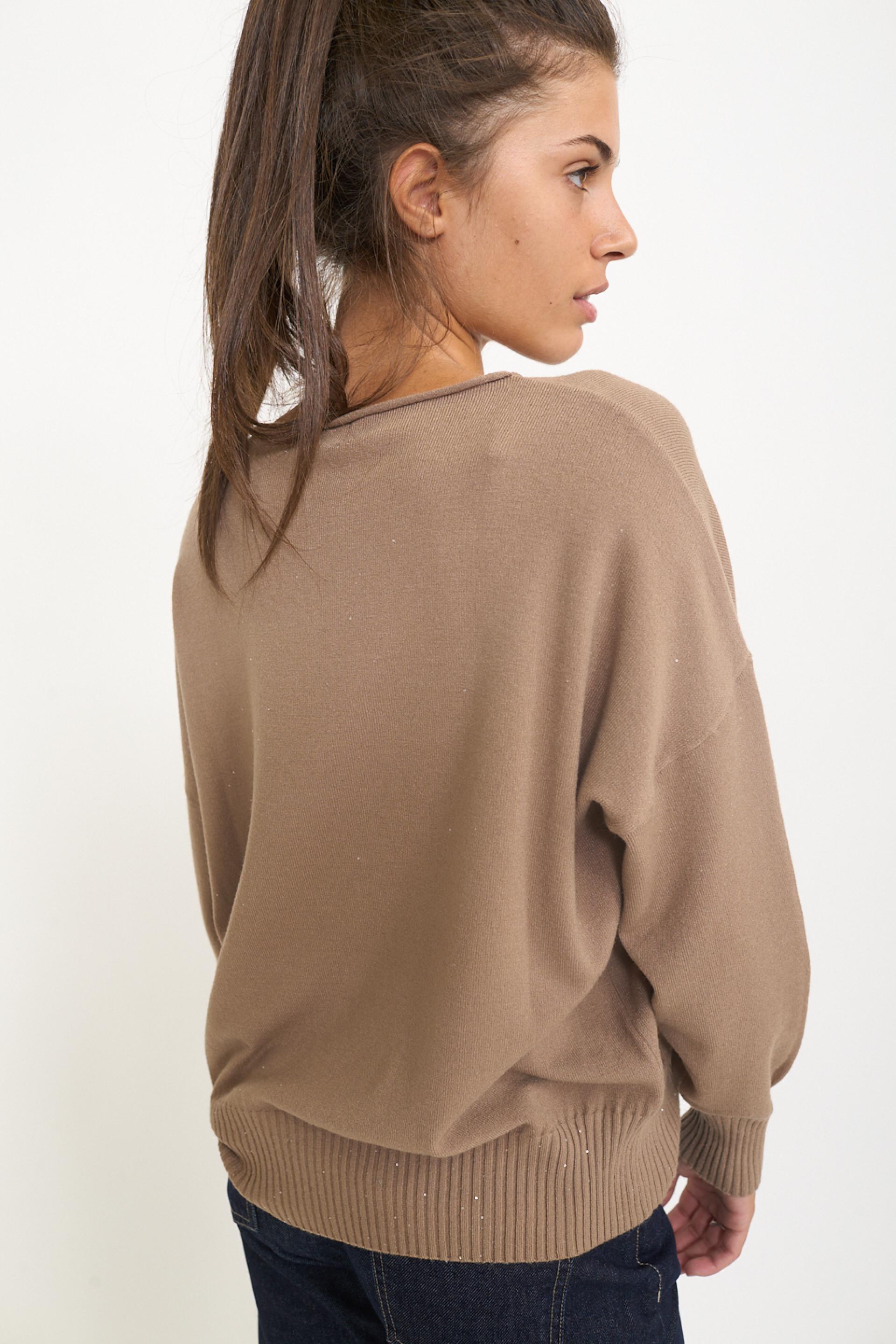 Maglia con scollo barca frullino in misto viscosa. Filato con dettaglio di paillettes e lavorazione a costine su polsini e orlo. | ||